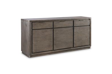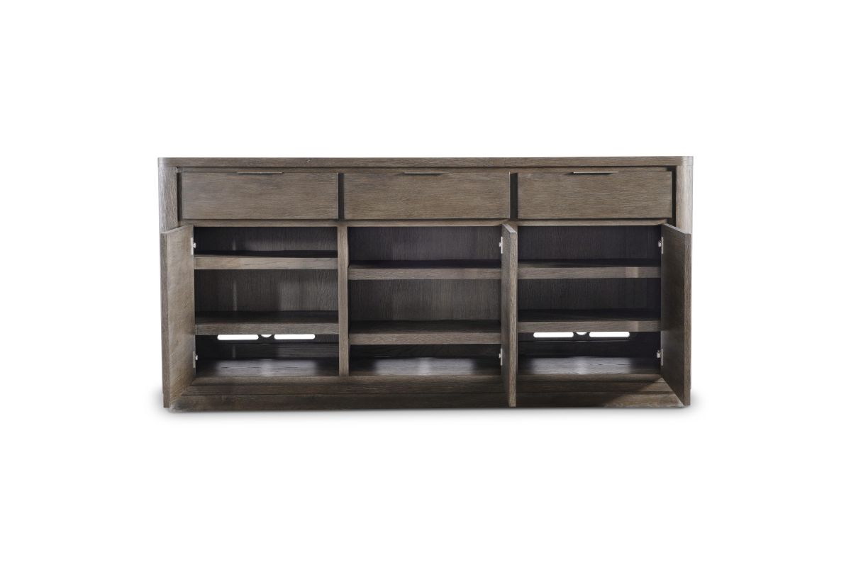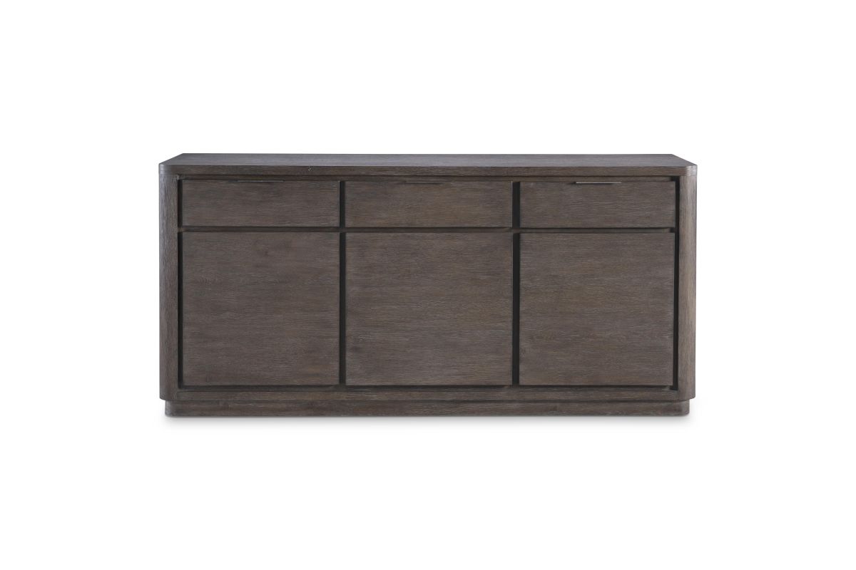 The Outline buffet defines a new look for modern minimalism. Three drawers and three doors in Cassel finish have a dimensional look against a recessed backdrop, highlighted with textured metal pulls. Corners are rounded, and lines are streamlined for a seamless sophisticated look.