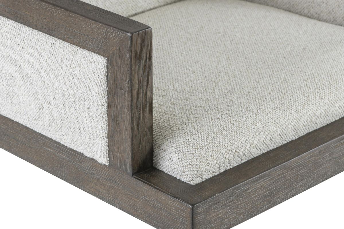 - Upholstered inback, outback, seat and inset panel on arms, framed in wire-brushed oak in Cassel finish