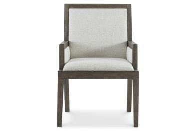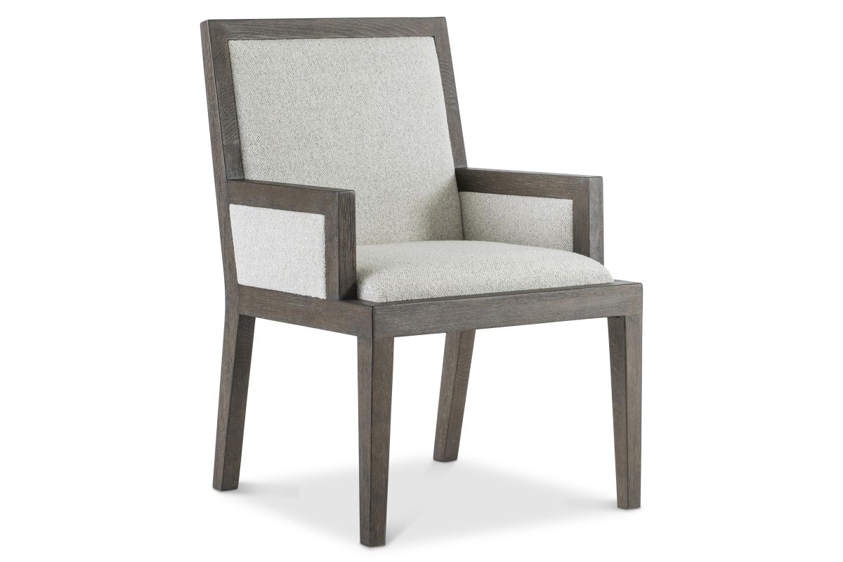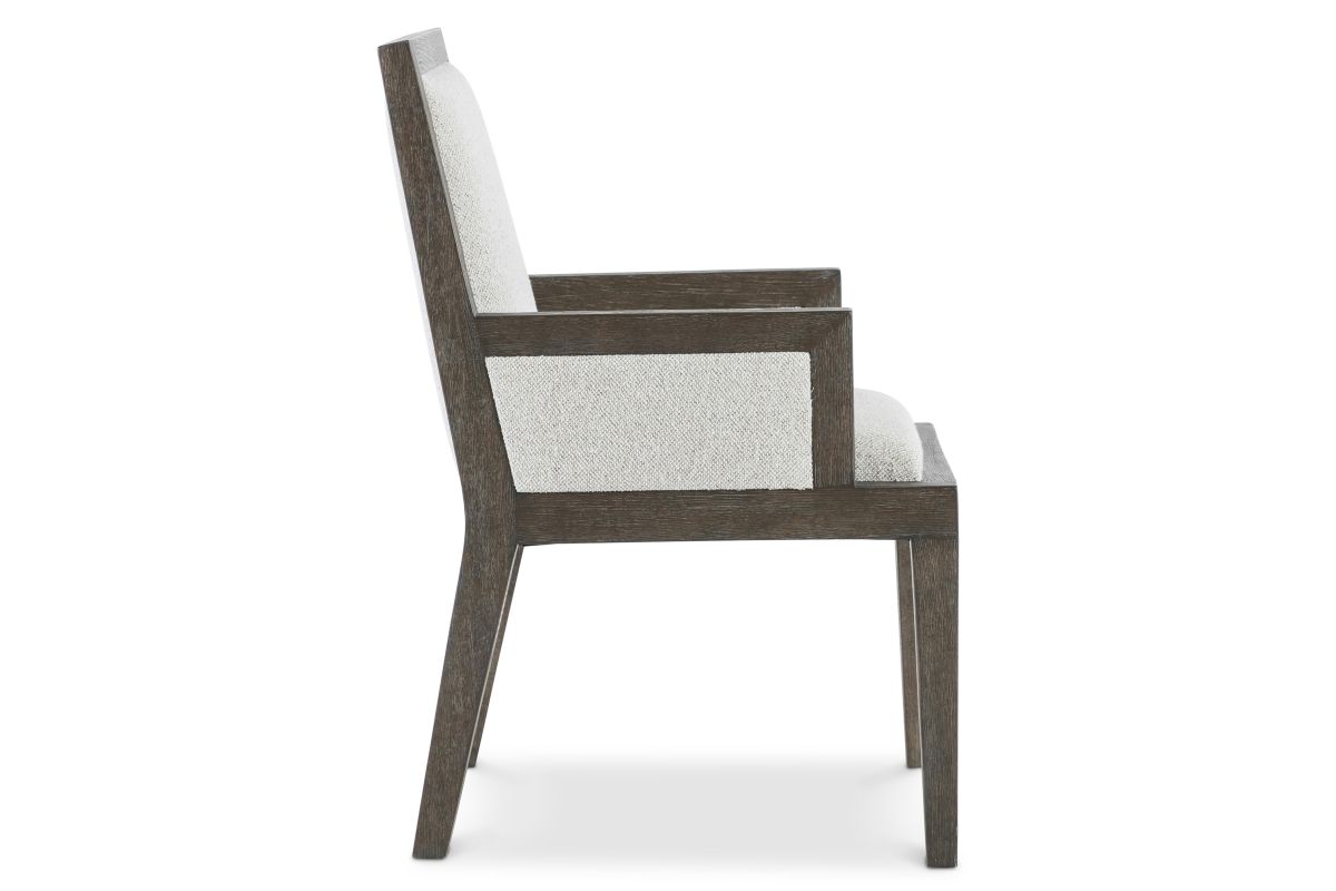The Outline arm chair defines a modernist style with an exposed wood frame that contrasts with upholstered panels. The textural Cassel wood finish offers a casual accent to the sophisticated design.