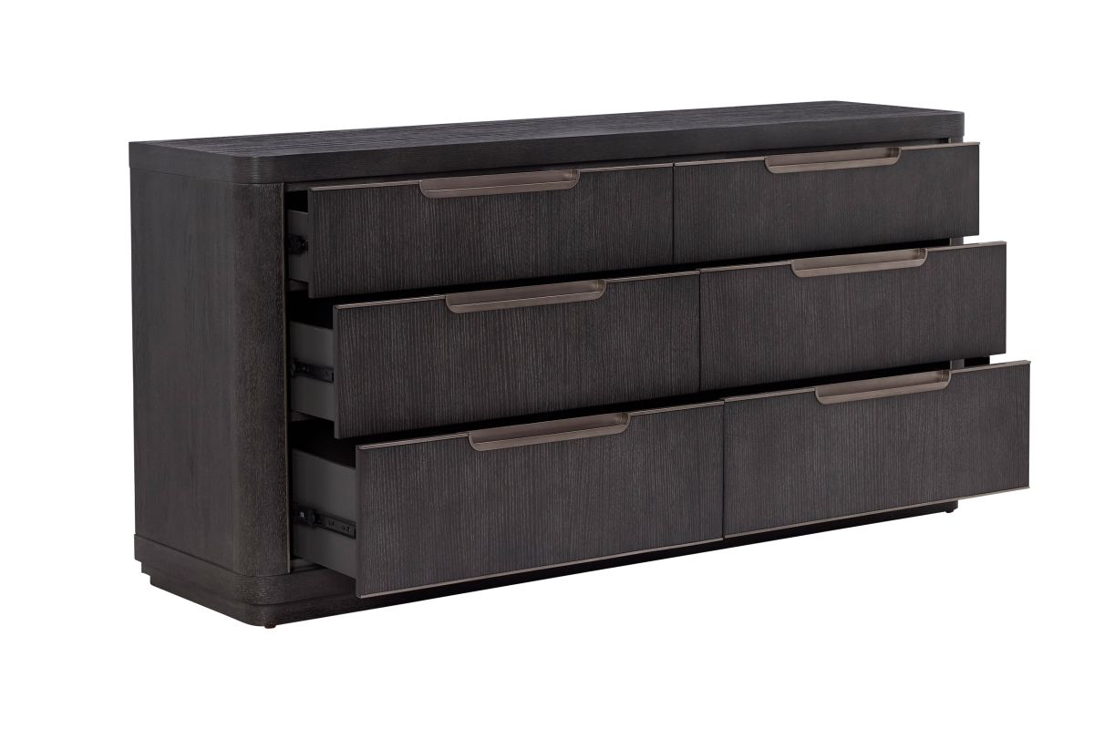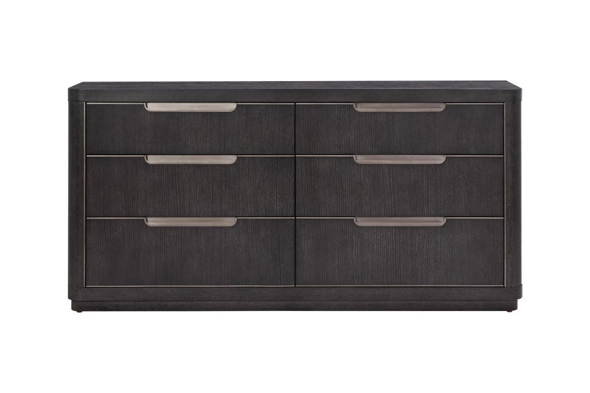 Elevate your bedroom with the refined elegance of this Preston Heights 6-drawer dresser where modern design meets timeless detail. Crafted with softened edges for a smooth, inviting silhouette, this piece features subtly bronzed tone hardware and raised metal trim that adds just the right touch of contemporary sophistication.