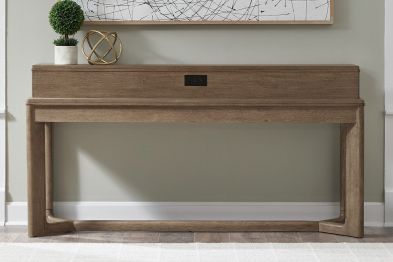 The Ballentine console bar table is a masterpiece of design that transforms your living space into an oasis of style and functionality. Crafted with excellence using Rubberwood solids and Quartered Cut White Oak veneers, this piece features a Weathered Bronze finish. The softly rounded oblong legs create an immediate sense of elegance, flowing seamlessly to a uniquely shaped center trestle. This distinctive design element not only adds an artistic touch but also establishes the table as a focal point in your space, marrying form and function seamlessly. This console bar table takes innovation to the next level with a built-in charging station. Harness the convenience of technology with 2 AC outlets, 1 USB-A port, and 1 USB-C port. This integrated feature ensures that your devices remain powered and within reach, effortlessly combining the demands of the digital age with timeless design. Form and function coexist seamlessly with the Ballentine console bar table.