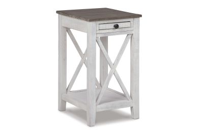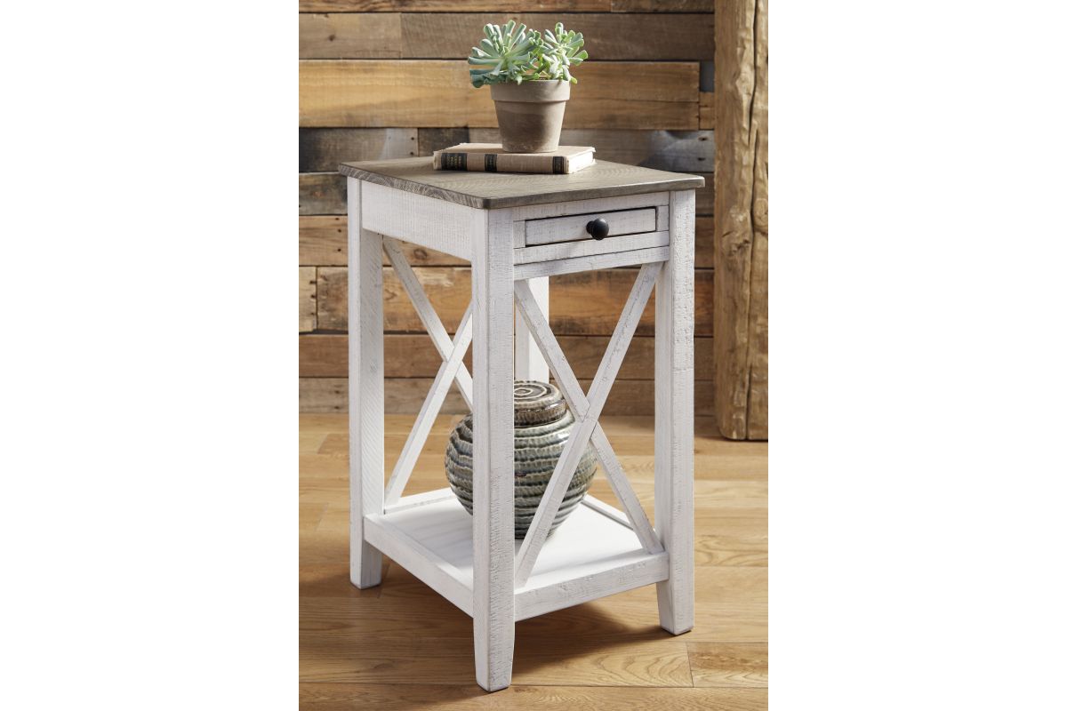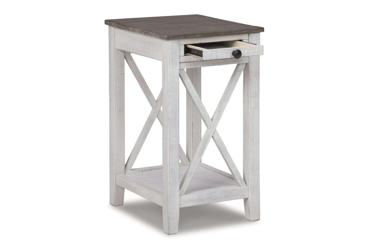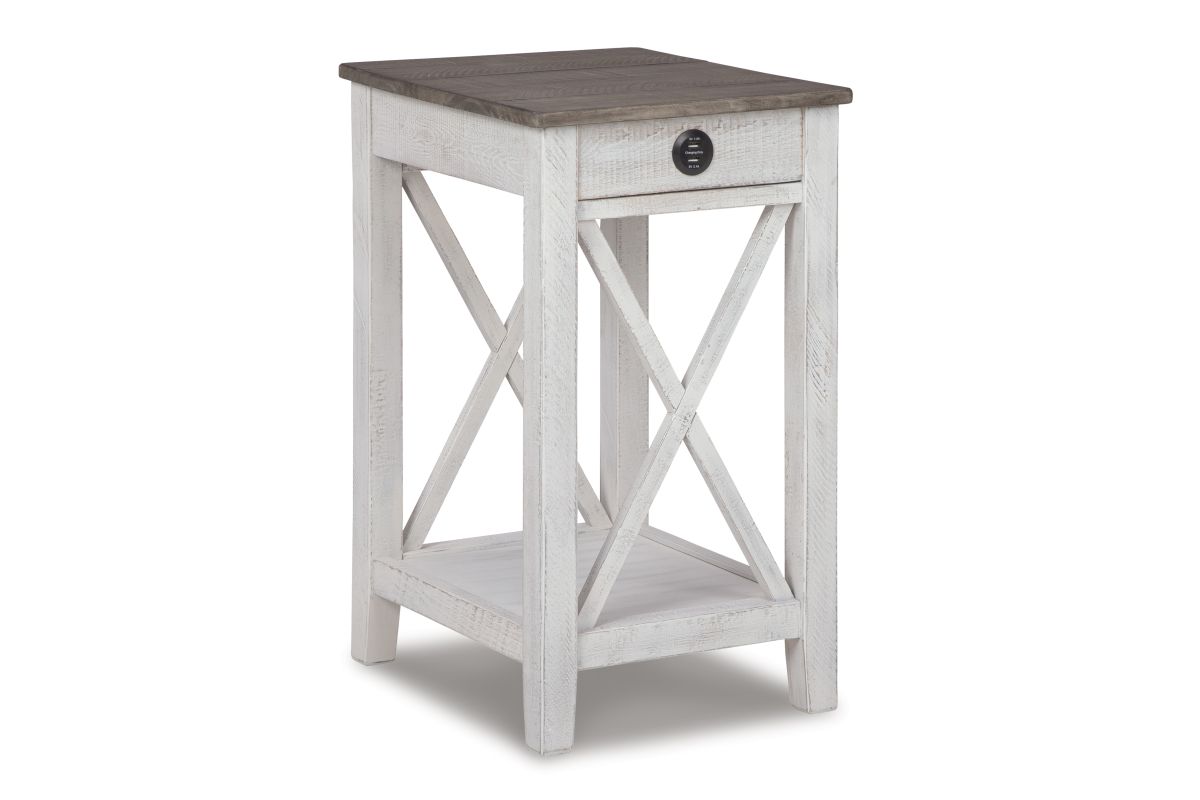 Modern meets vintage in this accent table. Made of wood, it creates a vintage vibe with a distressed white and gray finish and crossbuck supports on two sides. Two USB charging ports add modern function. This is a must-have piece for your living space.