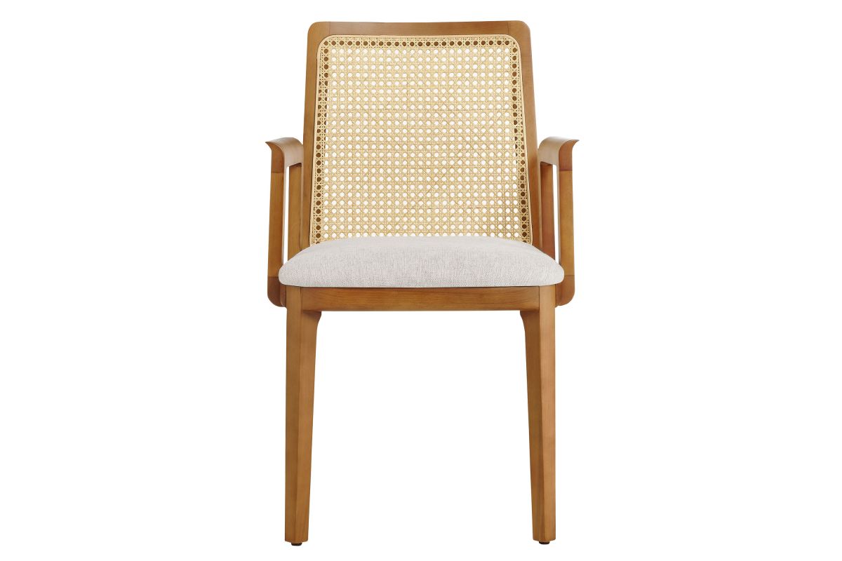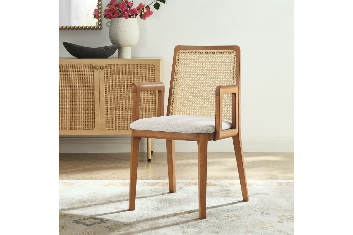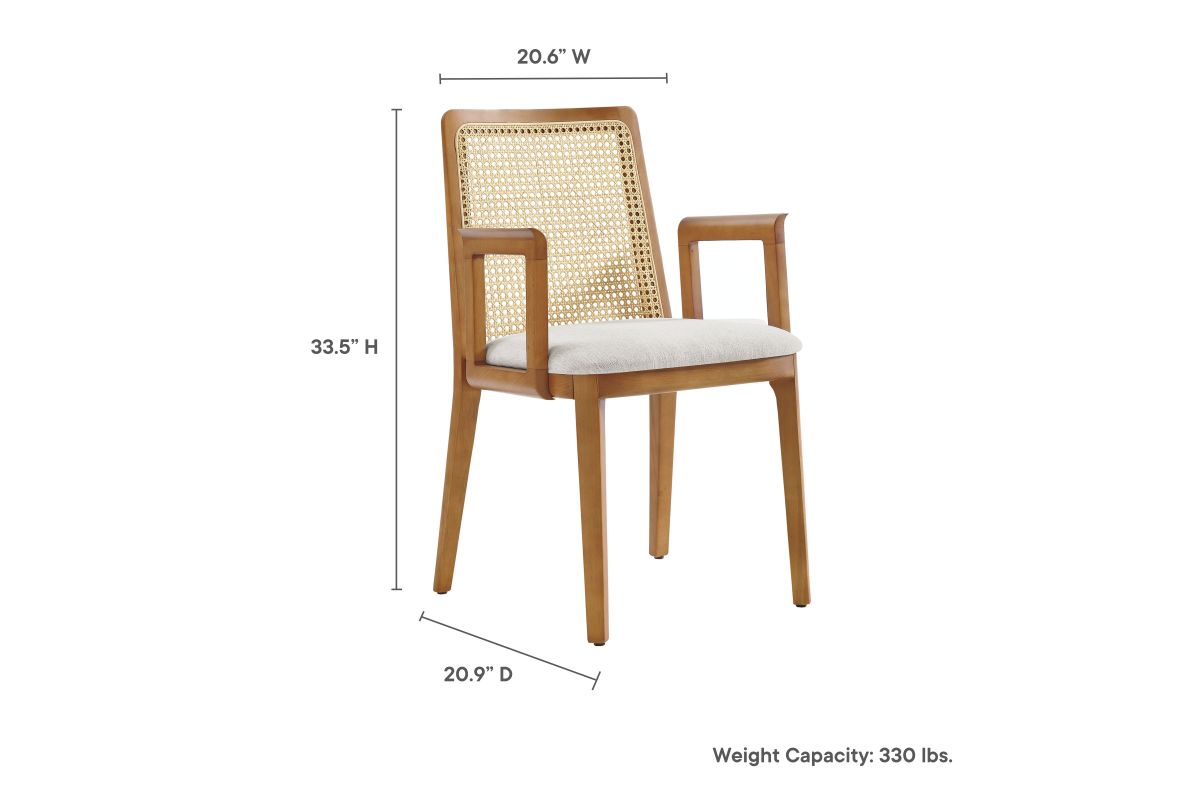 Elevate your dining space with the Monarch Dining Armchair, a stunning blend of French country elegance and modern farmhouse style. This wood dining room chair features a sturdy beech wood frame and a rattan backrest with intricate cane webbing, granting both style and durability. The dense foam padded seat, covered in soft fabric upholstery, provides lasting comfort, making it a comfortable fabric accent chair perfect for longer meals. Designed as a comfortable dining chair with armrests, Monarch offers versatile placement around a dining table, in a living room, or in an office space. Whether used as a rattan back dining chair with arms or as a cane accent chair, it enhances your dining experience with its refined aesthetic and protects floors with its non-marking floor glides. This farmhouse cane back dining armchair fits seamlessly into any decor, making it perfect for both formal dinners and casual family meals. The Monarch Farmhouse Dining Armchair combines traditional craftsmanship with contemporary style, making it a versatile wood dining accent chair with a cane back for your dining room. Weight Capacity: 330 lbs.