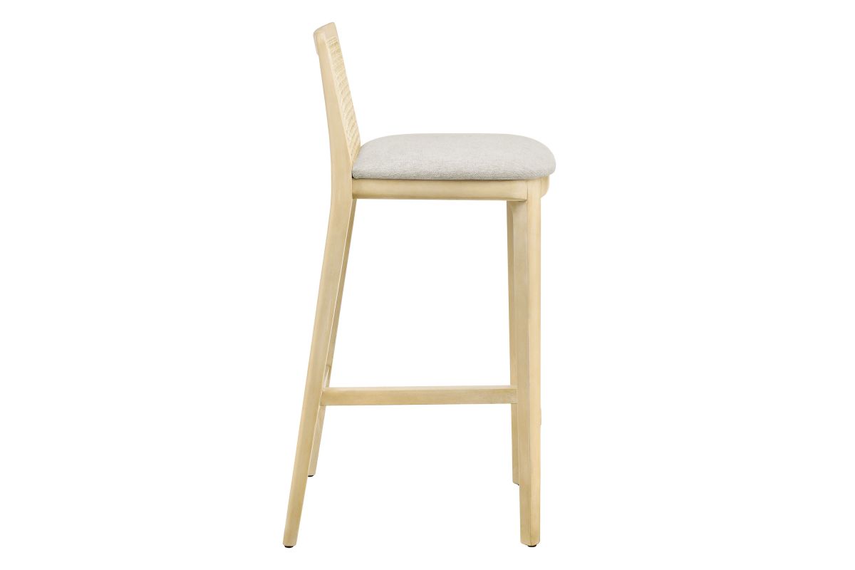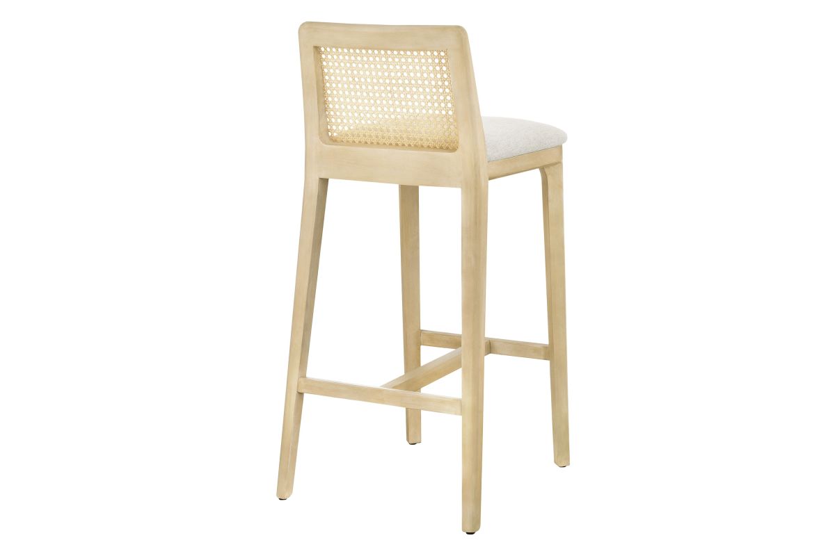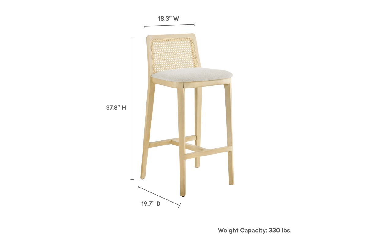 Elevate your kitchen or home bar with the Monarch Bar Stool, a stunning blend of French country elegance and modern farmhouse style. This wooden barstool features a sturdy beech wood frame and a rattan backrest with intricate cane webbing, granting both style and durability. The dense foam padded seat, covered in soft fabric upholstery, provides lasting comfort, making it a comfortable padded bar stool perfect for longer gatherings. Designed as a modern bar-height stool, Monarch offers versatile placement around a bartop or bar-height table. Whether used as a single cane back bar stool or as a farmhouse accent stool, it enhances your dining experience with its refined aesthetic and protects floors with its non-marking floor glides. This cane bar stool fits seamlessly into any decor, making it perfect for both formal gatherings and casual meals. The Monarch Bar Stool combines traditional craftsmanship with contemporary style, making it a versatile wood rattan barstool with natural cane mesh for your home bar or kitchen. Weight Capacity: 330 lbs.