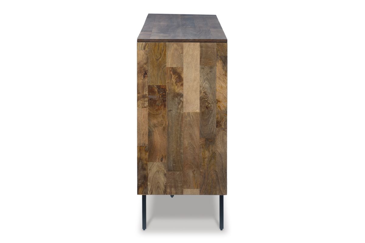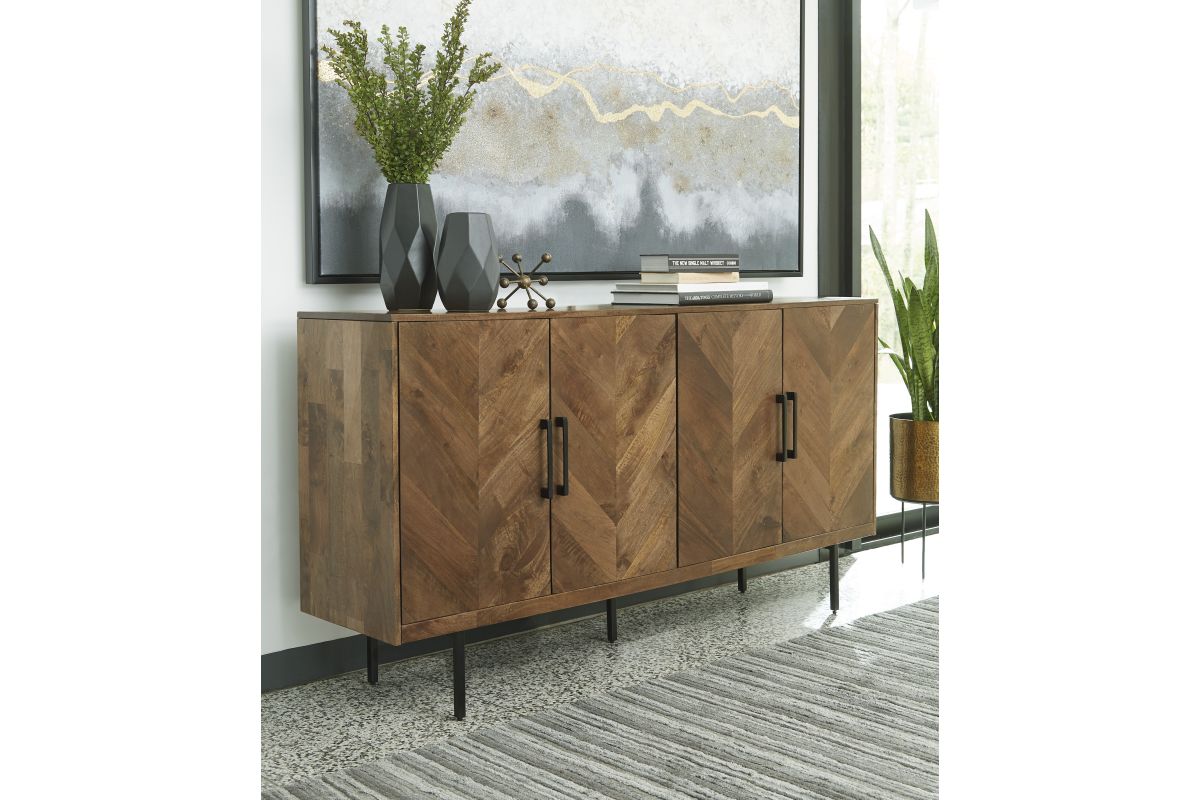 Storage options abound with this accent cabinet featuring 4 chevron pattern doors accented by long dark gray finished metal door pulls. Store dinnerware, cookbooks and many other options within the sideboard which features 2 fixed shelves. The light brown finish will complement virtually any room decor.