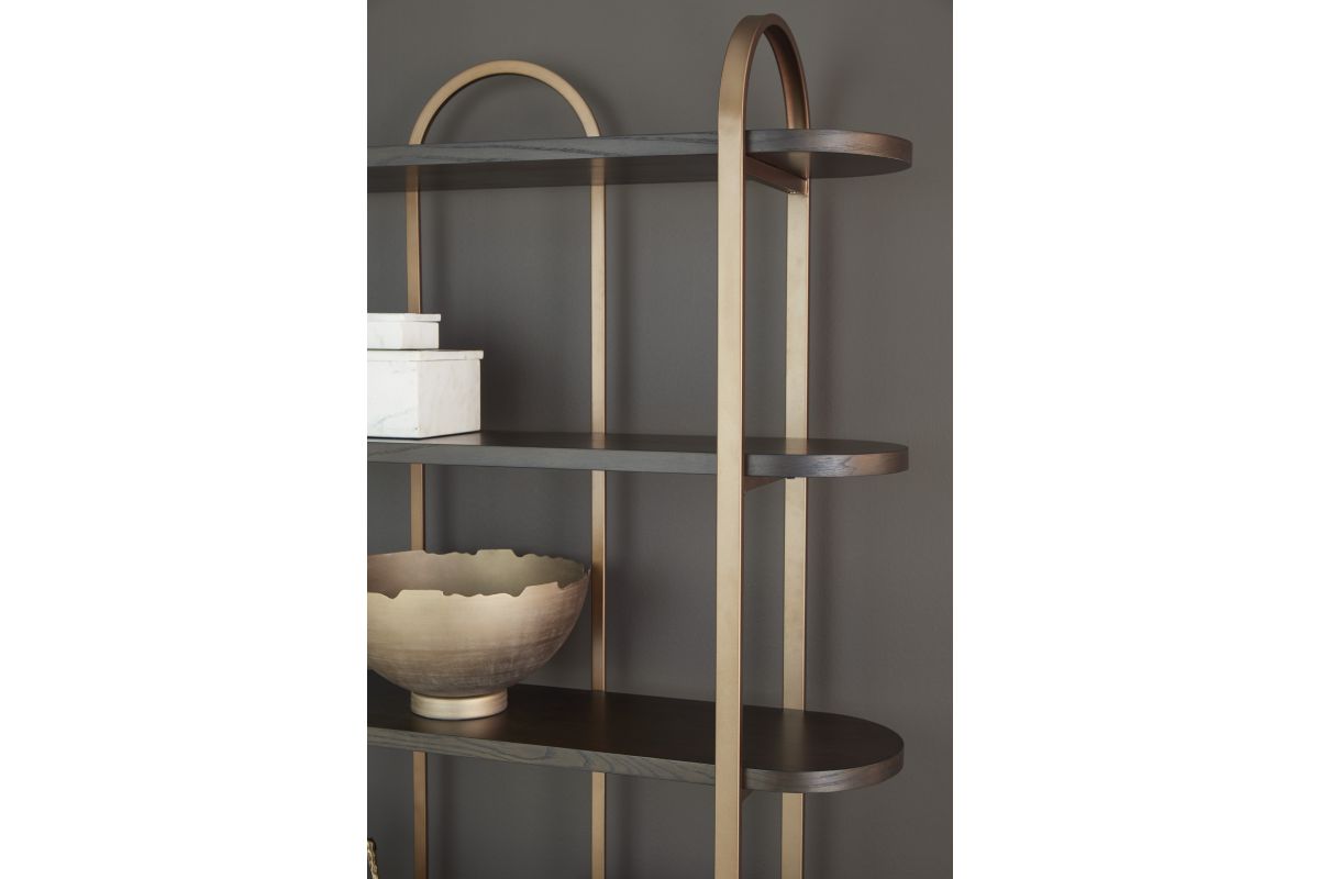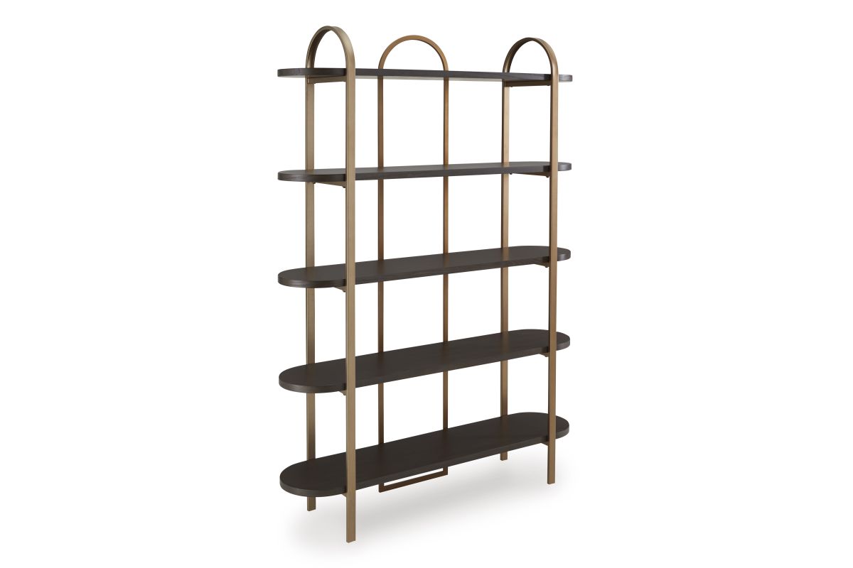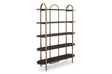 With its mixed-material look, this bookcase seamlessly fits into a wide range of modern settings. Five fixed display shelves in a dark brown finish are balanced by sleek antiqued goldtone metal supports. Offering storage and superior style for books or showcasing decor, this bookcase is a masterful way to stay organized.