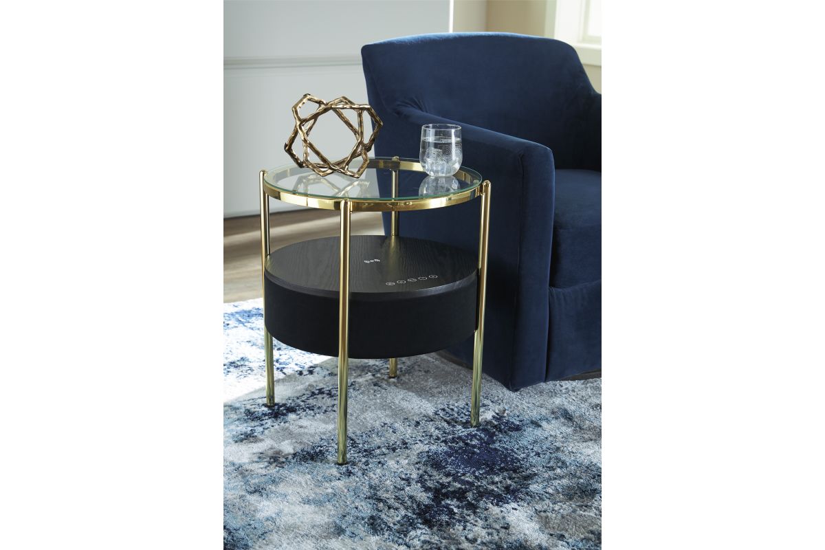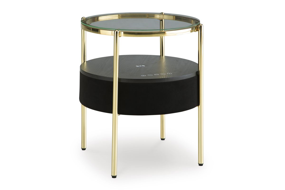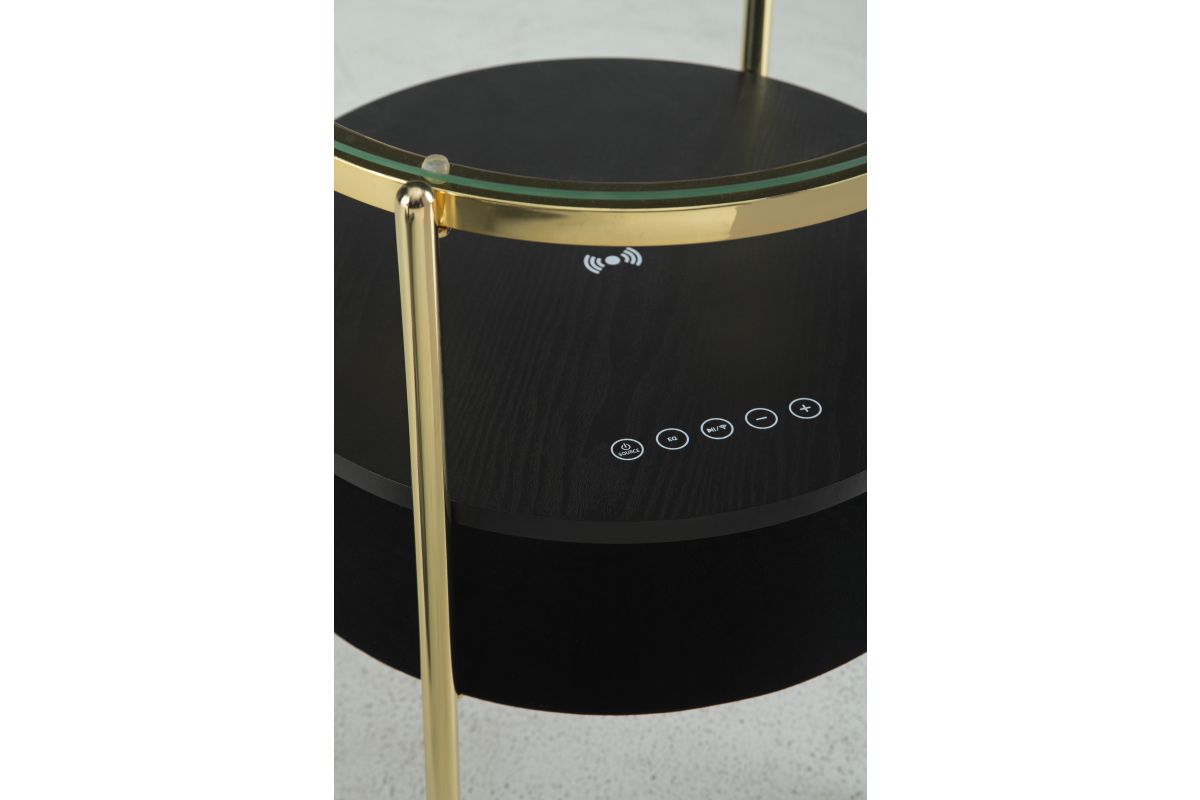 Discover the perfect combination of contemporary style and space-saving functionality. This accent table is designed with an integrated speaker (complete with wireless charging and touch-button controls), allowing you to effortlessly stream your favorite tunes wirelessly. Its sleek glass top perfectly complements the modern black fabric on the sides. This table is gonna be music to your ears.