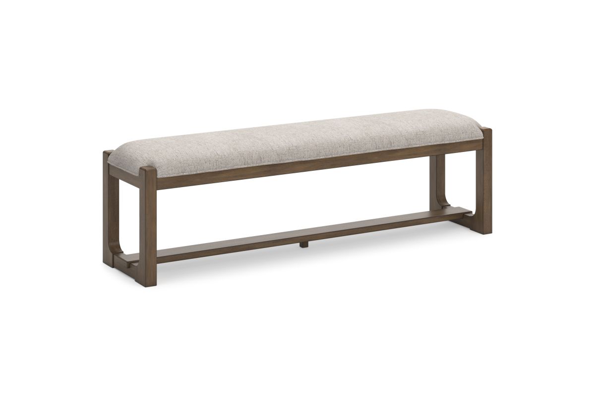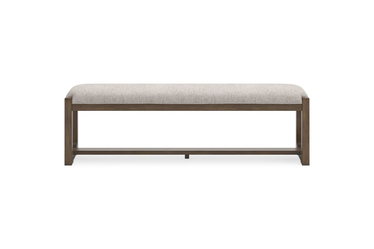 This dining bench sits comfortably at the intersection of modern lodge and farmhouse aesthetics. Your warm and welcoming disposition is reflected in its charming architectural elements and neutral textural fabric. Even with its poise, the bench remains practical. Its cushioned seat invites you to linger longer at the table, defining your dining room with reliable function and style.