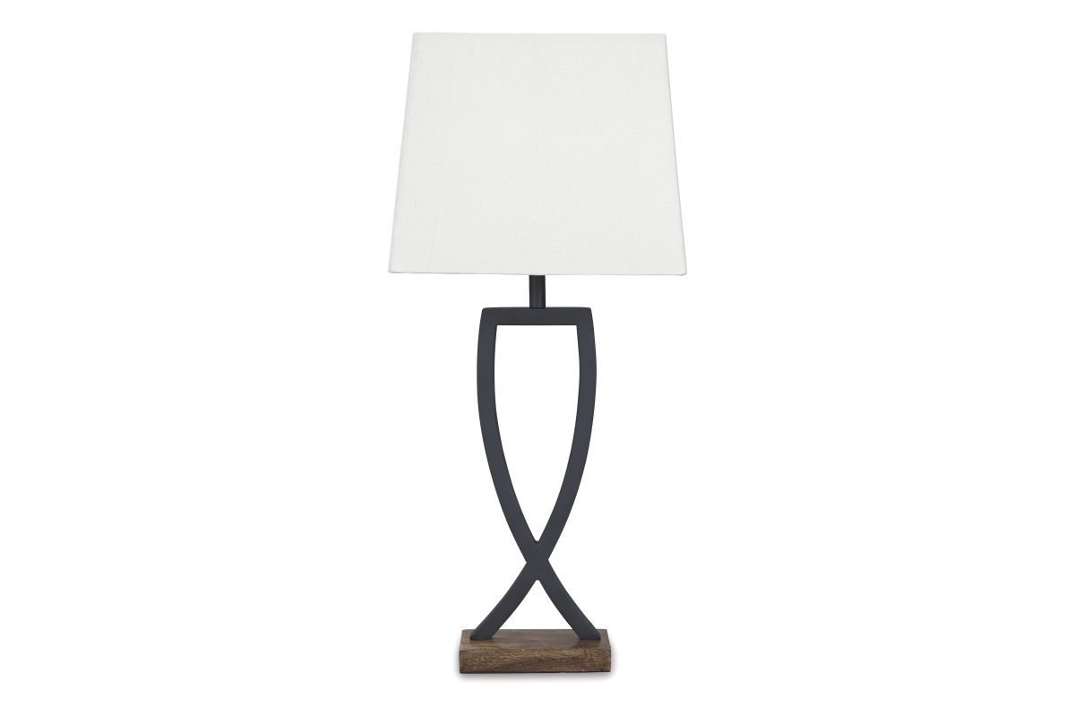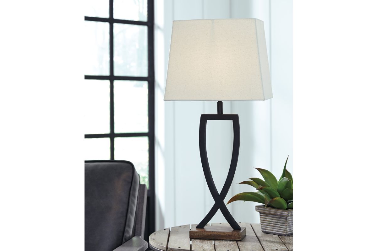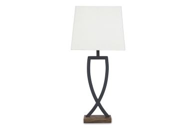 This table lamp is an enticing merge of mixed materials. Textured black finished metal stands poised atop a block of warm brown wood. Open design is right at home among casual decor.