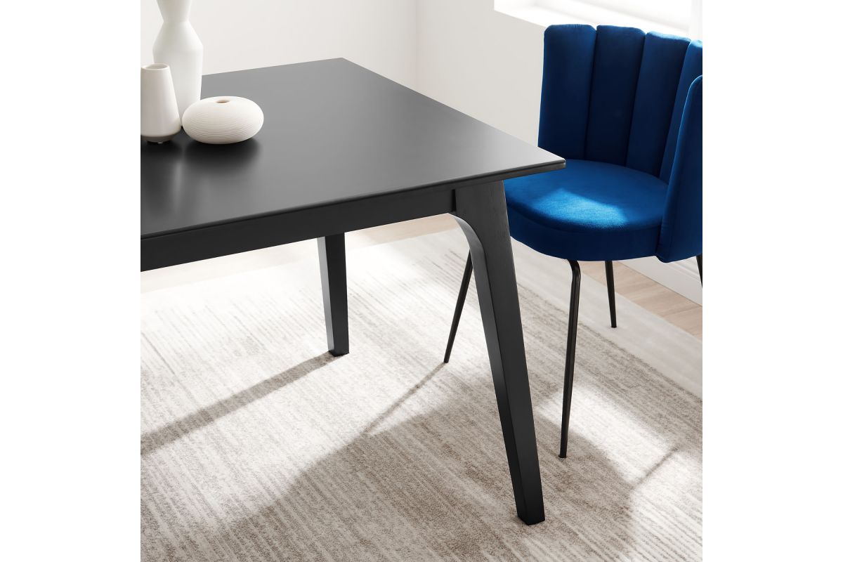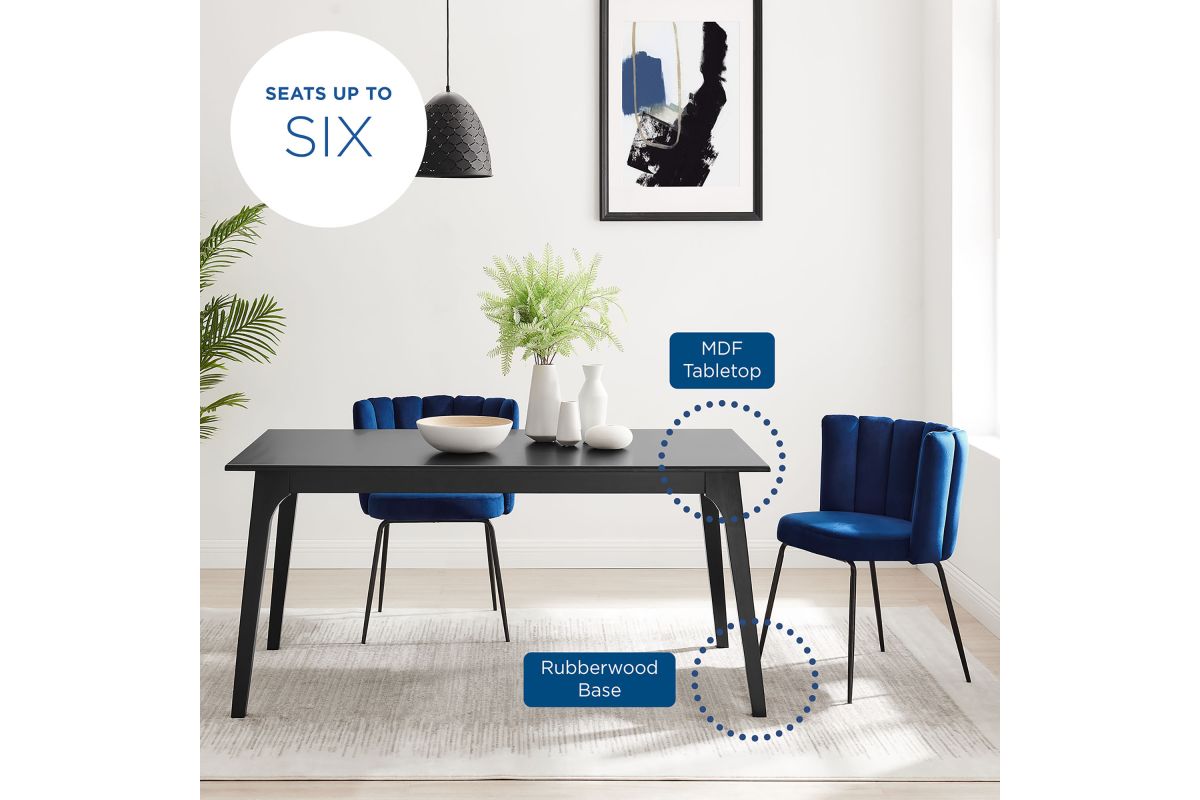 Redefine the modern dining experience with the Juxtapose 63" Rectangle Dining Table. Perfect for everyday dining and entertaining, this rectangular dining table rests atop a sturdy rubberwood frame with four tapered angular legs. This kitchen table is crafted from MDF with a wood grain veneer that is easy to clean and maintain. A striking addition to the modern home, Juxtapose emboldens decor in the dining room or kitchen. Assembly required.