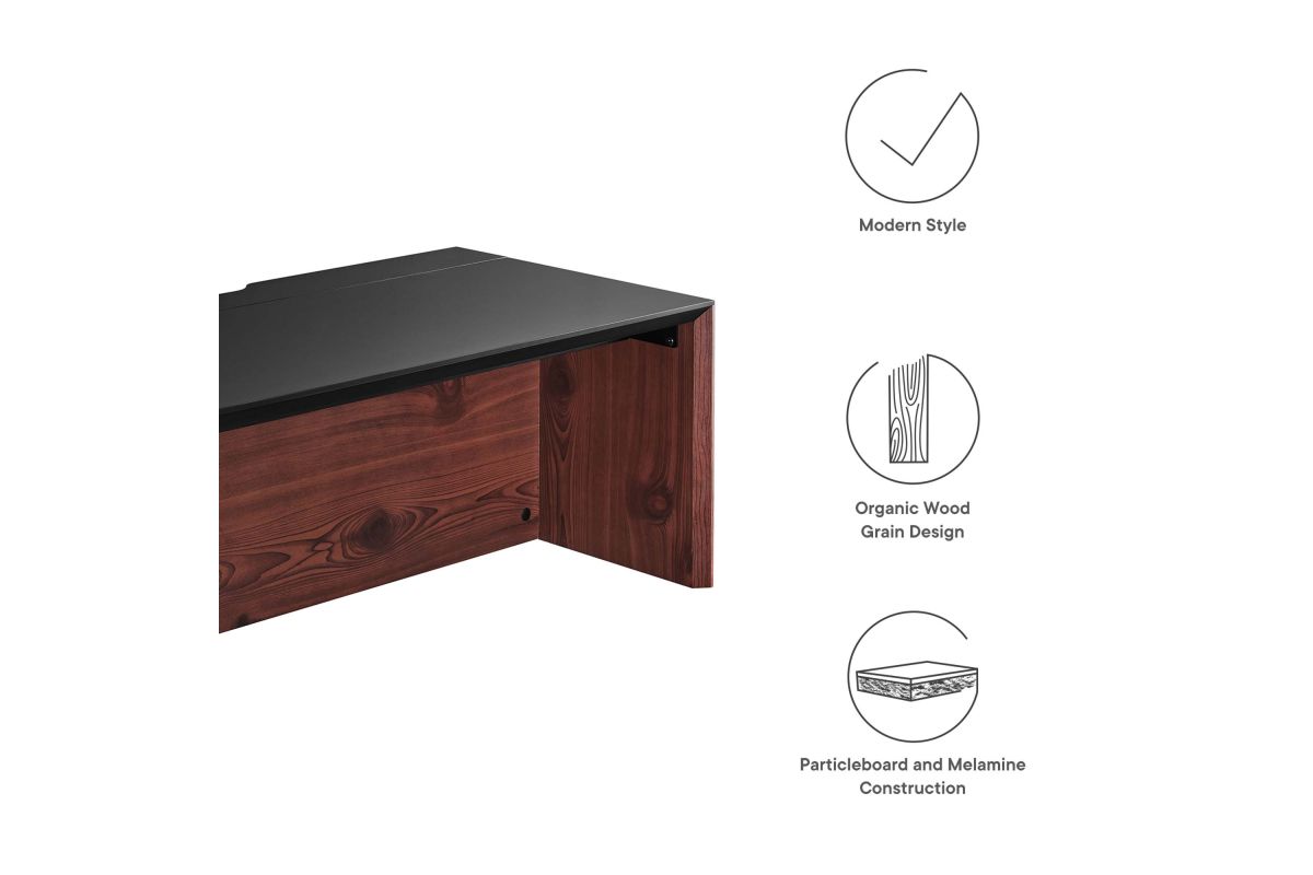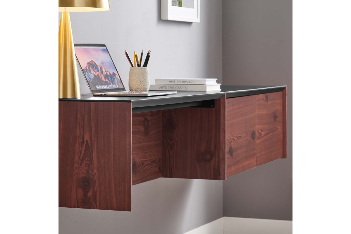 A perfect workspace for the home office, college dorm, bedroom, living room, or any other work area, the 3-Piece Kinetic Wall-Mount Office Furniture Set introduces style and function to the modern home or apartment. Crafted from durable, lightweight particleboard with a complementing melamine top, this office desk features a spacious work area and flip-up cable management compartment to keep things neat and organized while the wall-mount storage cabinet is complete with magnetic-close doors to conceal its shelved storage area. With an organic wood grain design, this wall-mount office desk, storage cabinet, and accent shelf brings natural elegance to any space and mounts directly to the wall to save valuable floor space. Assembly required.
