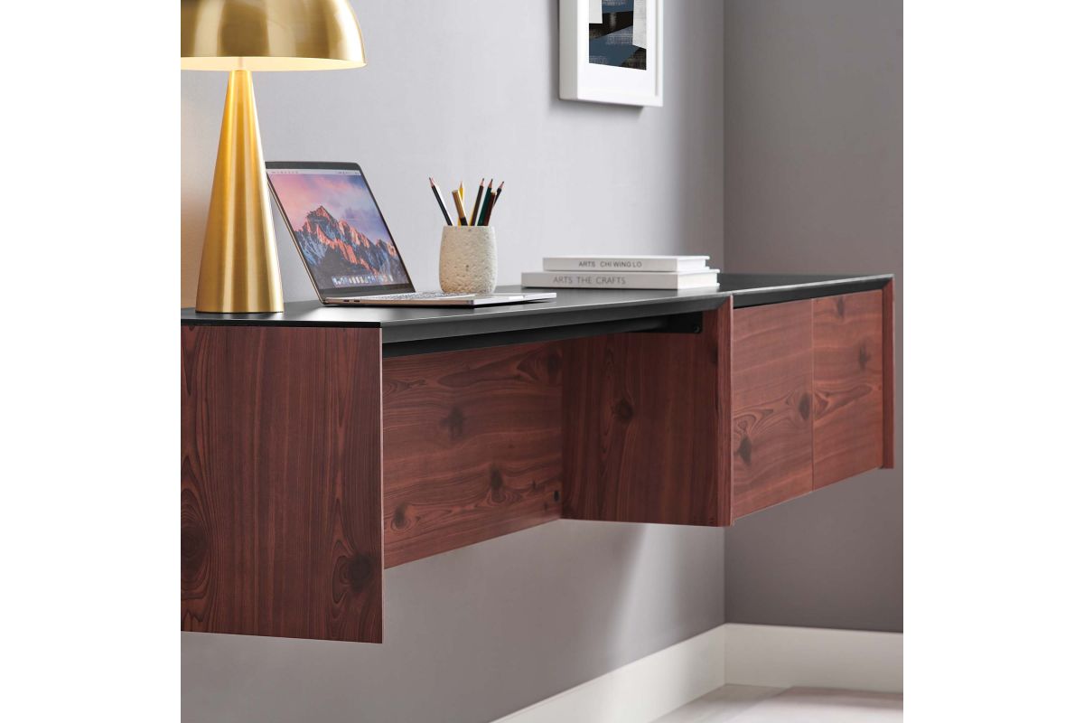 A perfect workspace for the home office, college dorm, bedroom, living room, or any other work area, the 3-Piece Kinetic Wall-Mount Office Furniture Set introduces style and function to the modern home or apartment. Crafted from durable, lightweight particleboard with a complementing melamine top, this office desk features a spacious work area and flip-up cable management compartment to keep things neat and organized while the wall-mount storage cabinet is complete with magnetic-close doors to conceal its shelved storage area. With an organic wood grain design, this wall-mount office desk, storage cabinet, and accent shelf brings natural elegance to any space and mounts directly to the wall to save valuable floor space. Assembly required.