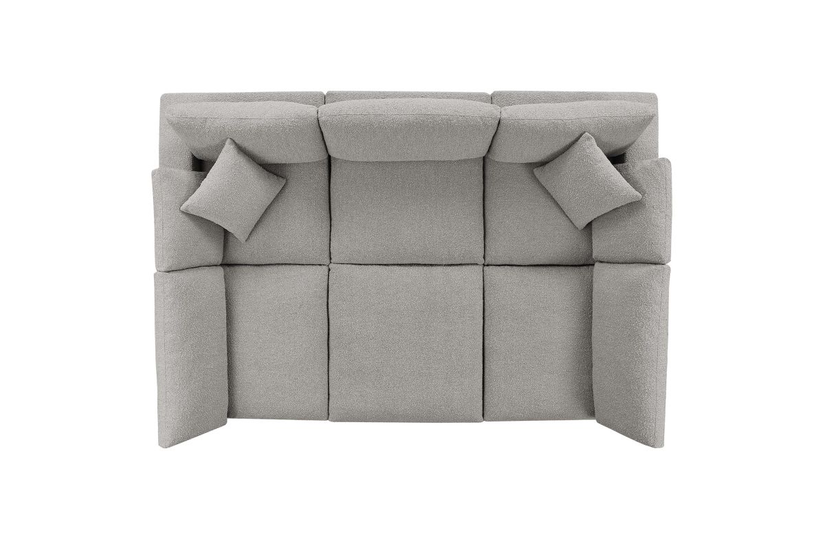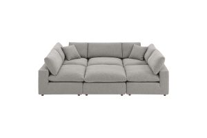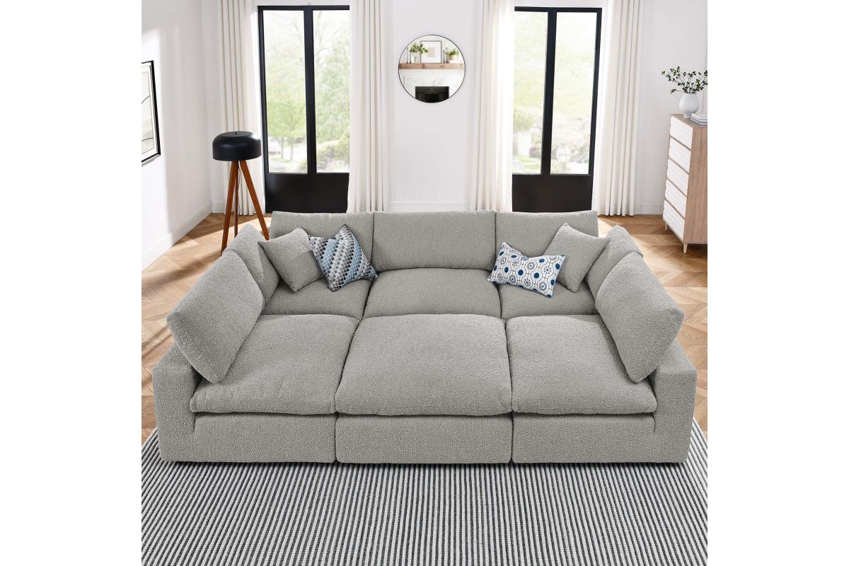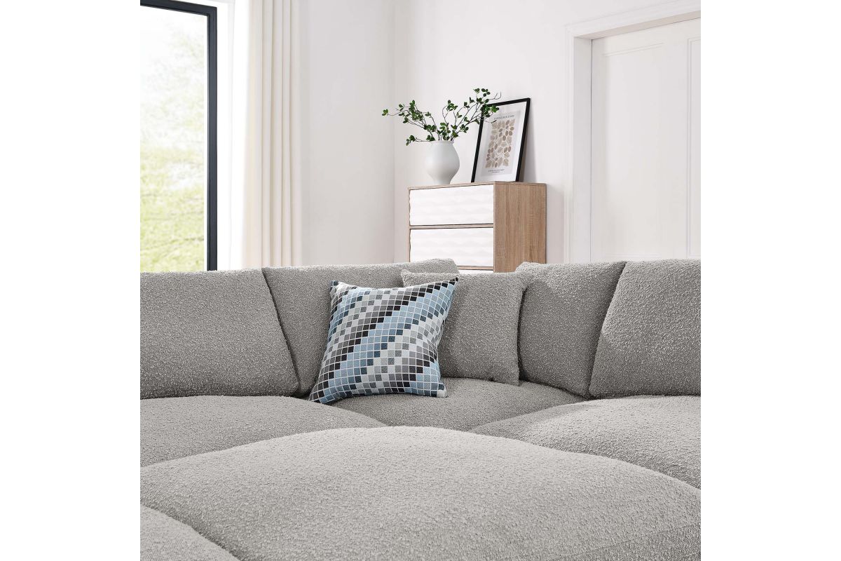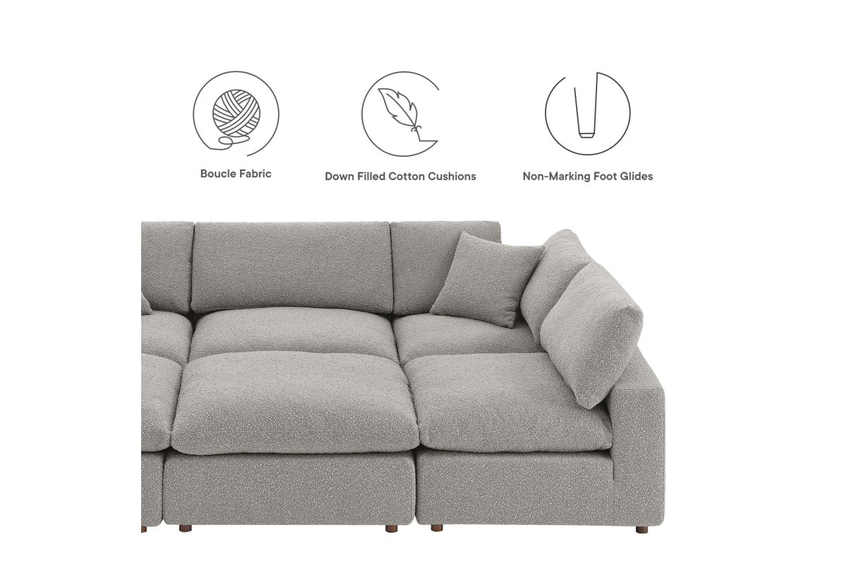 A haven for cozy relaxation, Commix features plush comfort and a clean-lined design. The spacious profile makes an attractive statement in the modern home. Covered in a boucle fabric with a charming nubby texture, this upholstered sectional sofa comes with a solid wood construction and foam padded and duck down cushions for a luxurious sink-in feel. Commix features overstuffed down feather cushions that offer a feeling of relaxation and calming comfort while lounging, making it the perfect addition to the living room, family room, or game room. Made for sprawling out or curling up, Commix beckons you and guests to sit and stay a while. Includes plastic foot glides. Weight Capacity of Each Piece: 331 lbs.
