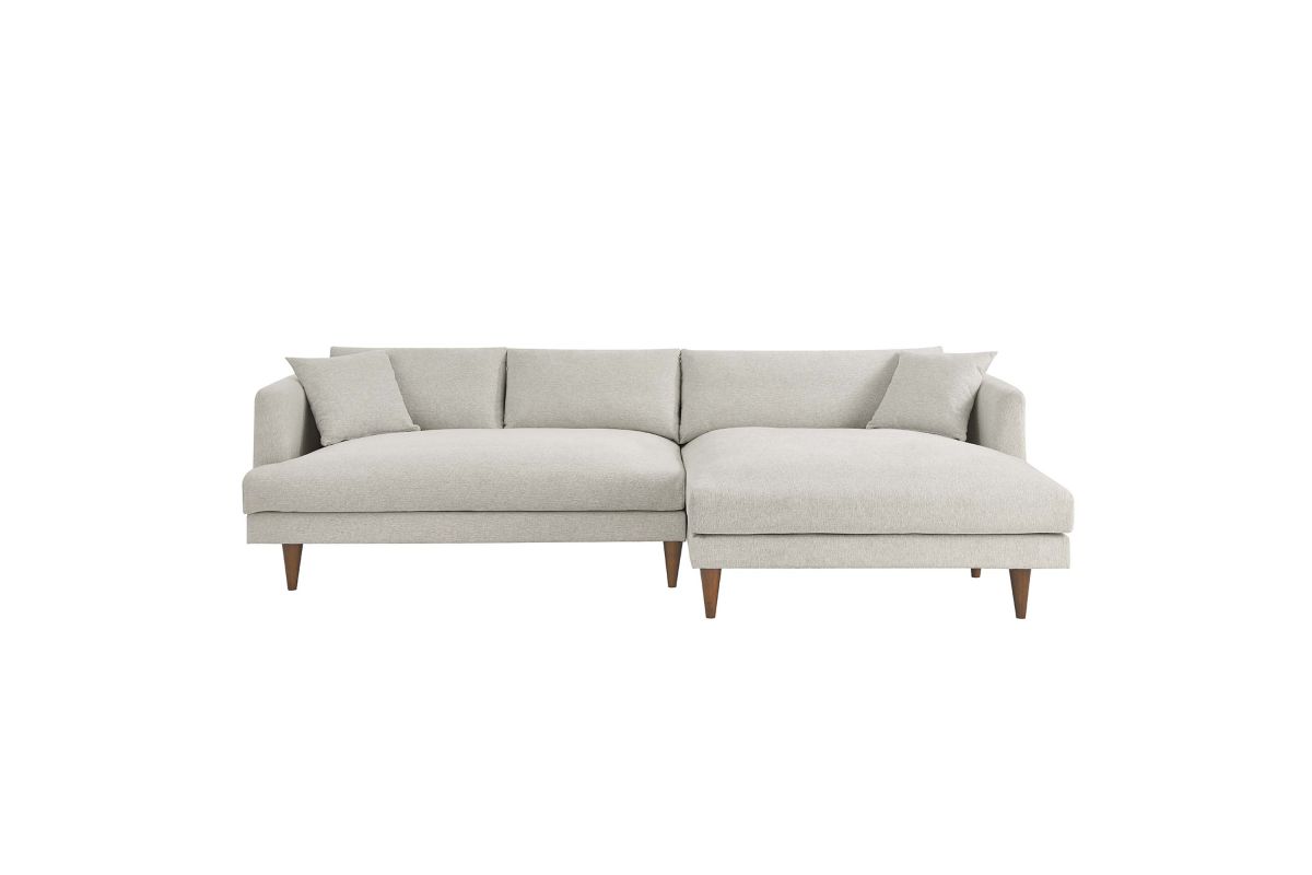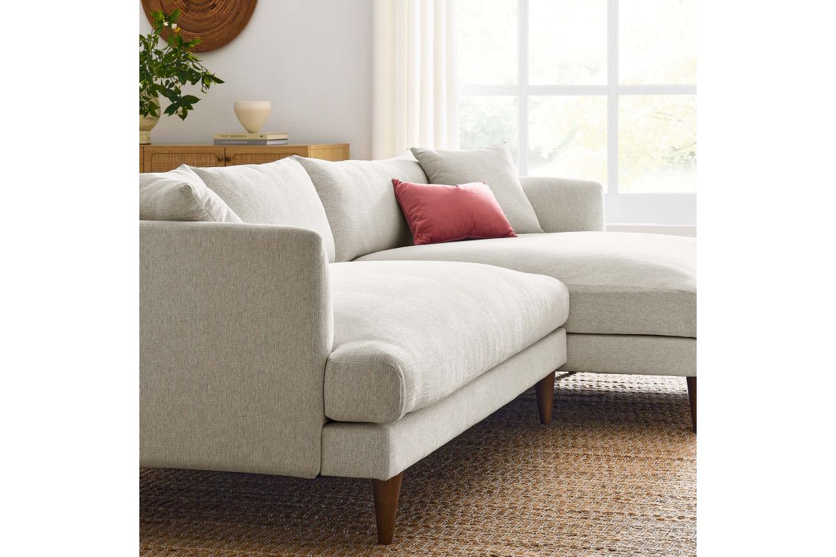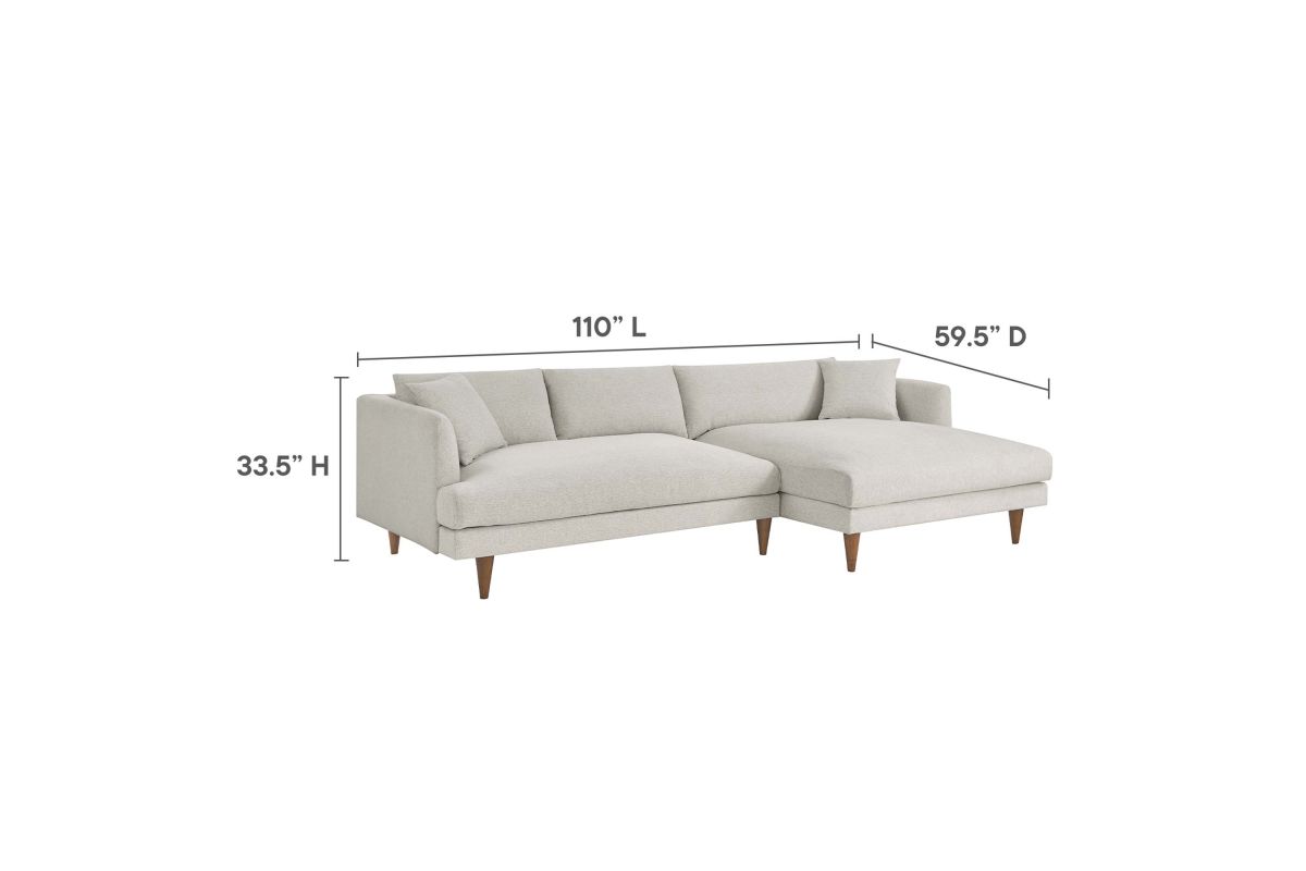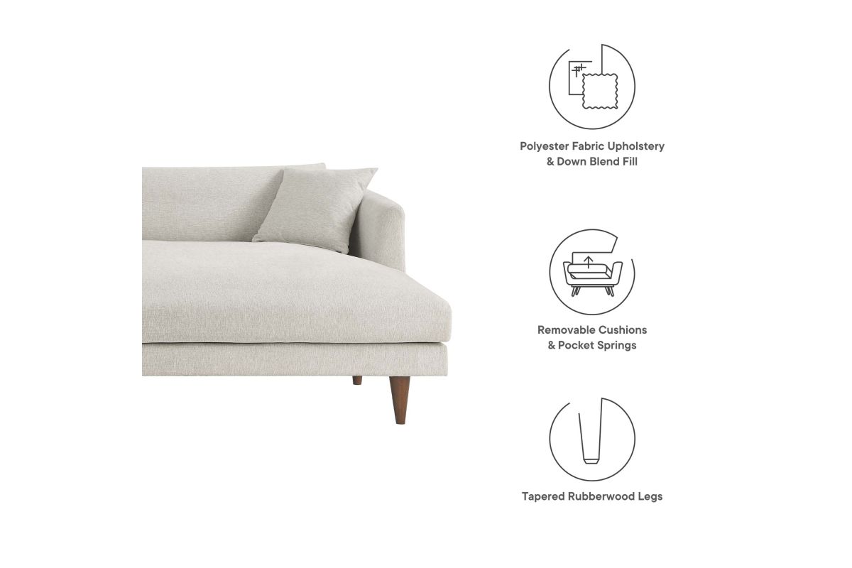 Dive deep into comfort and conversations with the Zoya Upholstered Down-Filled Sectional Sofa. The perfect addition to modern living rooms, family rooms, or game rooms, Zoya's two-piece sectional design, featuring a right-arm chaise, invites you into an immersive lounging experience, with a low, comfortable profile and spacious deep seating. Upholstered in polyester fabric with a down blend and dense foam filling, this living room sofa provides a soft, cloud-like sensation that retains its shape. Accompanied by back cushions and two square throw pillows, this sectional delivers a lounging experience optimized for comfort. The convenience of removable and washable cushions makes maintenance a breeze. Underneath a lavish exterior, Zoya integrates pocket springs, which offer added support, all while perched on sleek tapered rubberwood legs and set on a solid wood frame. Whether you're hosting a movie night or reading your favorite book, the Zoya Fabric Sectional Sofa is your ticket to a luxurious lounge. Comes equipped with non-marking foot caps. Assembly required. Each piece weight capacity: 600 lbs.