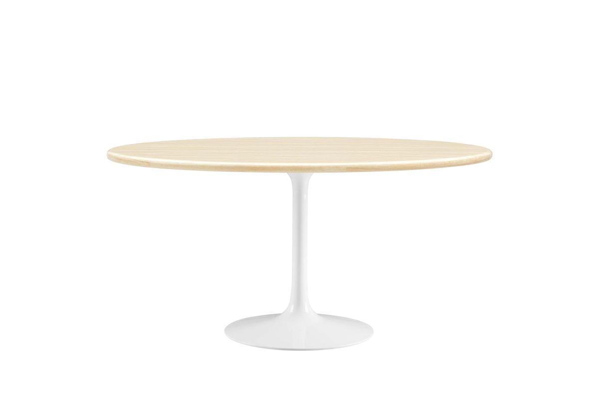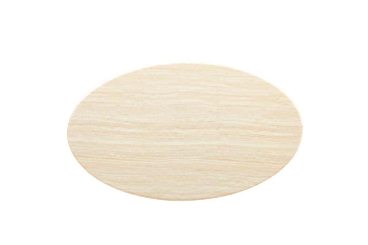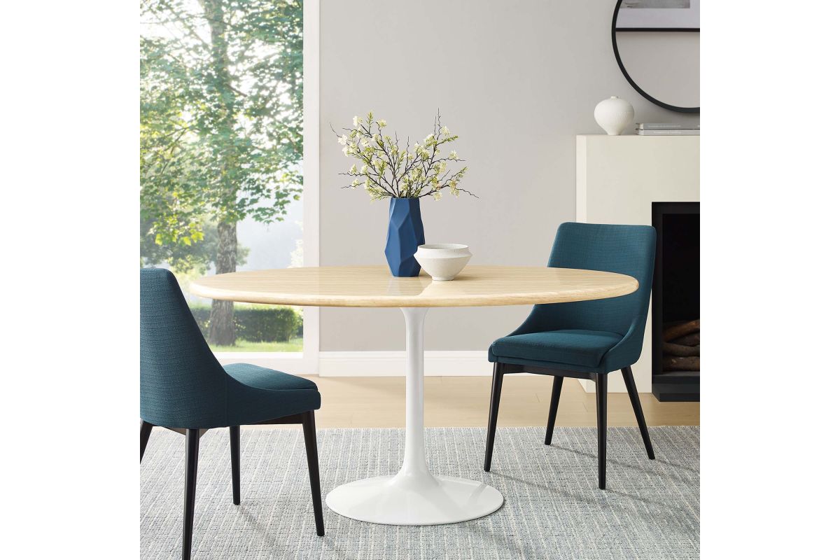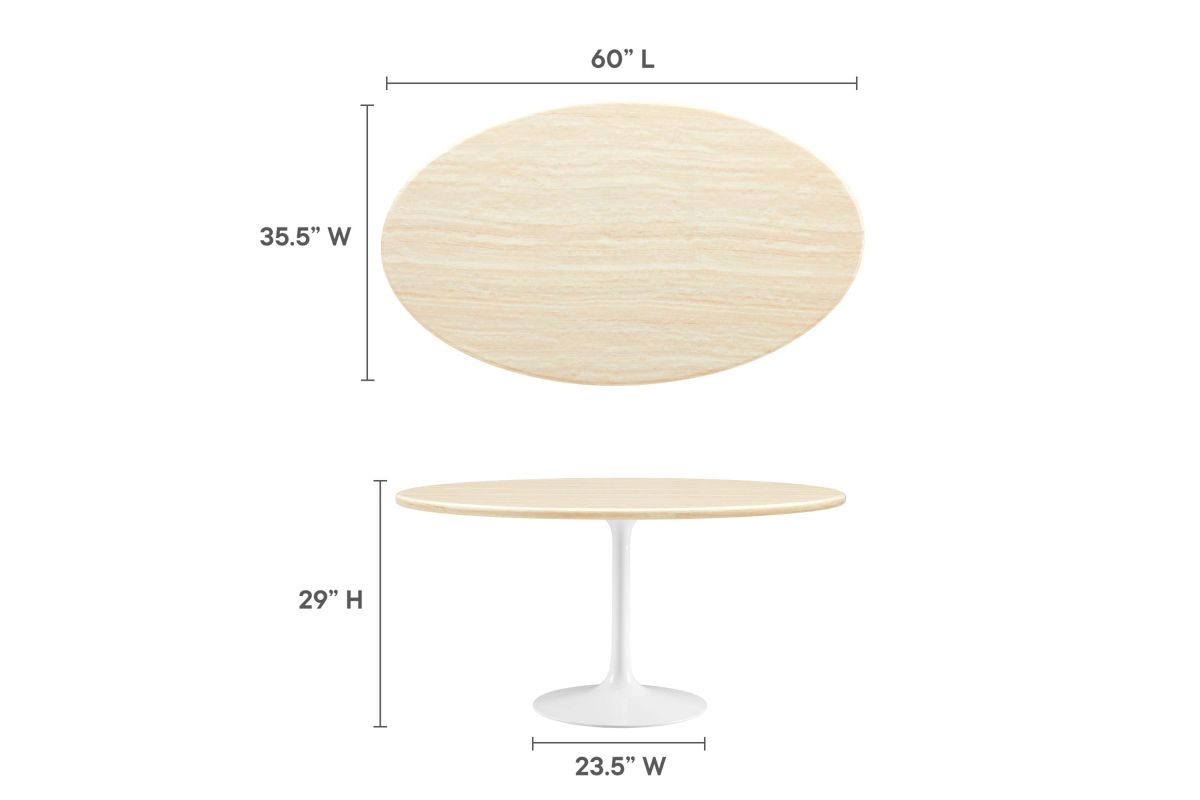 Embrace the day-to-day with the Lippa 60" Oval Artificial Travertine Dining Table. Perfect for everyday meals, the exquisite tabletop, crafted from artificial travertine , exudes modern elegance and offers a comfortable seating area for six. Resting on a tapered, white metal pedestal base with a chip-resistant finish, the sleek silhouette complements dining areas, kitchens, living rooms, breakfast nooks, or sunrooms. Includes non-marking felt pad to protect flooring. Assembly Required.