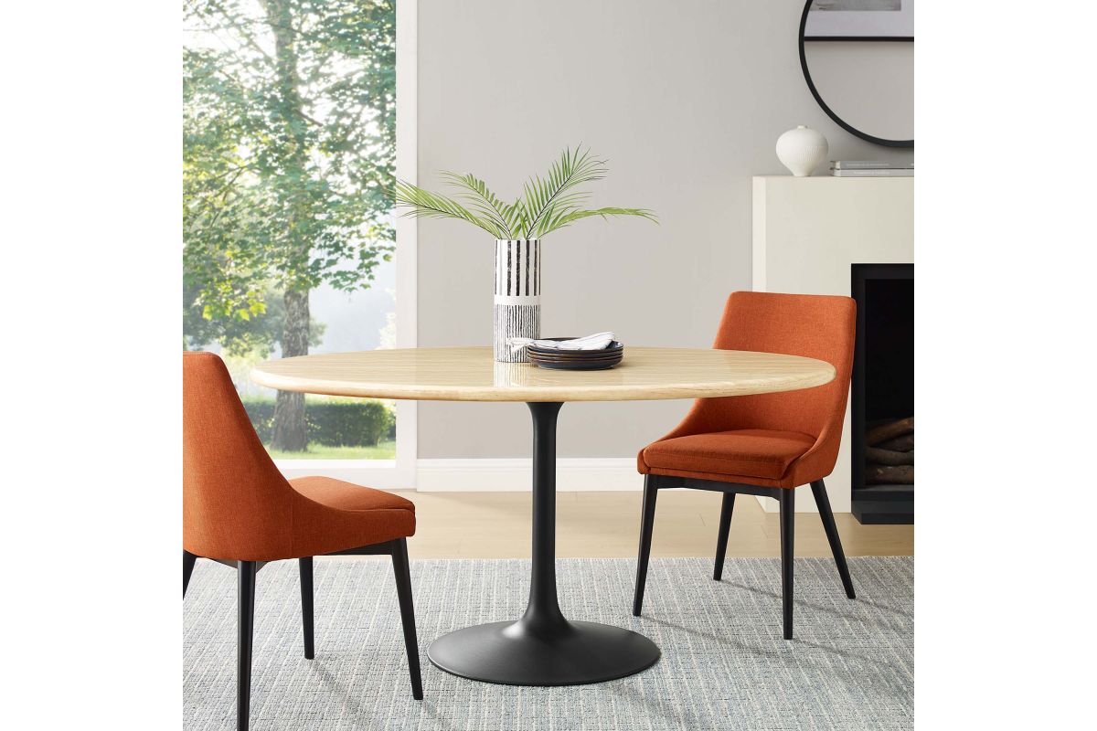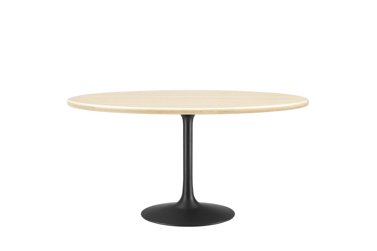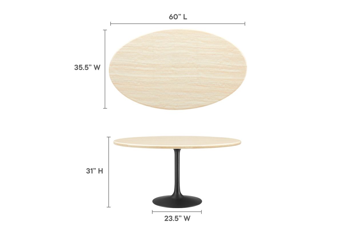 Embrace the day-to-day with the Lippa 60" Oval Artificial Travertine Dining Table. Perfect for everyday meals, the exquisite tabletop, crafted from artificial travertine , exudes modern elegance and offers a comfortable seating area for six. Resting on a tapered, matte black metal pedestal base with a chip-resistant finish, the sleek silhouette complements dining areas, kitchens, living rooms, breakfast nooks, or sunrooms. Includes non-marking felt pad to protect flooring. Assembly Required.