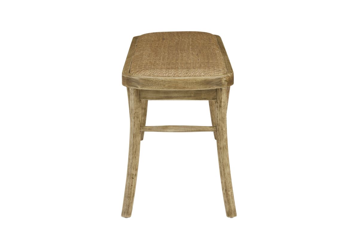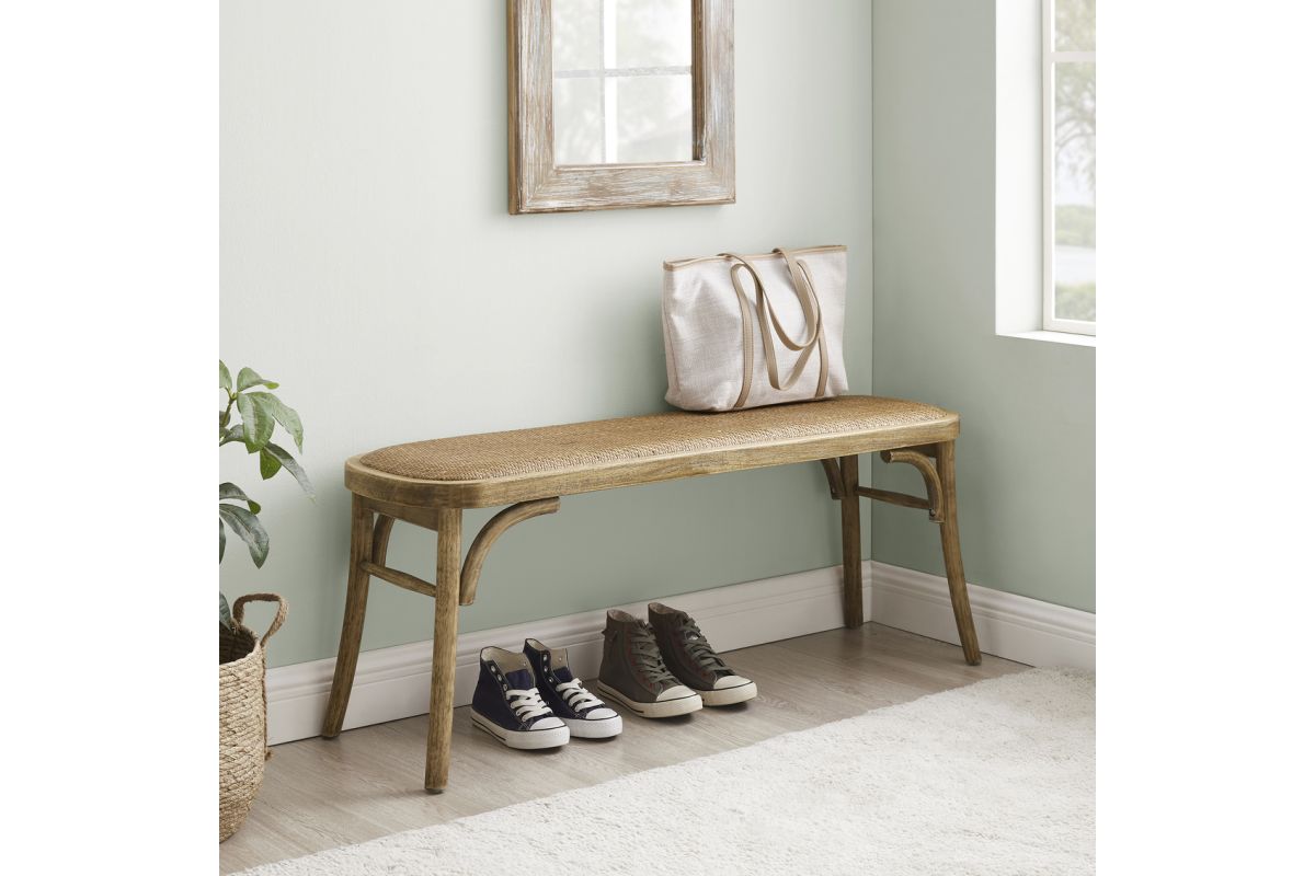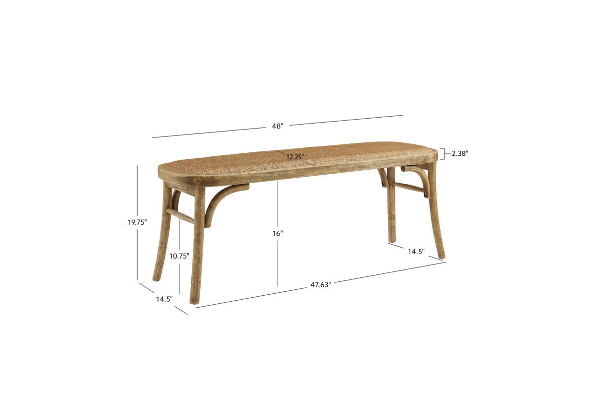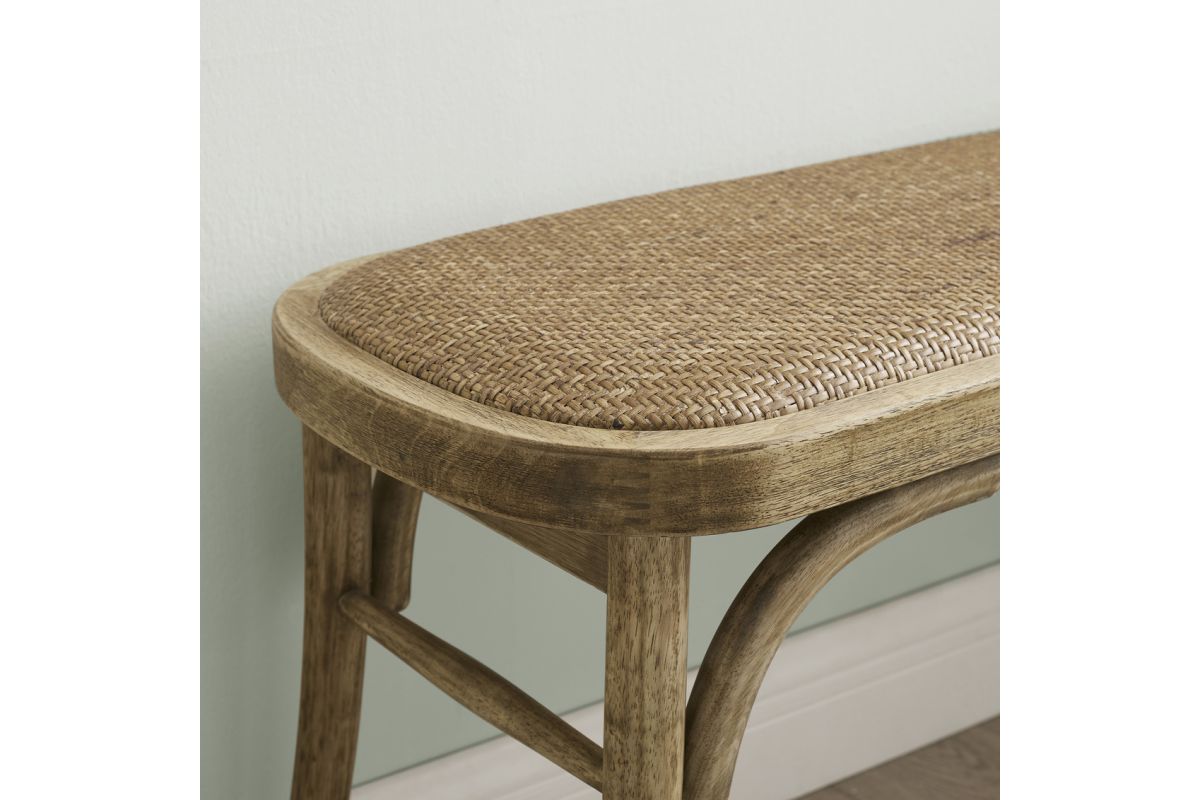 Reveries of the french countryside are guaranteed when you take a seat on this charming backless bench. The bentwood frame in a rustic brown finish leaves the surface with a worn and welcoming appearance bolstered by the natural rattan seat. A subtle cushion offers extra comfort while remaining firm enough to support guests at the dinner table. Sturdy yet lightweight, this piece is easily transportable and will fit wonderfully in your kitchen, living room, entryway or at the foot of a bed.