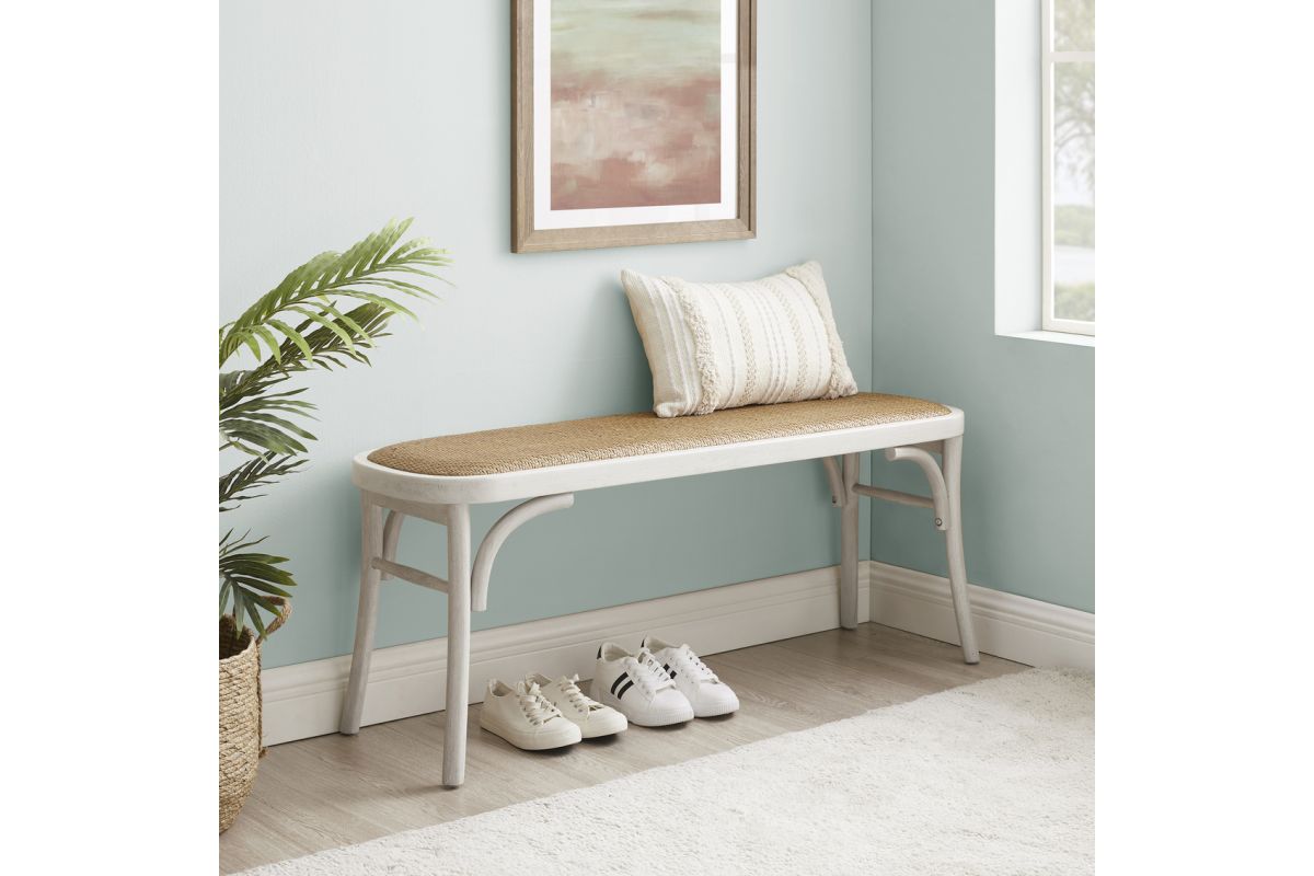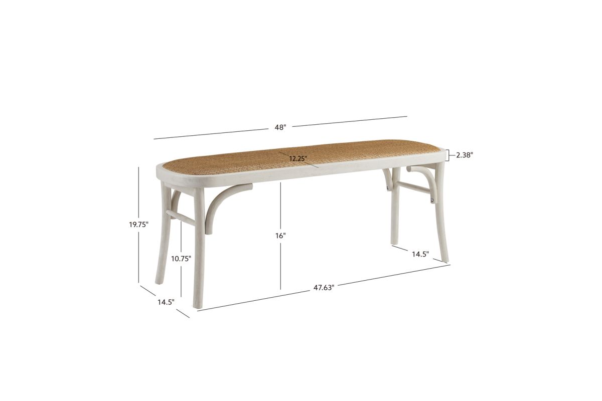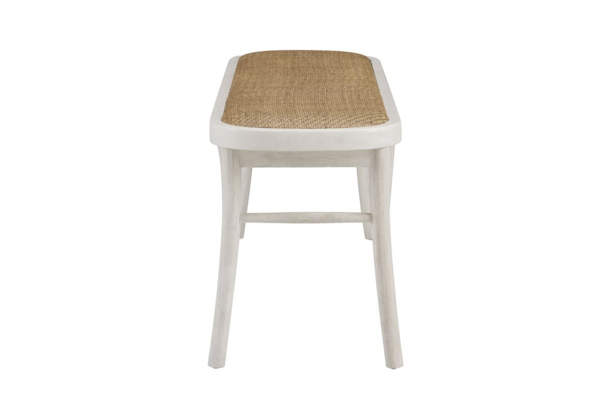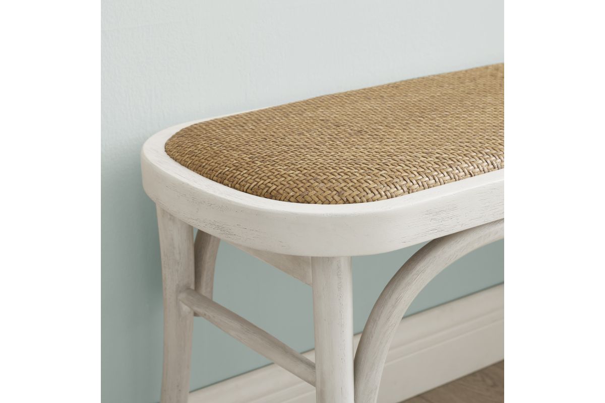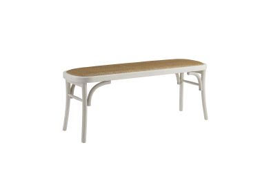 Reveries of the french countryside are guaranteed when you take a seat on this charming backless bench. The natural rattan seat accents the bentwood frame in a painted white finish. A subtle cushion offers extra comfort while remaining firm enough to support guests at the dinner table. Sturdy yet lightweight, this piece is easily transportable and will fit wonderfully in your kitchen, living room, entryway or at the foot of a bed.