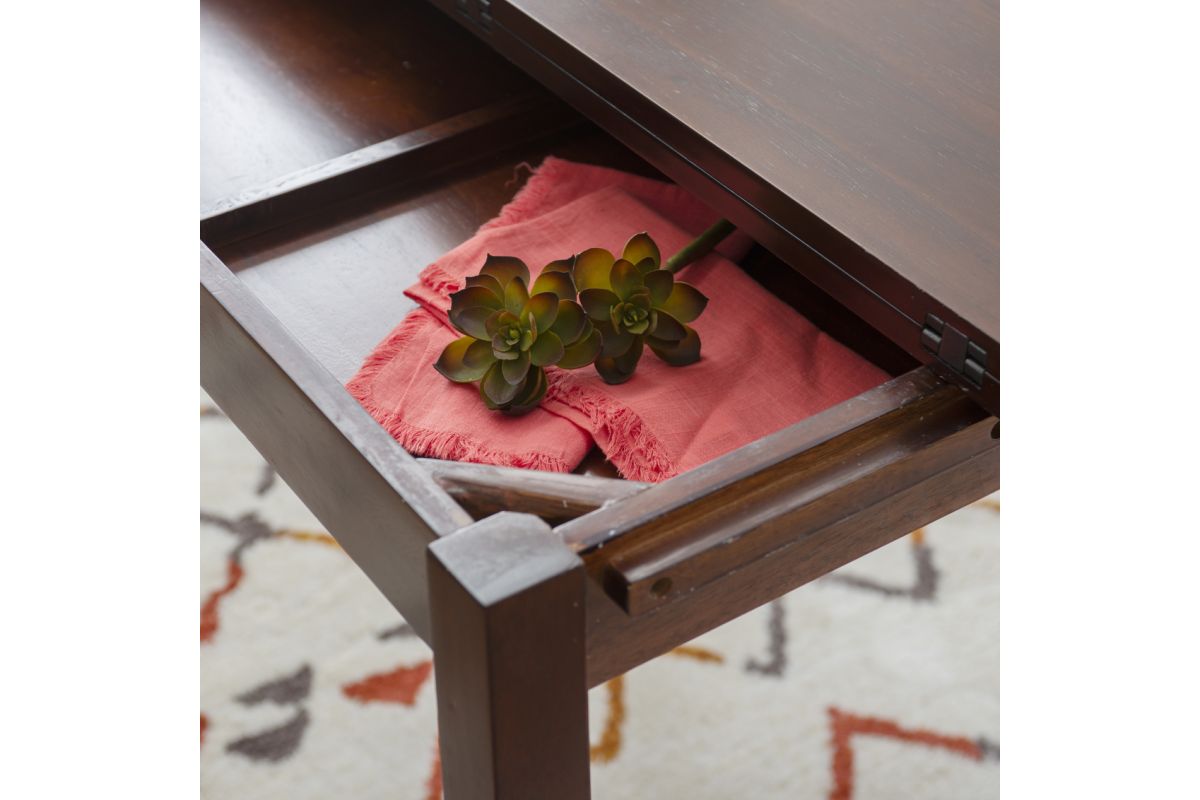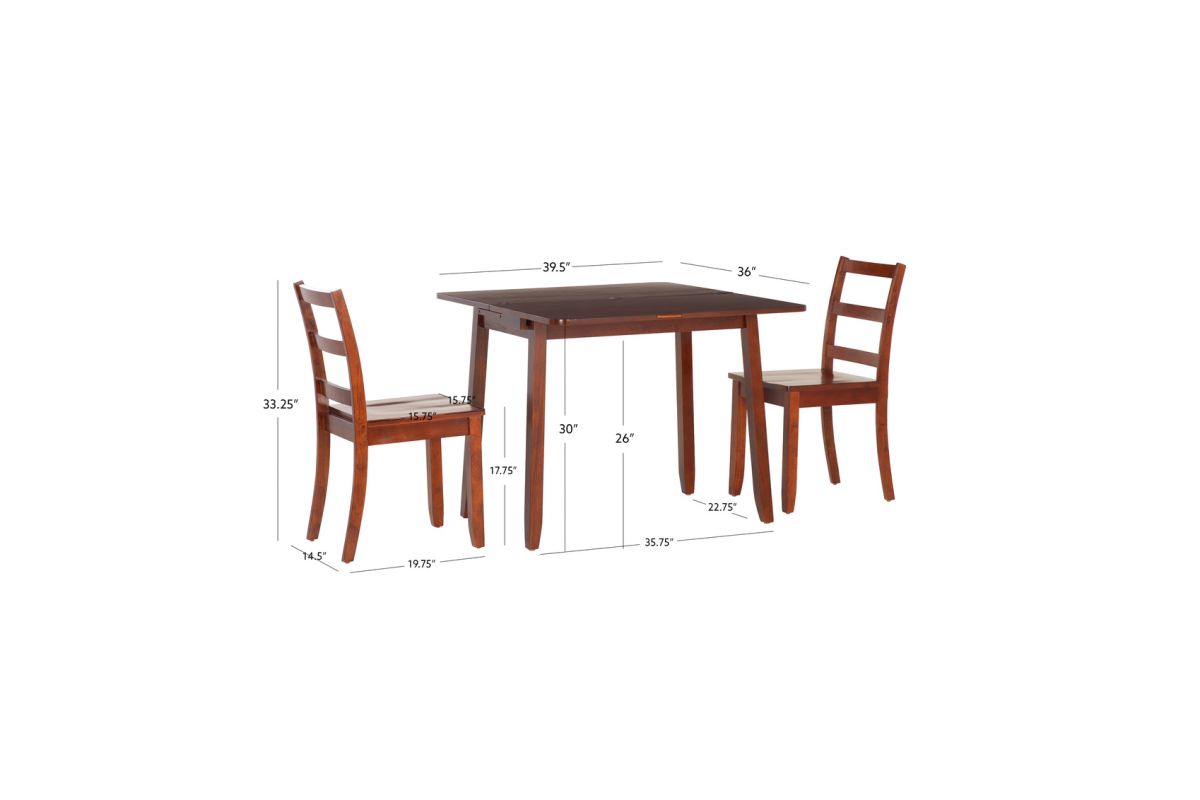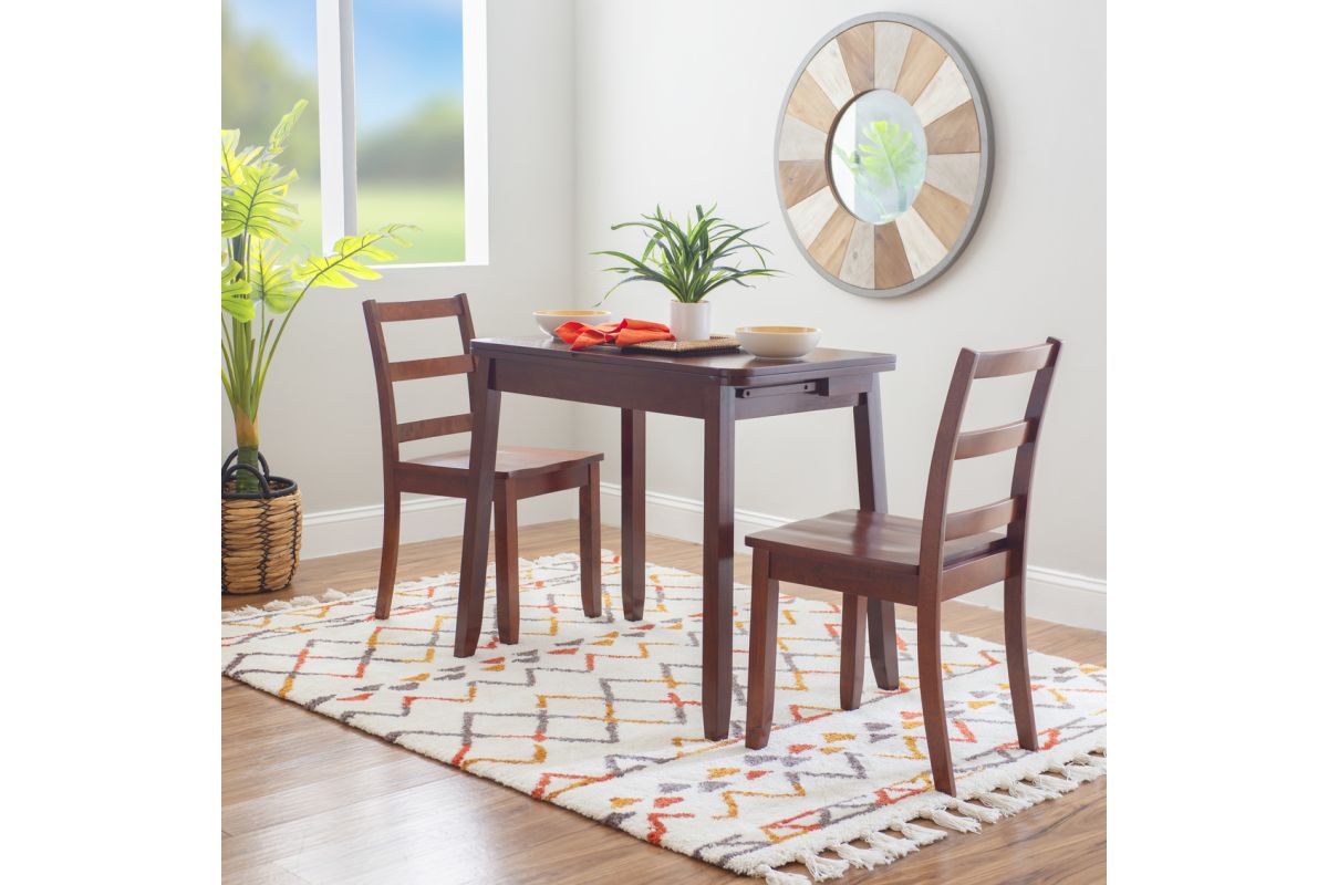 This classically styled table and chair set creates extra seating anywhere in your home. It includes 2 chairs and a rectangular table. The table top opens easily, doubling in size, and folds flat to save space when not being used. Perfect for creating extra seating for surprise dinner guests, during the holidays, or as a kitchen table in a cozy studio apartment. Also, a hidden storage area under the tabletop is perfect for placemats, napkins, and cutlery. Finished in a rich brown espresso finish, this set will effortlessly blend in with your existing decor.