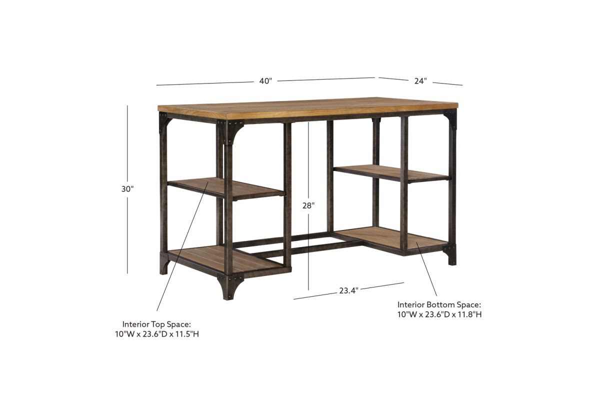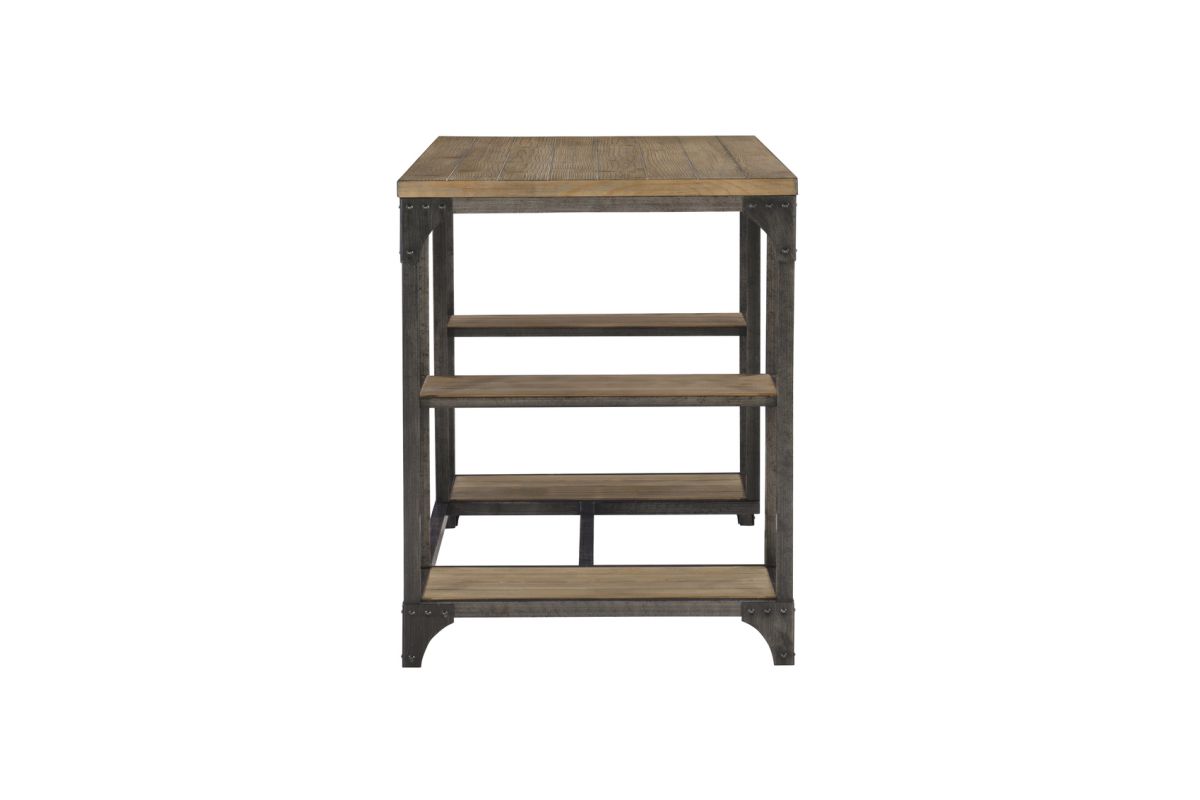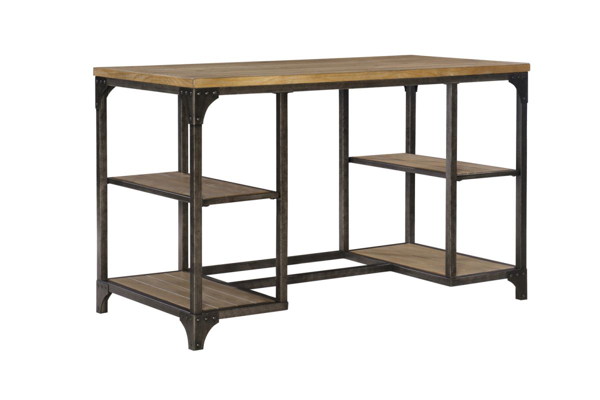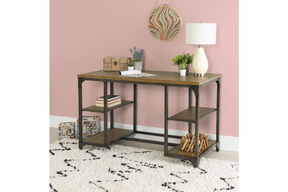 Incorporating vintage character and charm, this desk makes an ideal choice for your office, bedroom, or study. The desk mixes an industrial style metal base with a planked weathered driftwood veneer. The spacious desktop is flanked with four open shelves below for all your storage needs. Extra industrial touches with corner brackets and rivet details finish off this one of a kind piece. Some assembly required.