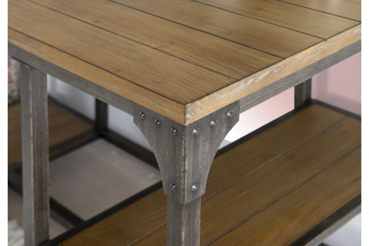 - Features a metal base with a planked weathered driftwood veneer