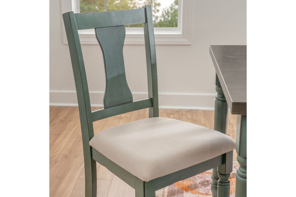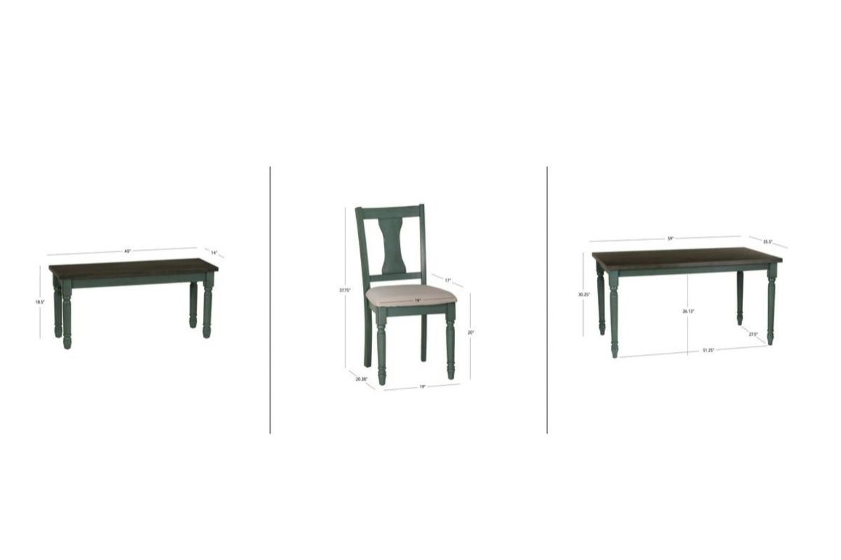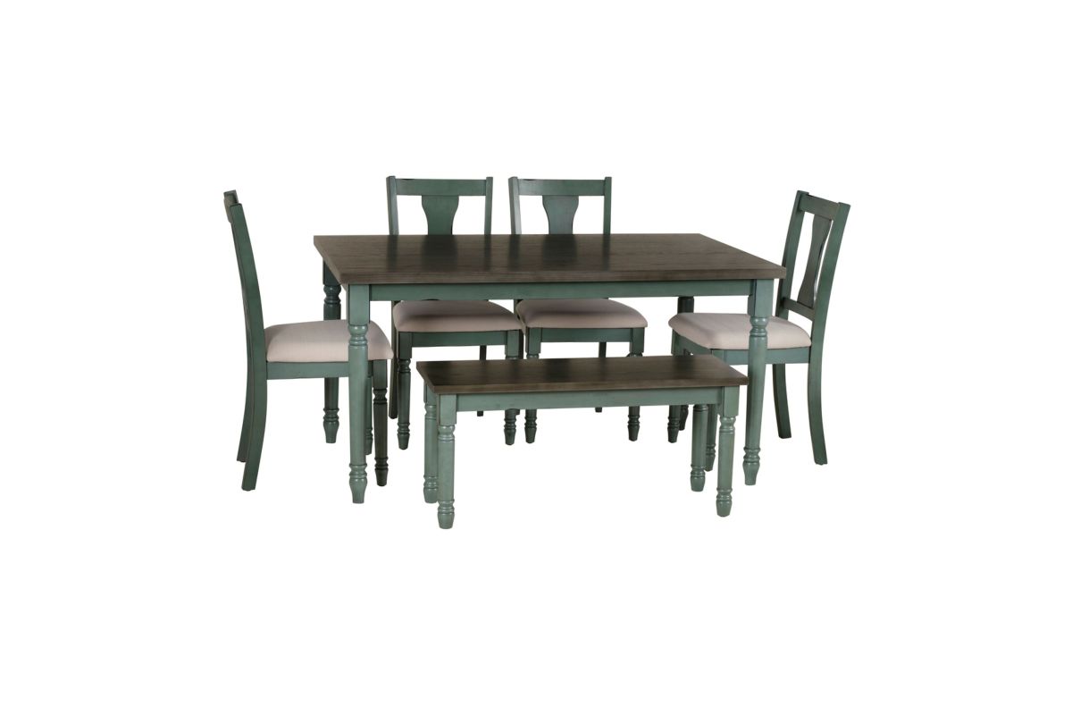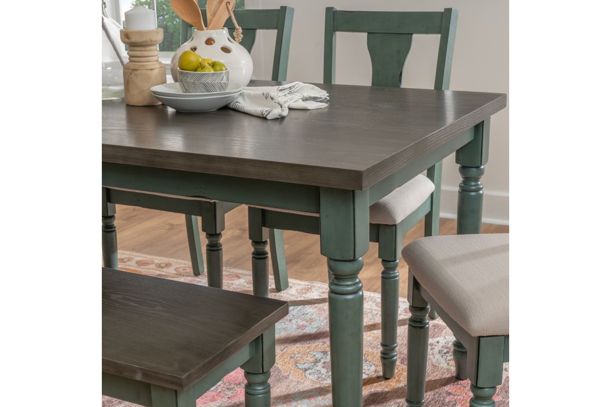 With a beautiful and calming blue finish, this dining set includes the dining table, four chairs, and bench. A burnished smoke finish on the tabletop provides a nice contrast with the teal blue dry brushed glaze finish and wormhole distressing on the table base, bench, and chairs. The attention to detail in the design features of turned legs and chiseled edging make this set stand out. The padded seats are made for comfort and style with a neutral fabric with tonal variation. The bench adds extra seating and perfectly matches the table in the two tone finishes. Some assembly required.