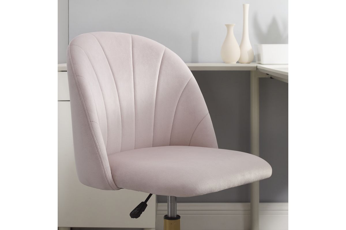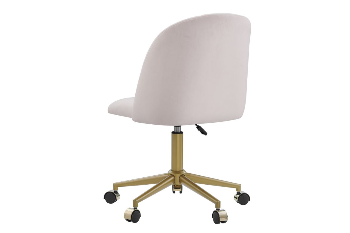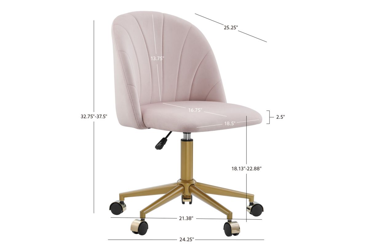 Add beauty, style and function to your office with this rolling desk chair. The soft, plush frame is upholstered in soft pink velvet and features a rounded back and elegantly curved seaming. A striking gold base with matching metal castor covers adds to its beauty. The seat swivels 360 degrees for comfort, and the seat height is adjustable. Perfect for a home office, dorm room or vanity in your bedroom.