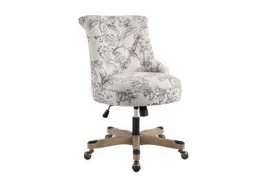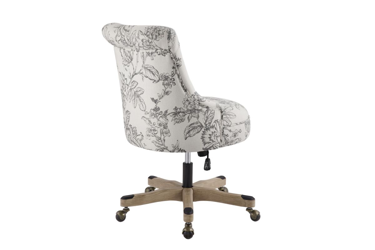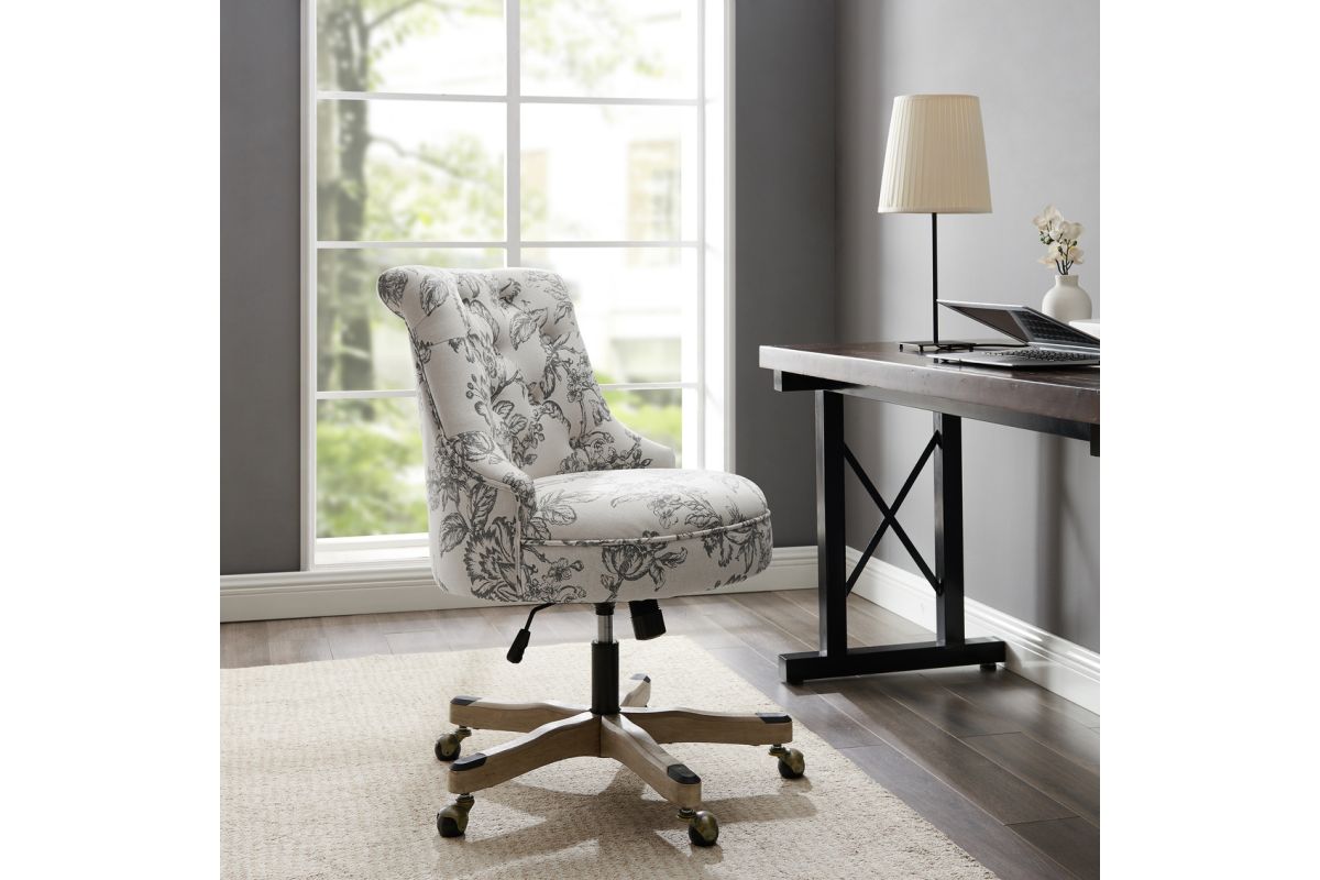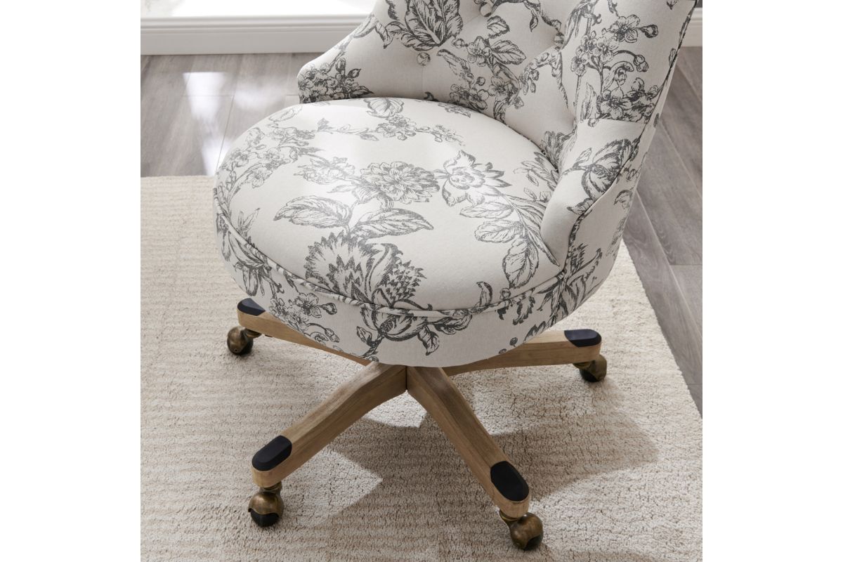 Add style and function to your office with this office chair. The soft, plush frame features a button-tufted back upholstered in an elegant floral printed linen fabric. A sturdy natural wood base is set upon durable metal casters for easy mobility. An adjustable seat height ensures this chair works for a variety of table heights. Perfect for a home workspace or an added touch of comfort at the office.