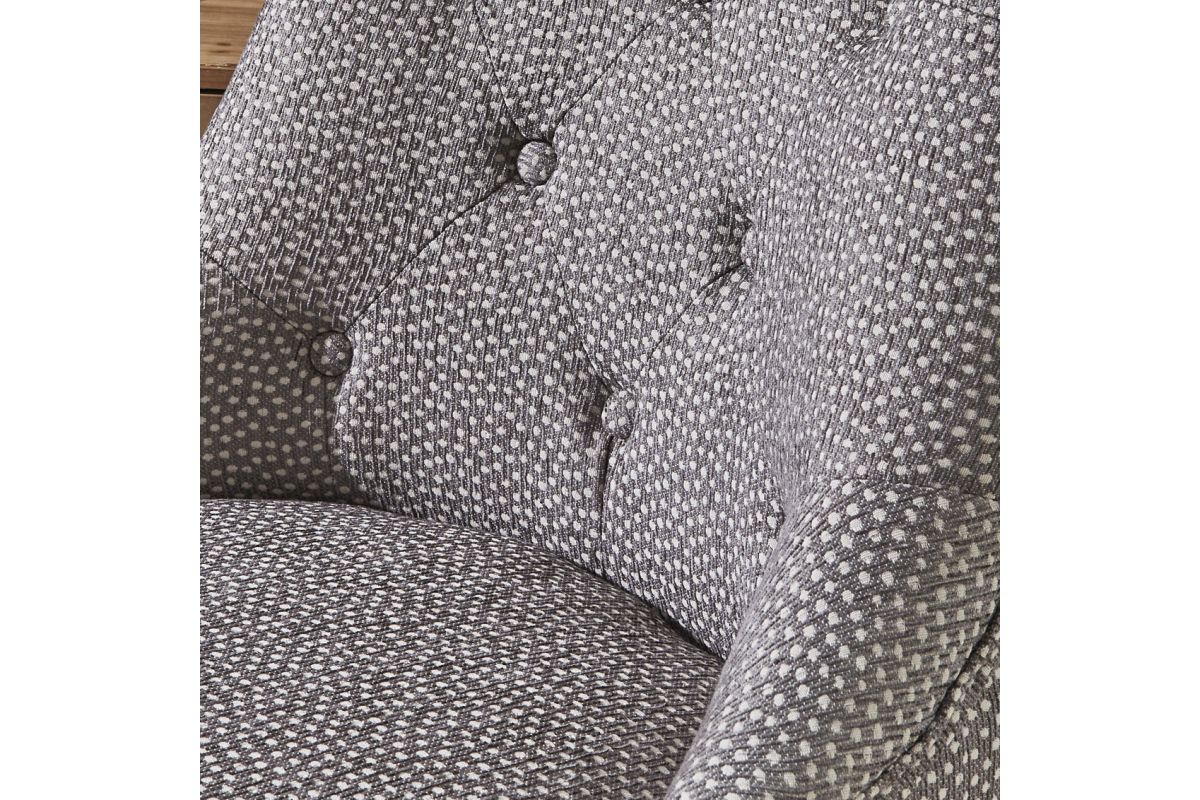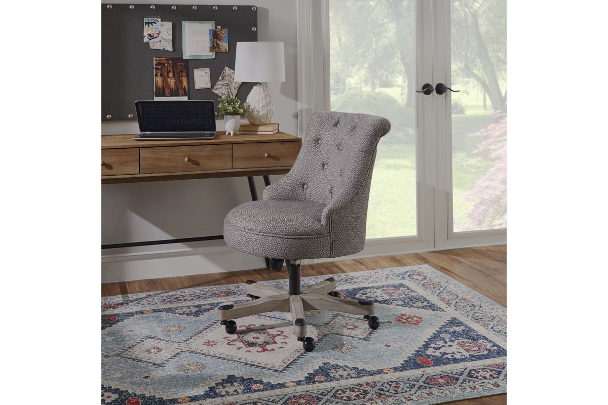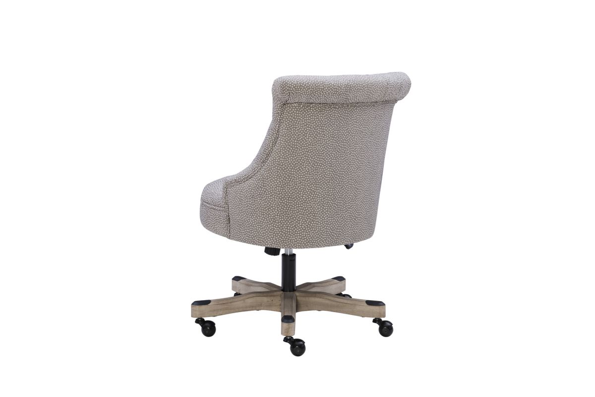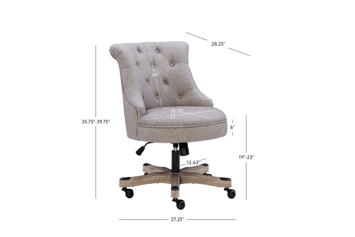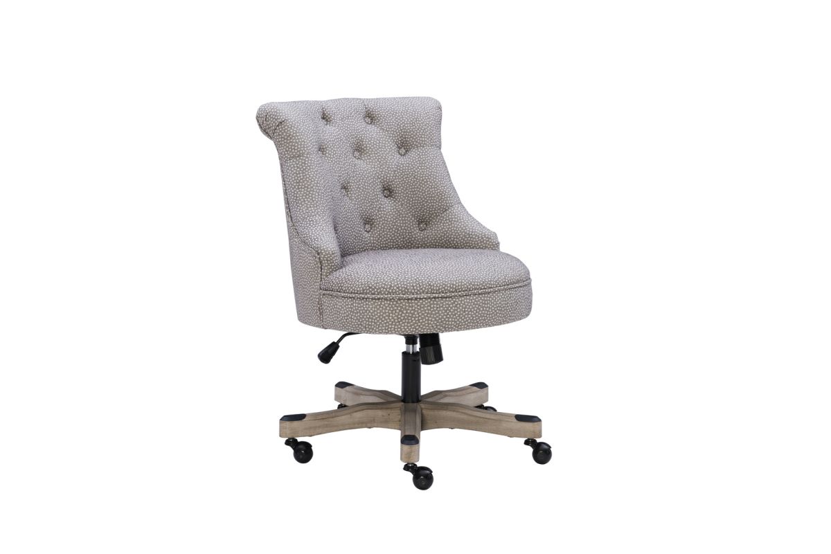 Add style and function to your office with this office chair. The soft, plush frame features a button tufted back and is upholstered in a light gray dot fabric. A washed wood base has metal casters for ease of mobility. Perfect for a home work space or the office.