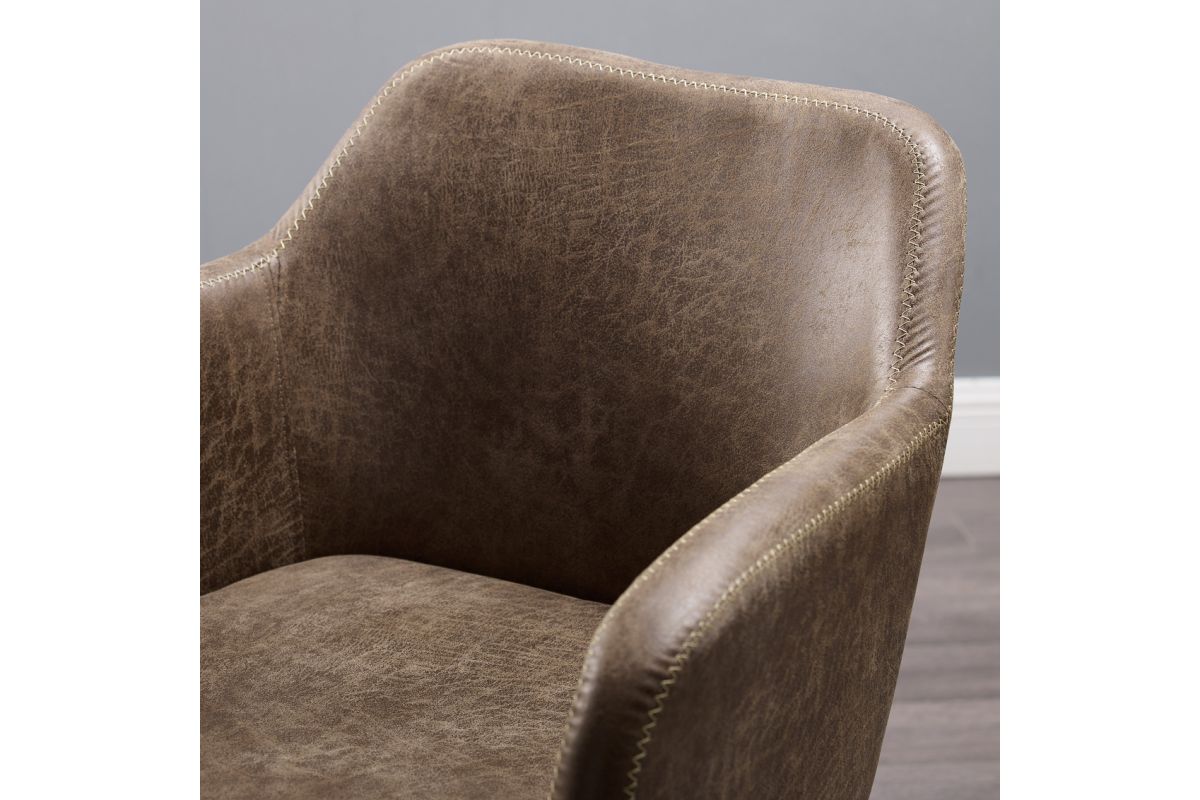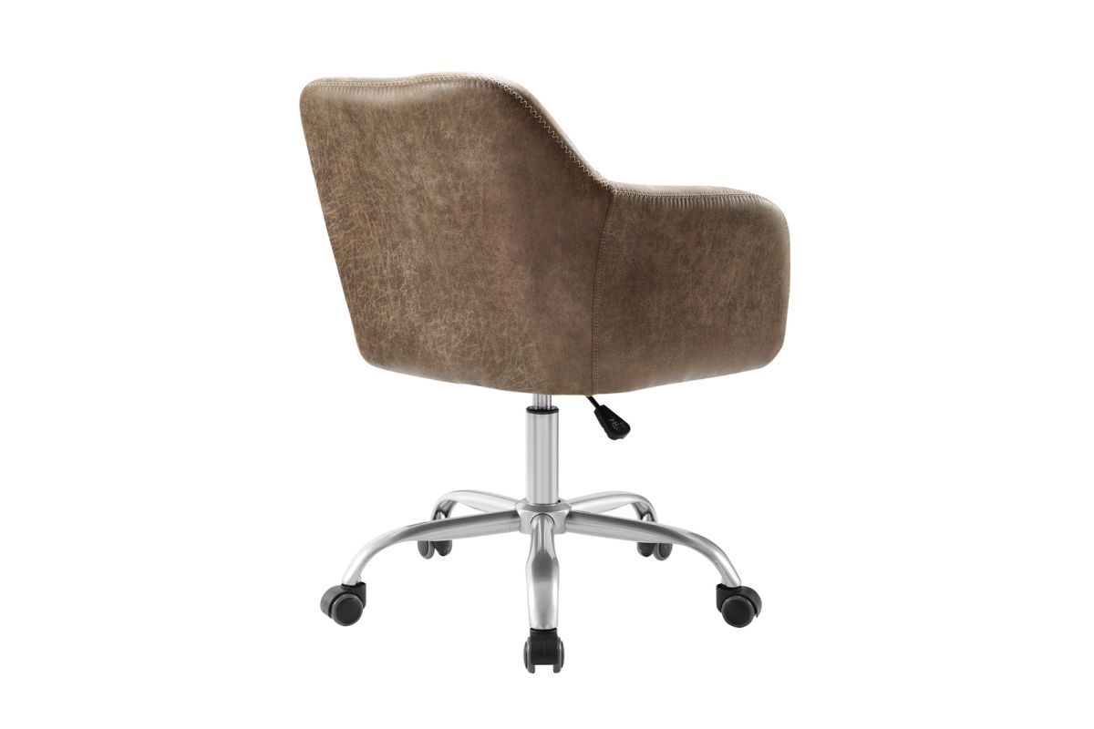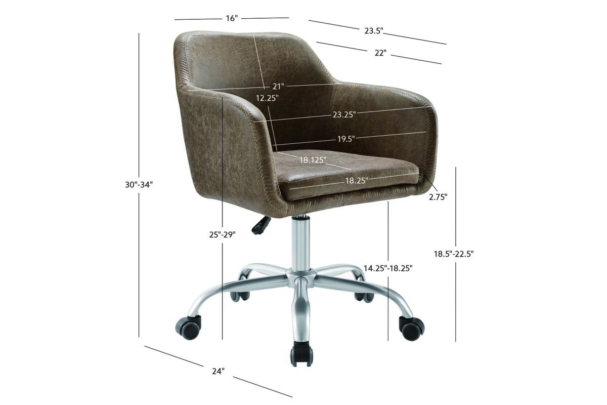 Add contemporary, masculine style to your workspace with this office chair. The wide back, high arms, and thick cushioned seat make desk work more comfortable. The adjustable seat allows the chair to work with a variety of desks and work tables, while the silver base and black wheels provide for smooth movement throughout your work area. The rustic brown fabric is accented with white zig-zag stitching.
