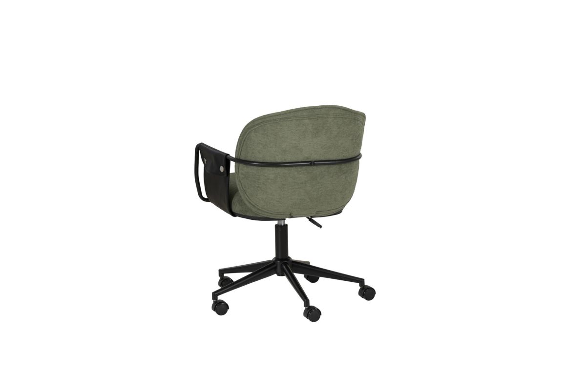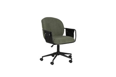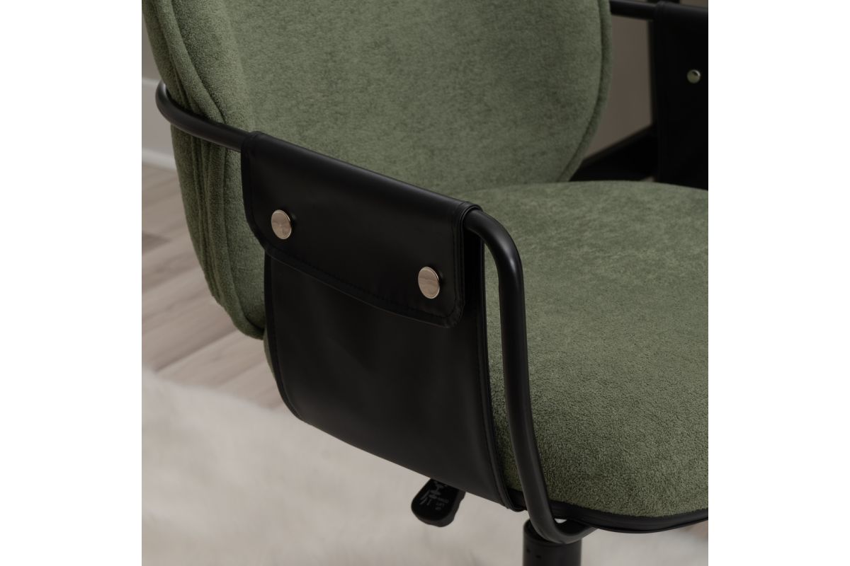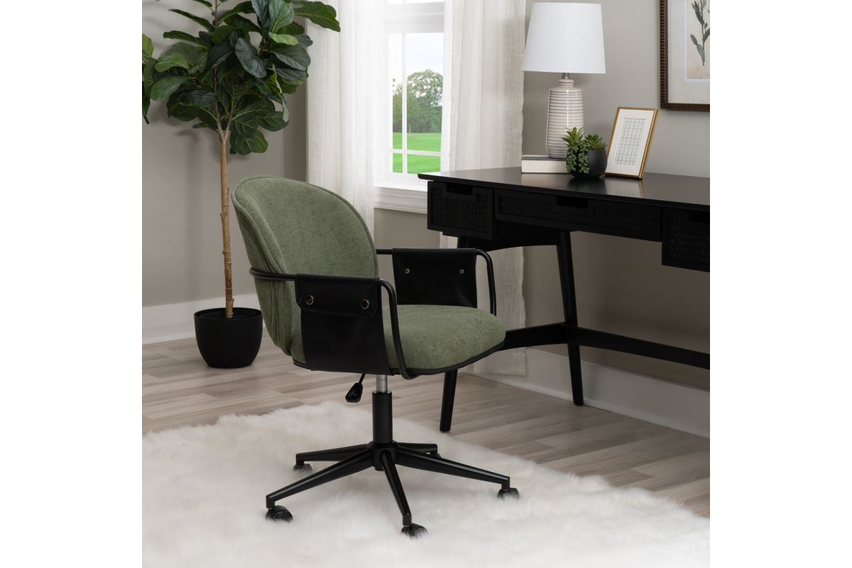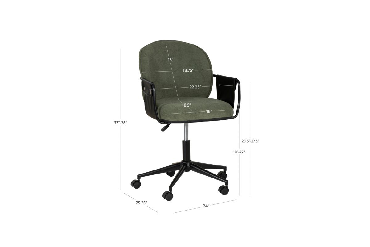 Elevate your workspace with this chic office chair, available in bold Black or sophisticated Olive Green. Designed for both style and comfort, it features 100% polyester upholstery accented by black buttoned faux leather straps on the arms for a touch of elegance. The gas lift allows easy height adjustments, while the smooth-rolling casters and sturdy powder-coated base ensure effortless mobility and lasting durability. Perfectly sized at 24"L x 25.25"D x 32"-36"H, this chair blends form and function for any office or home setup. Make every workday a little more comfortable, and a lot more stylish!