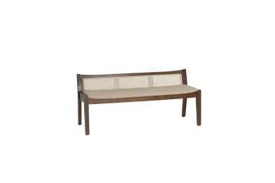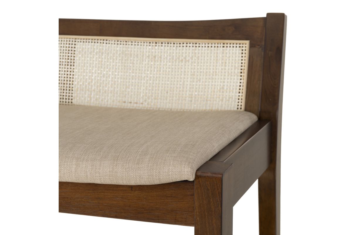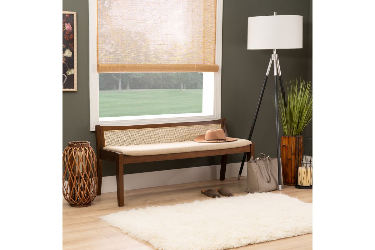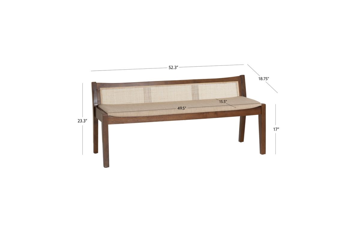 This rustic bench features a low-profile back with cane stitching and a padded seat in beige upholstery. Blending contemporary craftsmanship with idyllic charm, this minimalist piece says a great deal in few words. The supportive cushion is upholstered in a beige linen-look polyester fabric that is soft to the touch and a breeze to maintain. Solid rubberwood forms a strong and durable frame and is finished in a glossy natural stain that reveals traces of the beautiful woodgrain. Ideal for entryways, living rooms, bedrooms, mudrooms, and more, this bench will bring a refined yet inviting touch to any space.