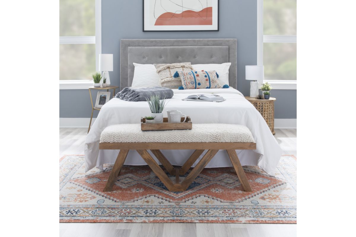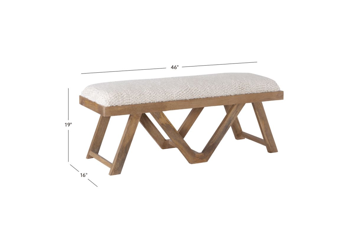 Enjoy the refined, yet light hearted aesthetic of this boho style bench, brought forward by a shaggy cushion and rustic wooden base. This comfortable perch is wrapped in white cotton and acrylic fabric, handwoven with a pit loom to create a thickness similar to that of a rug. In the supporting role is a sturdy brown frame made of mango wood that displays natural knots and grain patterns. All in all, the piece measures at 45" l x 16" d x 18" h, not too boxy, not too small; making it the perfect addition to your living room, bedroom, dining room or entryway.