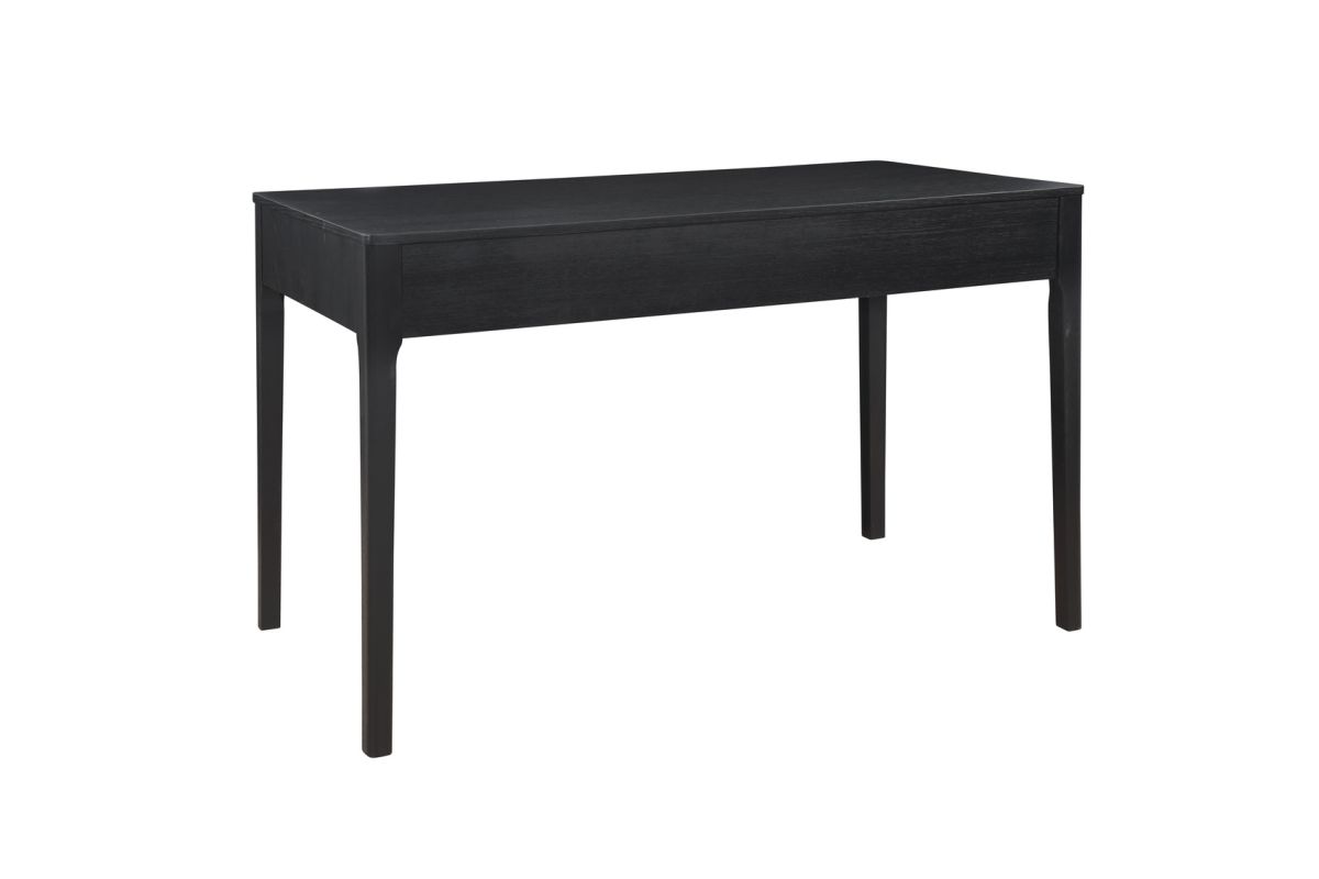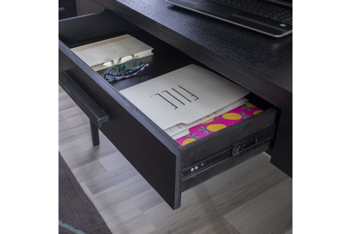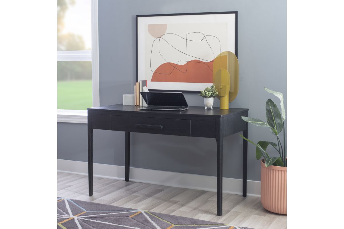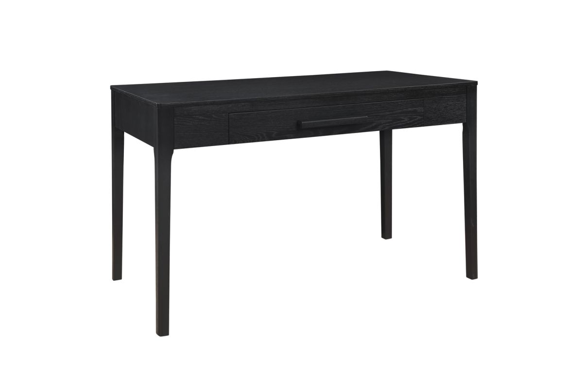 Lay the groundwork for efficient workdays with this simple, sturdy desk in all black. The streamlined silhouette hints at a midcentury modern aesthetic, while the oak veneers offer a dash of rustic charm. With a width of 48" and depth of 24", the tabletop with eased edges offers plenty of space to spread out papers and devices without overcrowding. To further lend a hand with organization, a single drawer runs on metal slides to provide a subtle storage option for a laptop or runaway writing utensils.