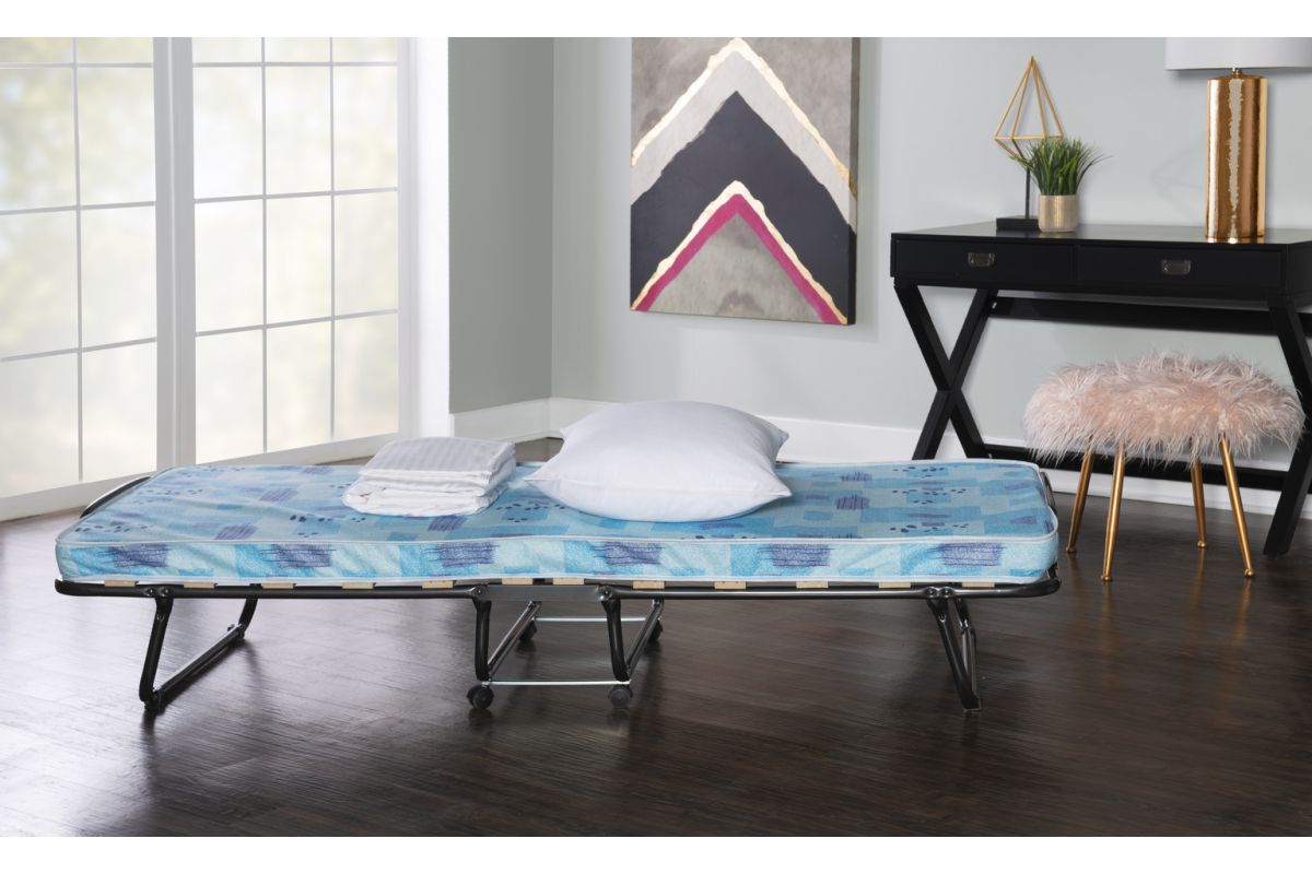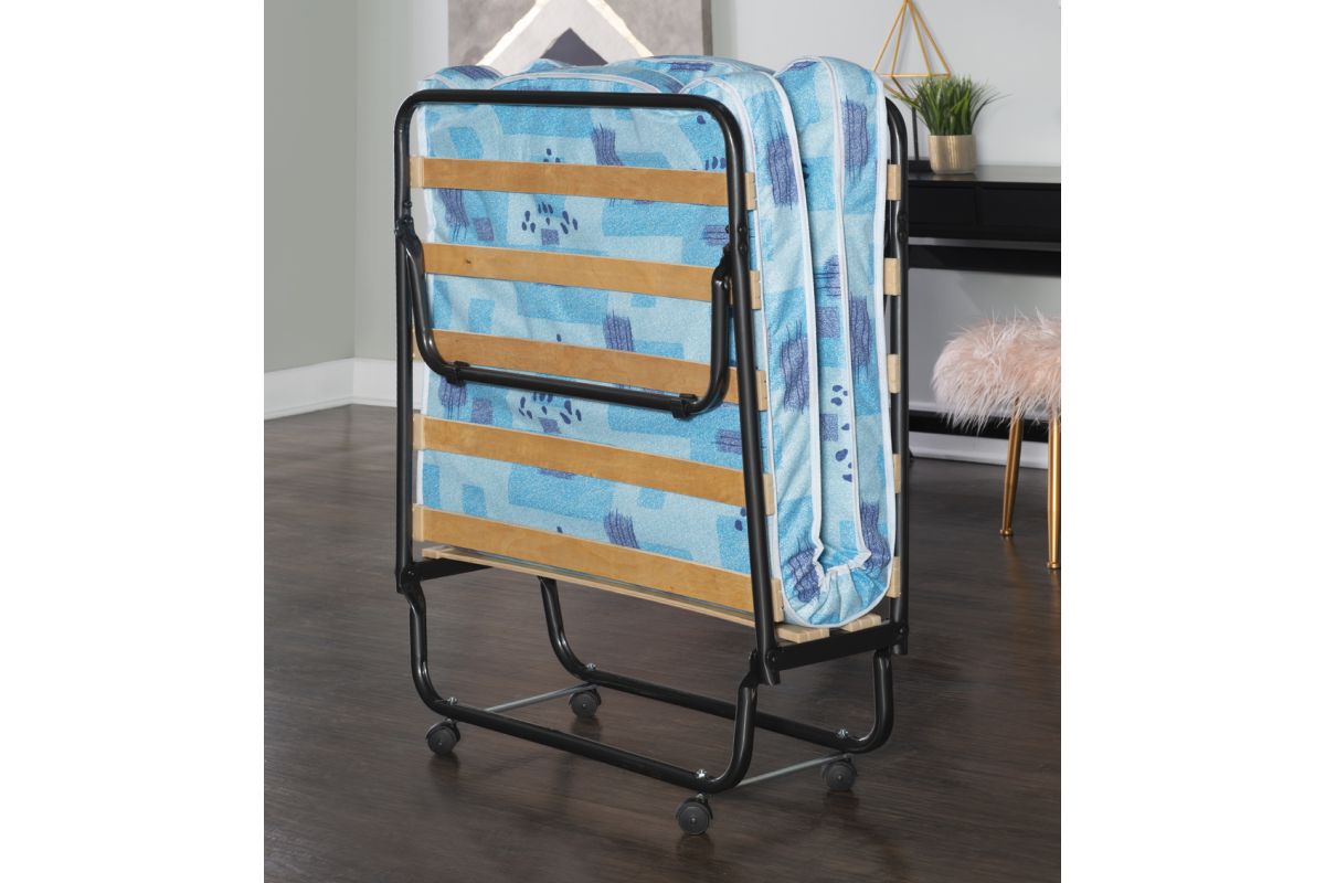 The ultimate folding bed, this folding bed with memory foam mattress is the perfect solution for overnight guests. Simple and easy to use, the bed sets up in mere seconds and provides guests with an ultra-comfortable, supportive memory-foam topped mattress for a restful night's sleep. Wood slats and a steel metal frame provide for stability and durability while four casters make mobility easy. When not in use, the bed is compact enough to store away in almost any closet. Use as a convenient and cozy guest bed, kid's bed, day bed, or lounger.