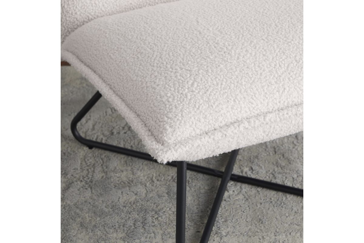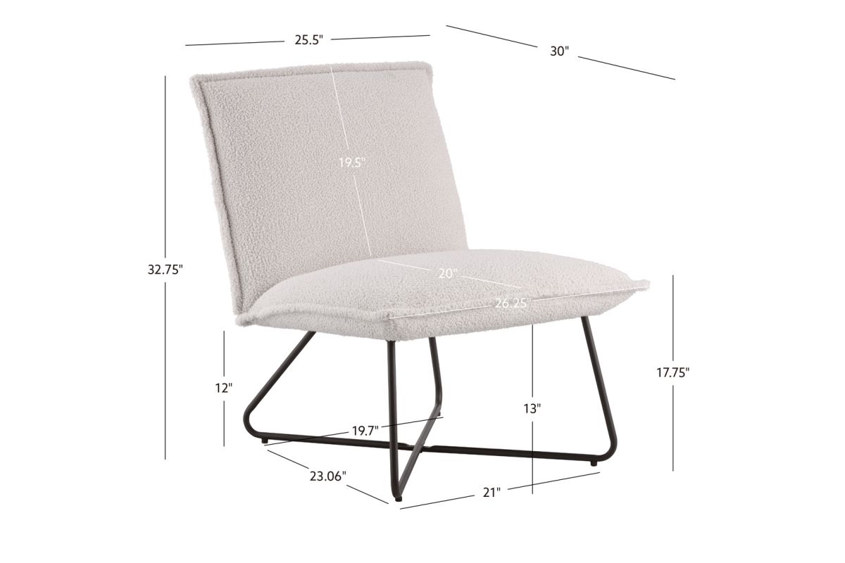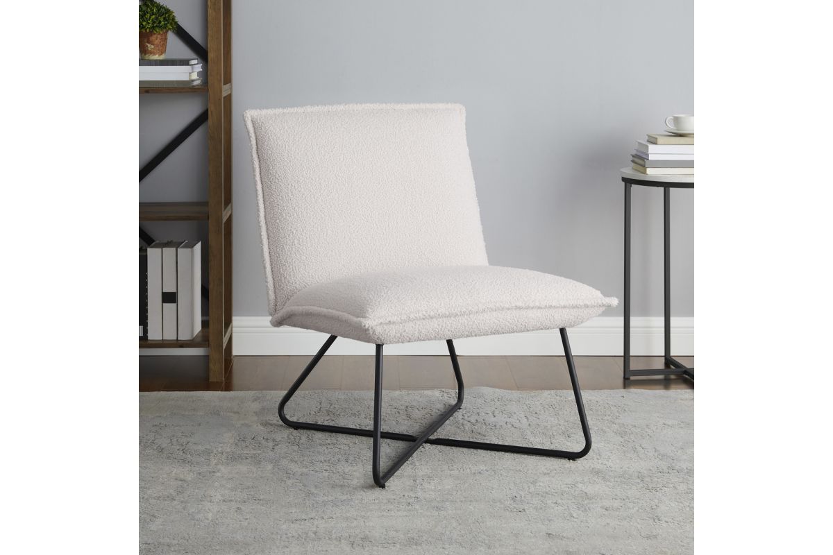 Casual comfort with sophisticated styling. Just the right amount of pillow softness floating on a sturdy metal wire base. Upholstered in a naturally comfy faux sherpa fabric. Legs are in powder coated in black with floor protecting pads. Great in any youth or adult bedroom, in a family room or wherever. Destined to become your favorite chair to curl up with a good book.