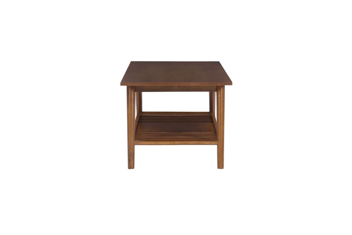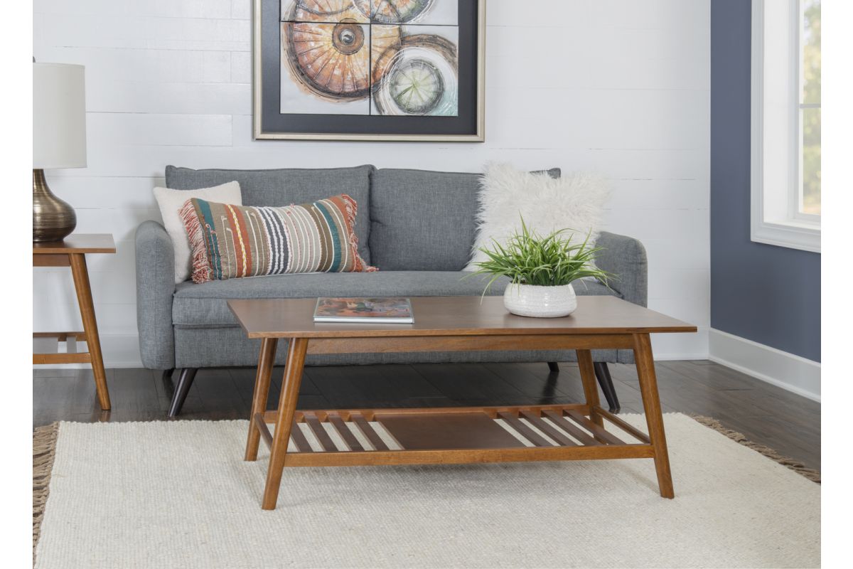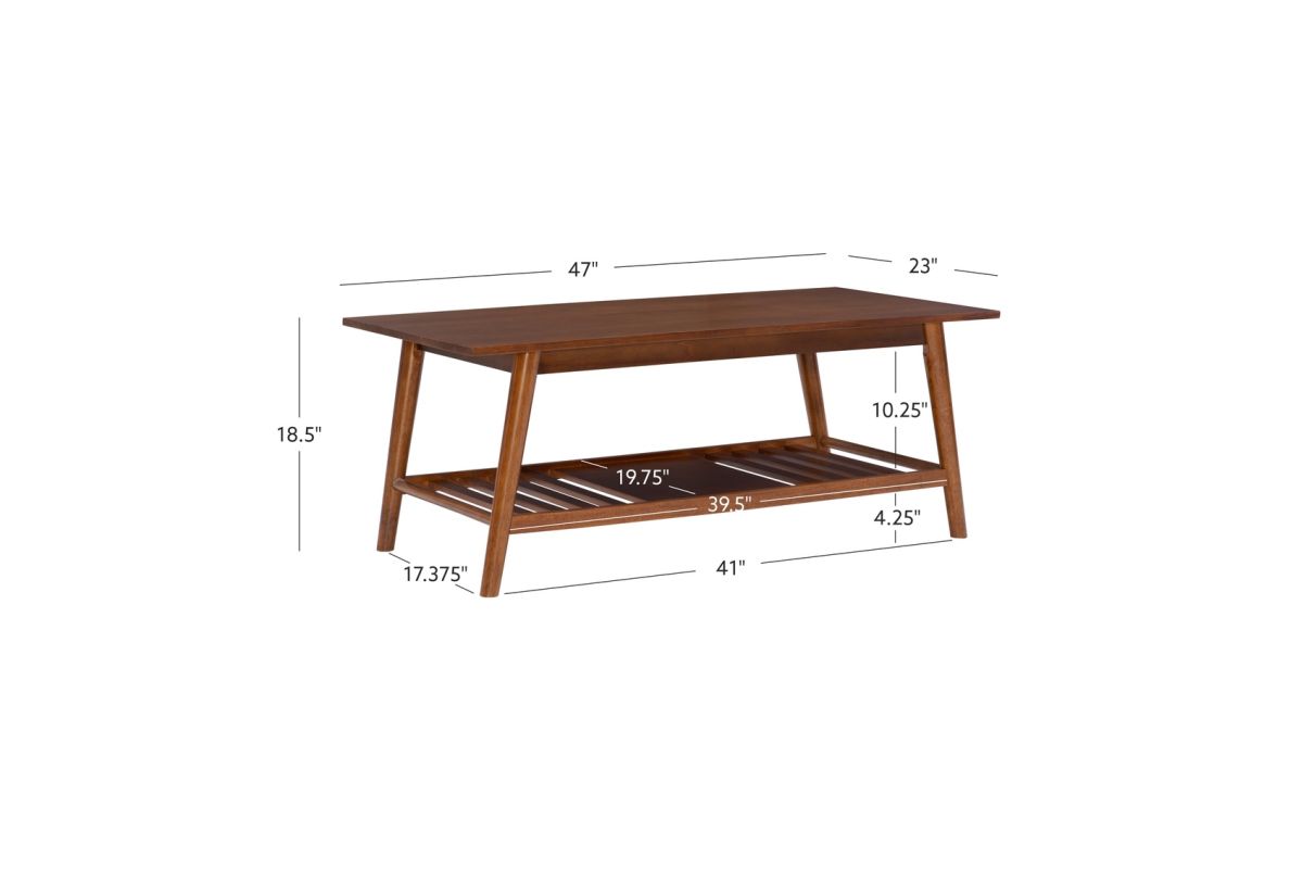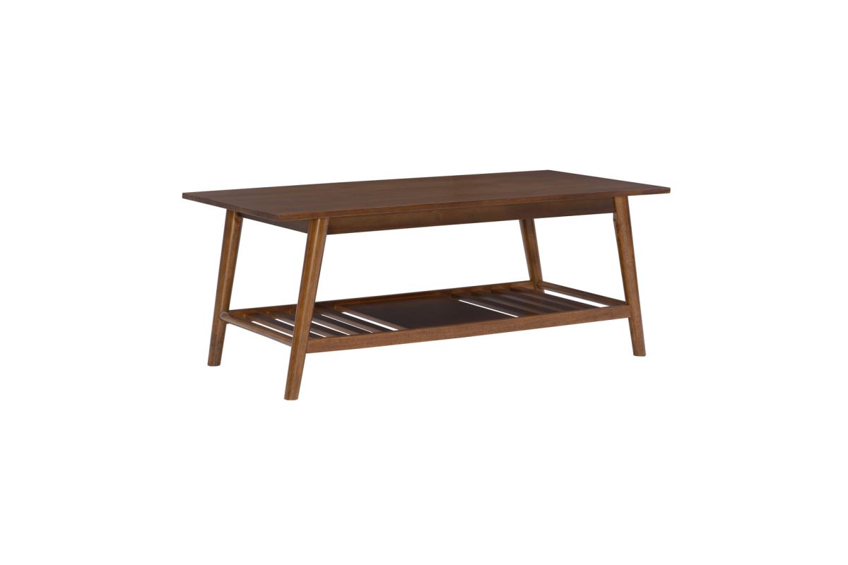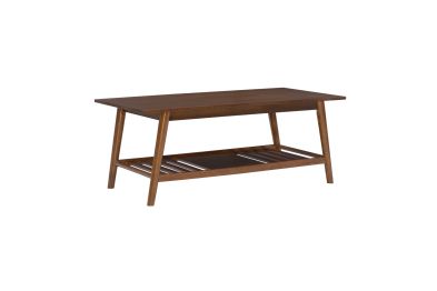 Add style and warmth to any living or sitting area with this modern, midcentury coffee table. Its rich walnut finish adds warmth to rounded, angled legs and a wide, smooth top. The slatted bottom shelf offers bountiful space to store games and books or display a decorative item. At home in front of a sofa or set of chairs, this fashionable, durable coffee table will provide many years of use with friends and family. Make a signature design statement with similar pieces in this collection.