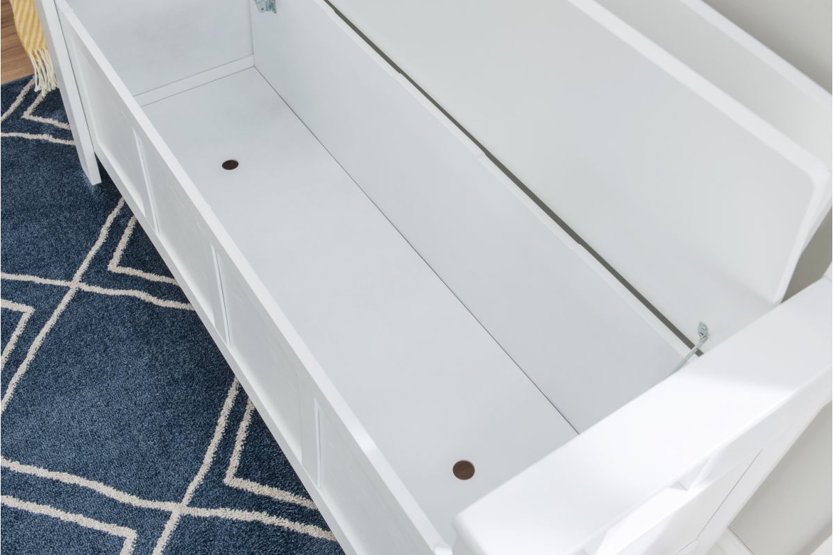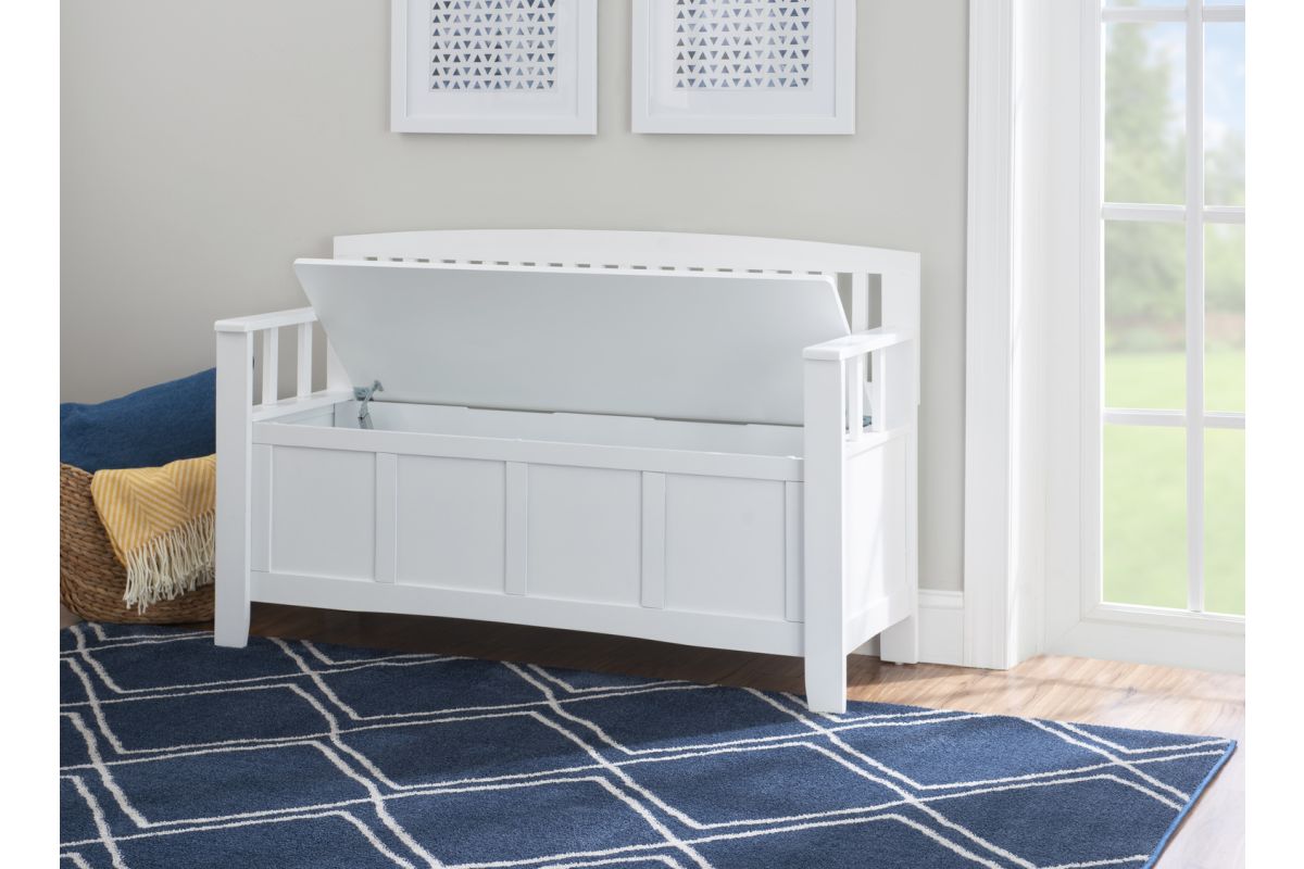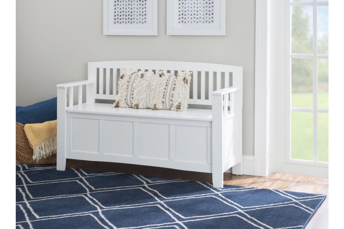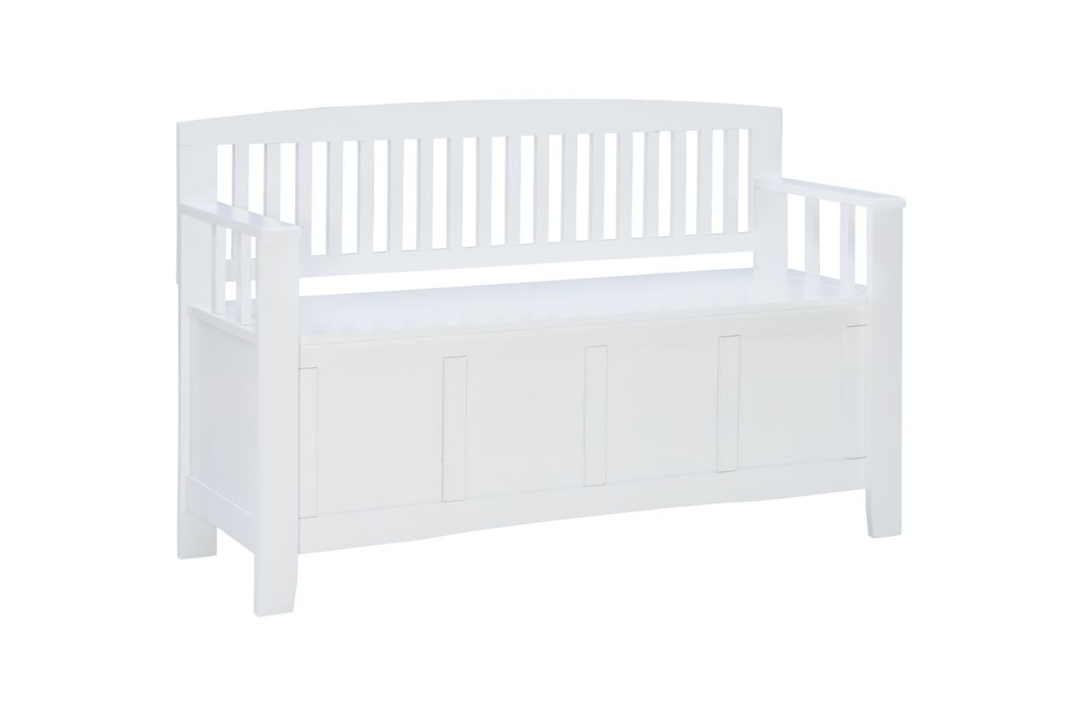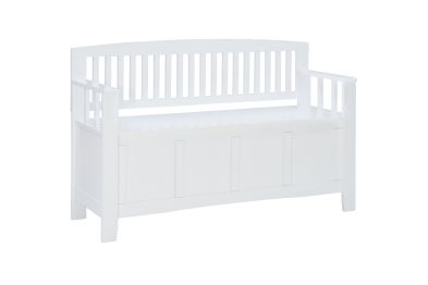 Create added seating and storage to your entry way, mudroom, bedroom or living room with this attractive and sturdy storage bench. The bench features a flip top lid with no-slam hardware, allowing for easy access to items you want out of sight. The slat designed back and armrest are finished in a glossy white paint allowing it to be used with virtually any decor. Add a colorful seat cushion or your favorite accent pillows to brighten up the room.