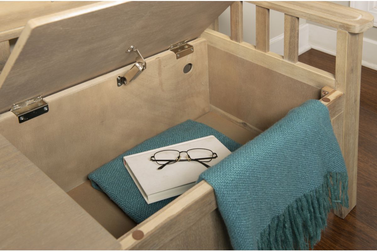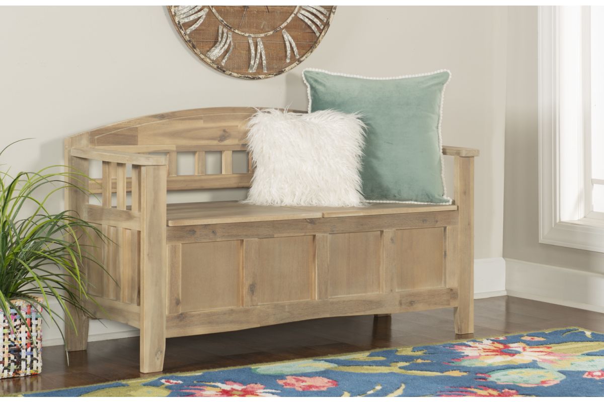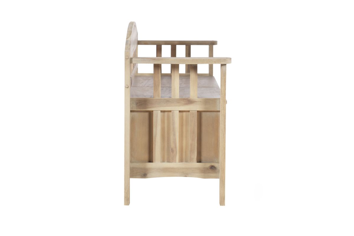 Update your home with a rustic look with this storage bench. Perfect for adding to an entryway, hall or mud room, the bench features a split seat design. Storage beneath the seat is ideal for keeping coats, shoes and bags hidden. The natural washed finish allows the piece to blend seamlessly into any home.