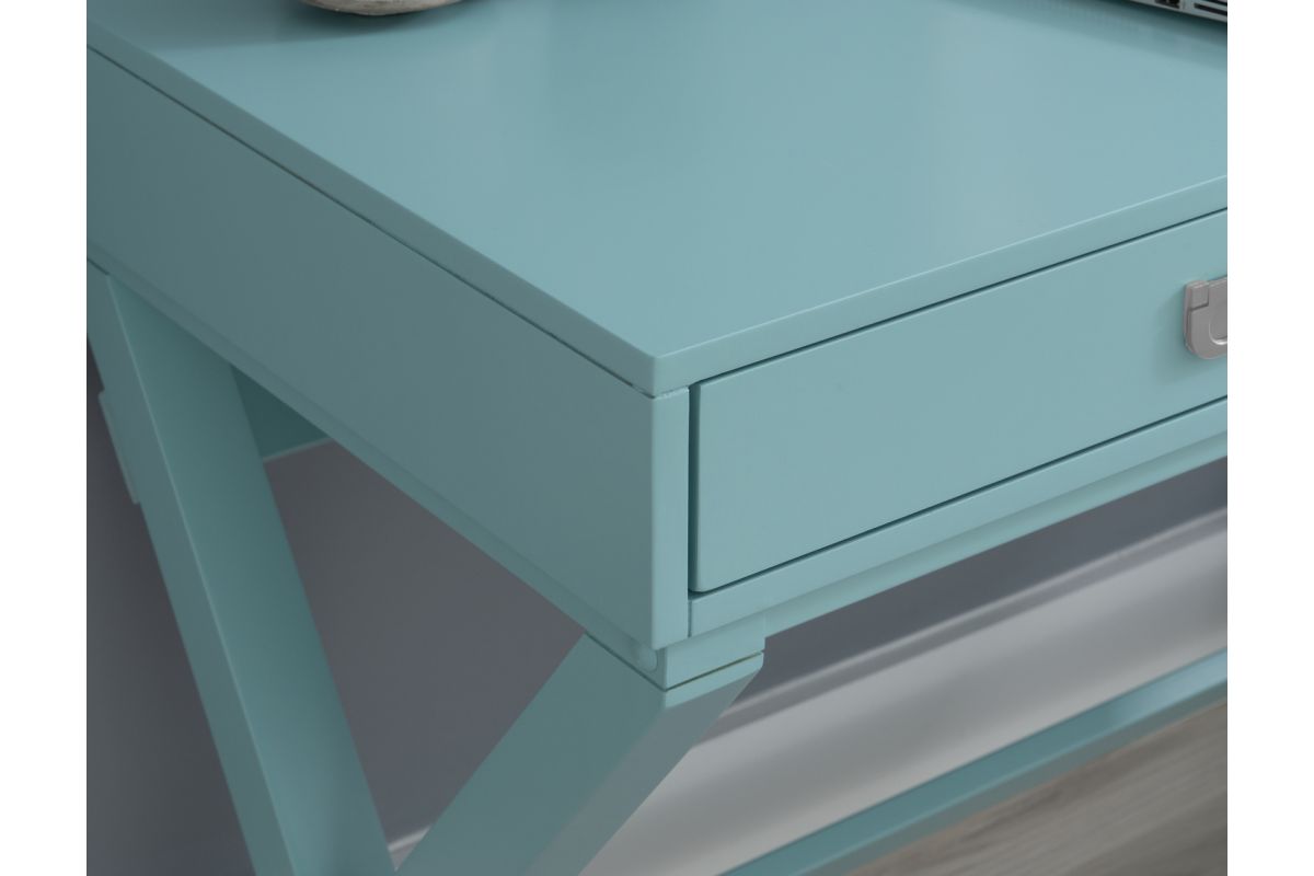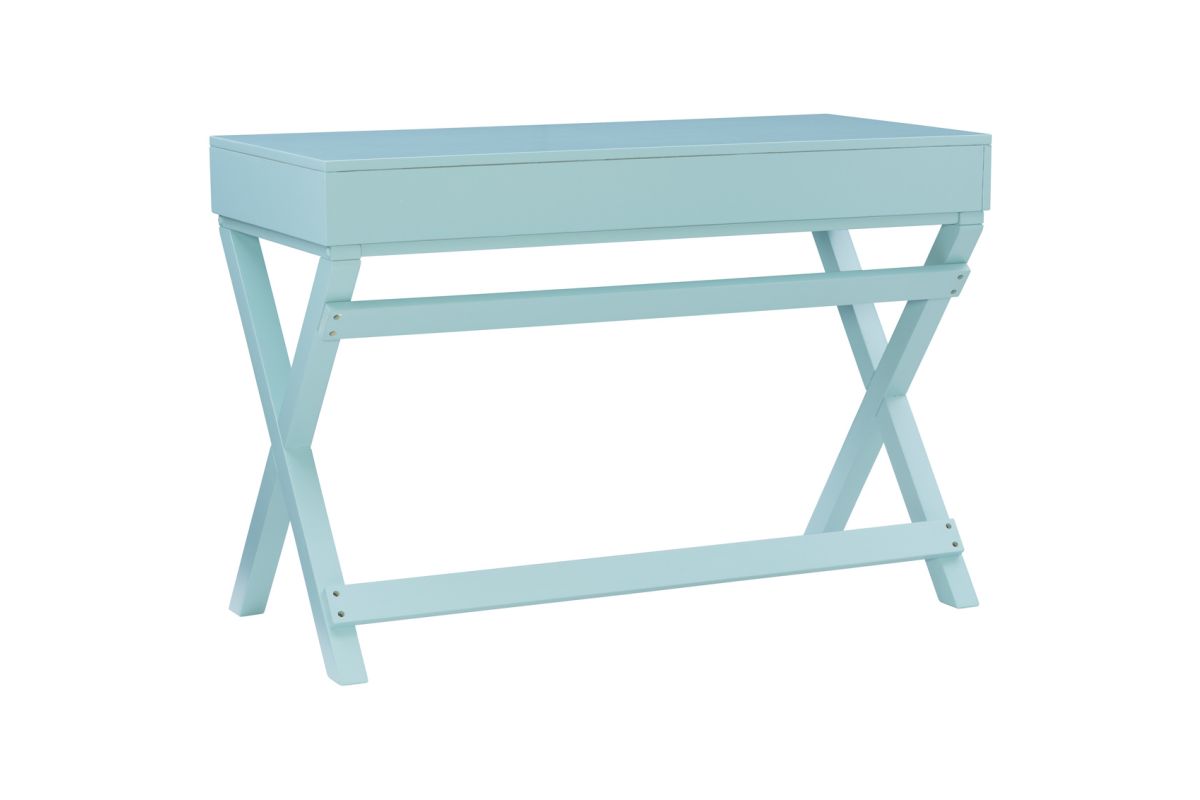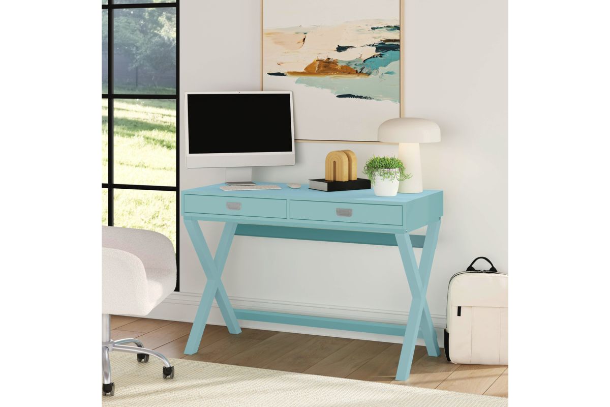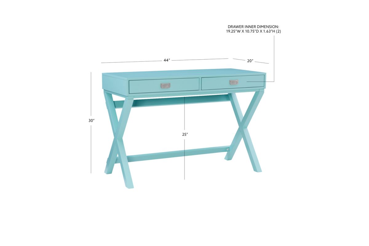 Make work fun with this campaign style writing desk. Finished in bright blue with silver hardware, this desk will add color and life to any space. The x-framed legs provide a study foundation for a work space. Two drawers provide ample space for supplies.