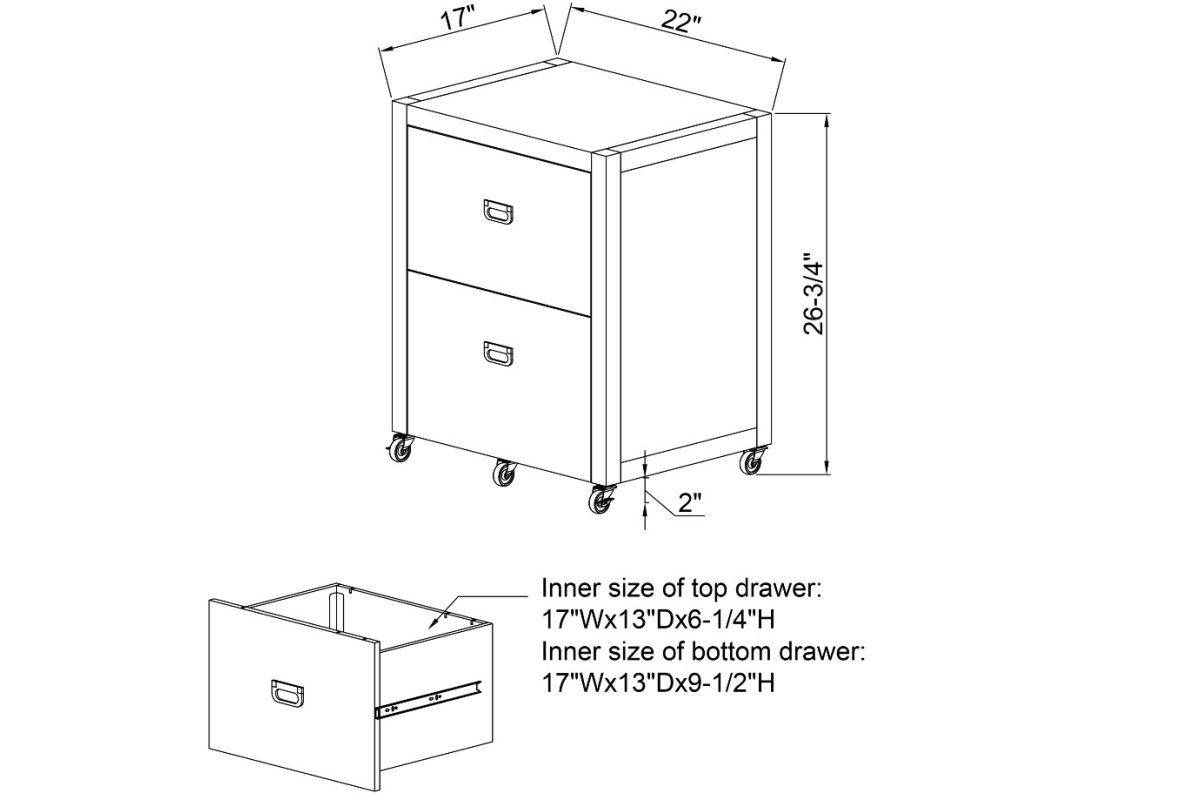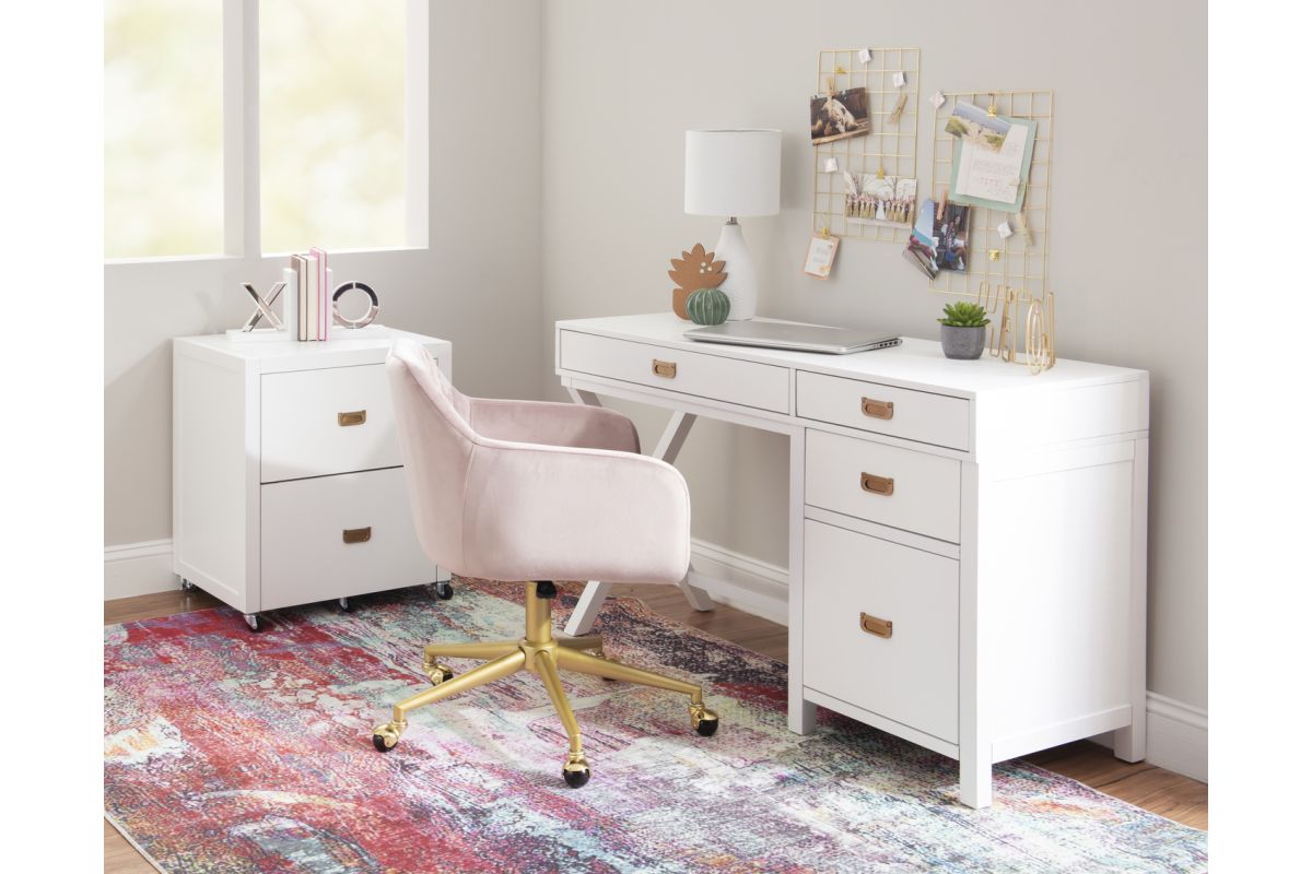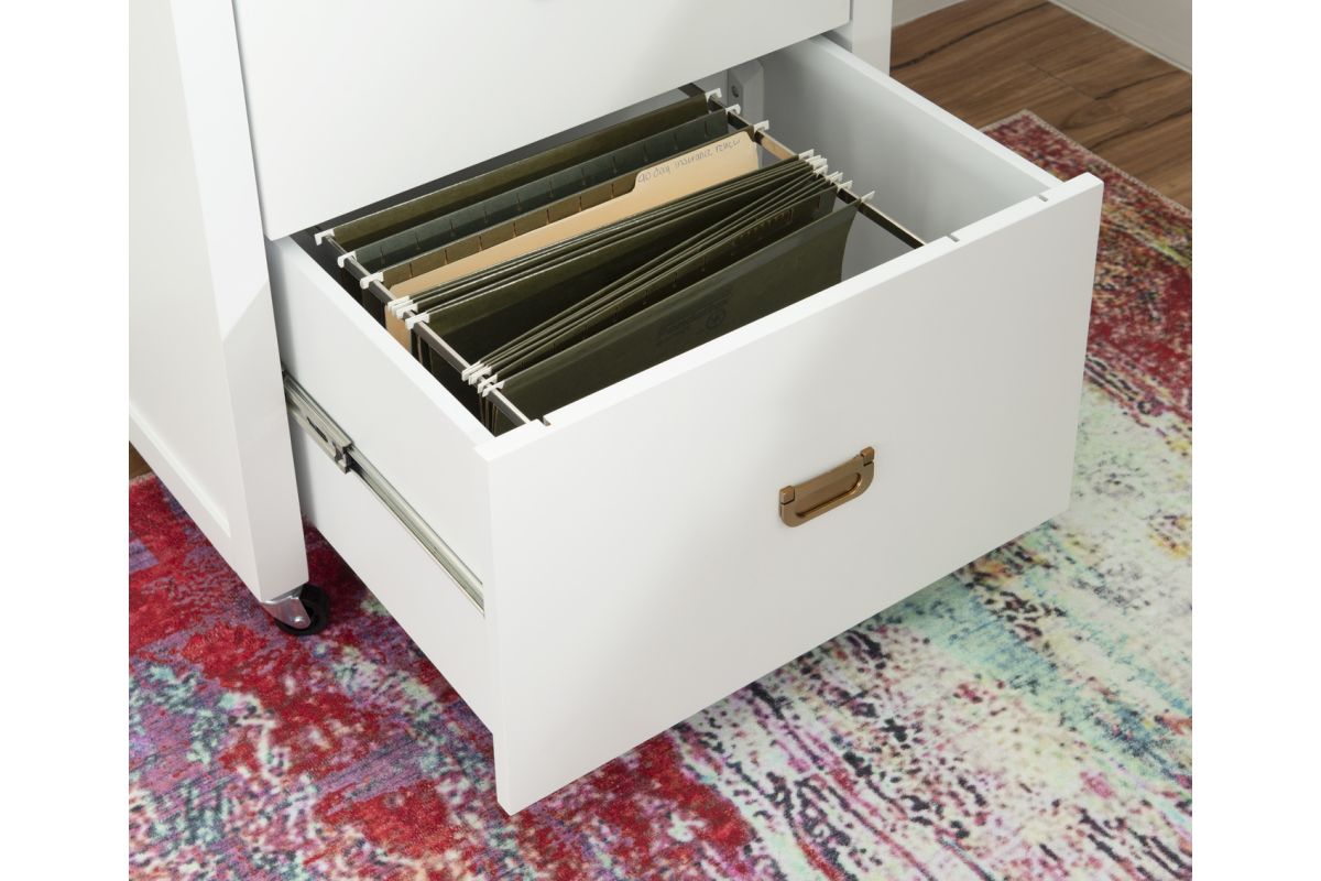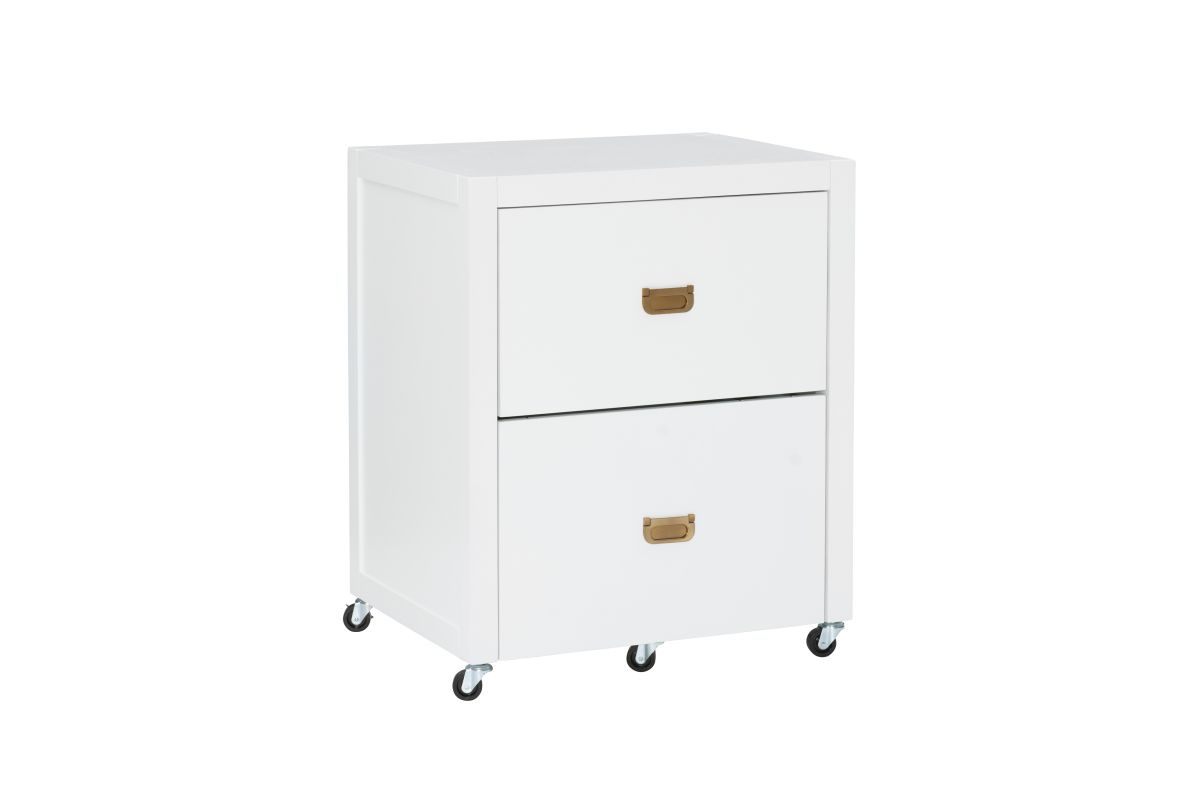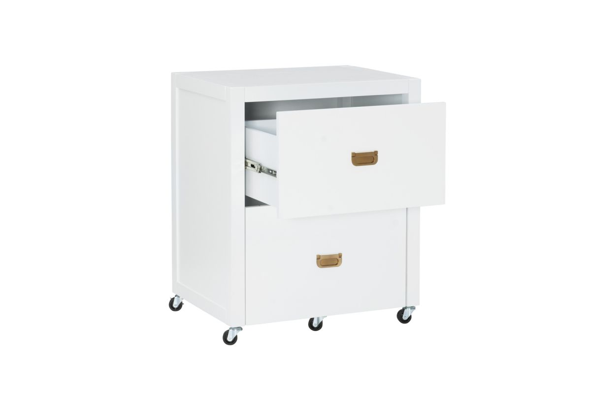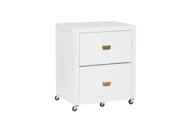Get organized with this handy two drawer filing cabinet. Rolling and locking casters allow for mobile storage, while metal drawer glides and shiny rose gold campaign style handles provide easy access to documents. Standing at 26.75" High and 22" deep, this cabinet is easy to tuck into a corner and acts as the perfect stand for a printer. The bottom drawer is designed for standard or legal sized filing and the top is convenient for miscellaneous supplies. A clean white painted finish pairs well with any home decor style.