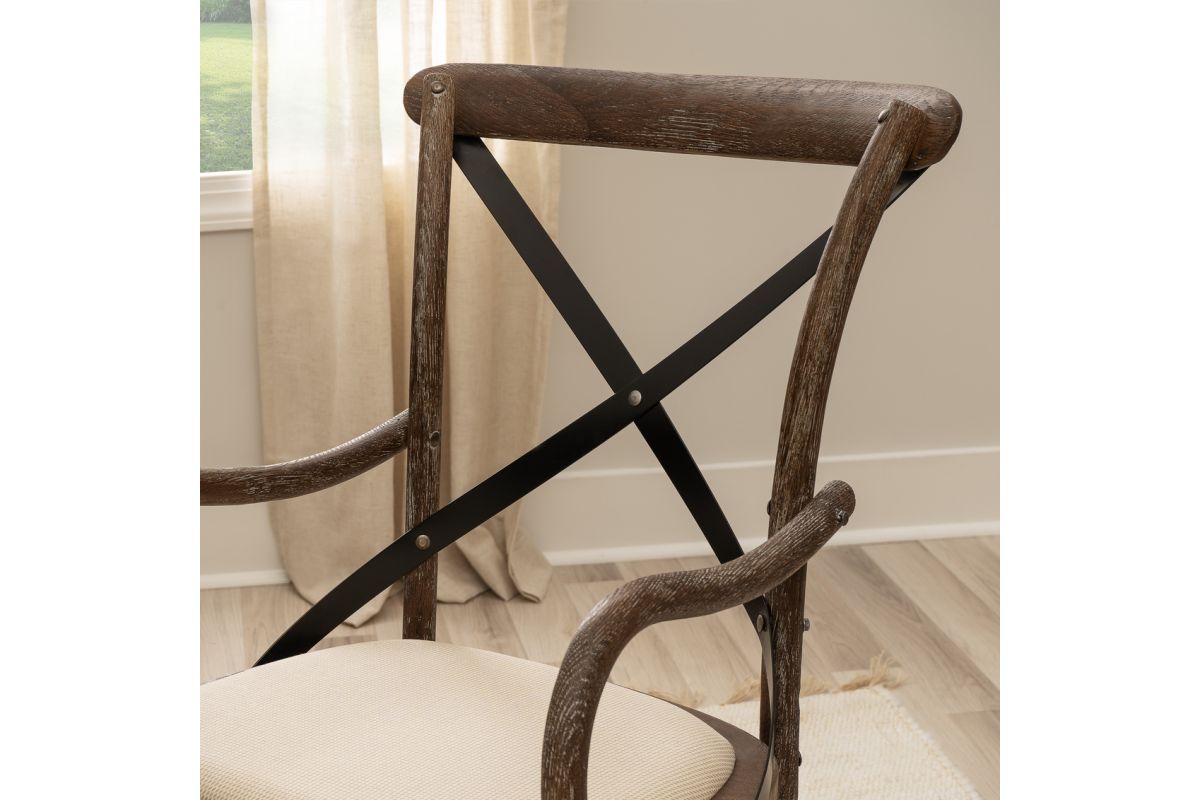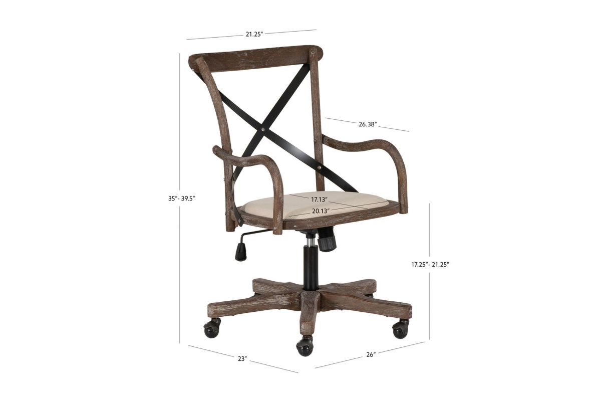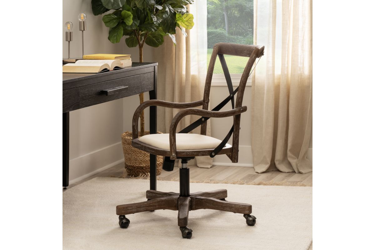 Add stylish seating to your workspace with this bentwood office chair. The gray-washed wood finish is accented by a black metal x back and neutral fabric seat. Antique brass casters make for easy mobility around your office. The adjustable seat height allows the chair to easily work with a variety of desk and table heights. Perfect for any home workspace or office.