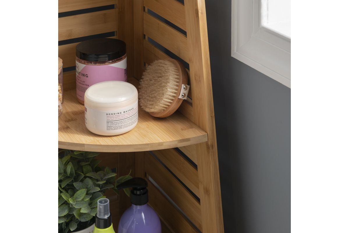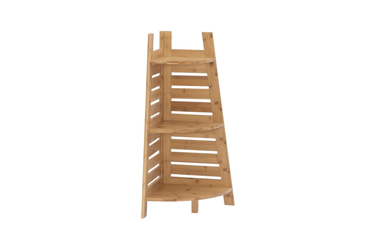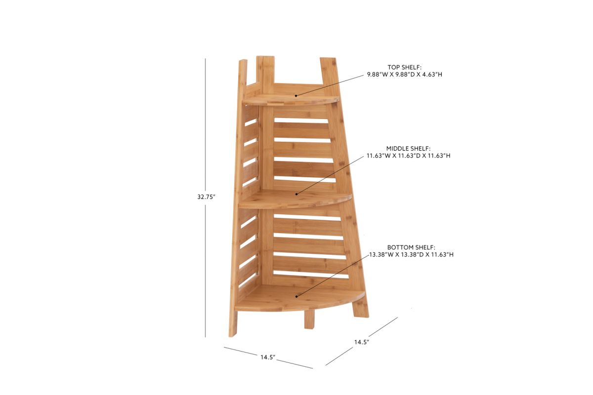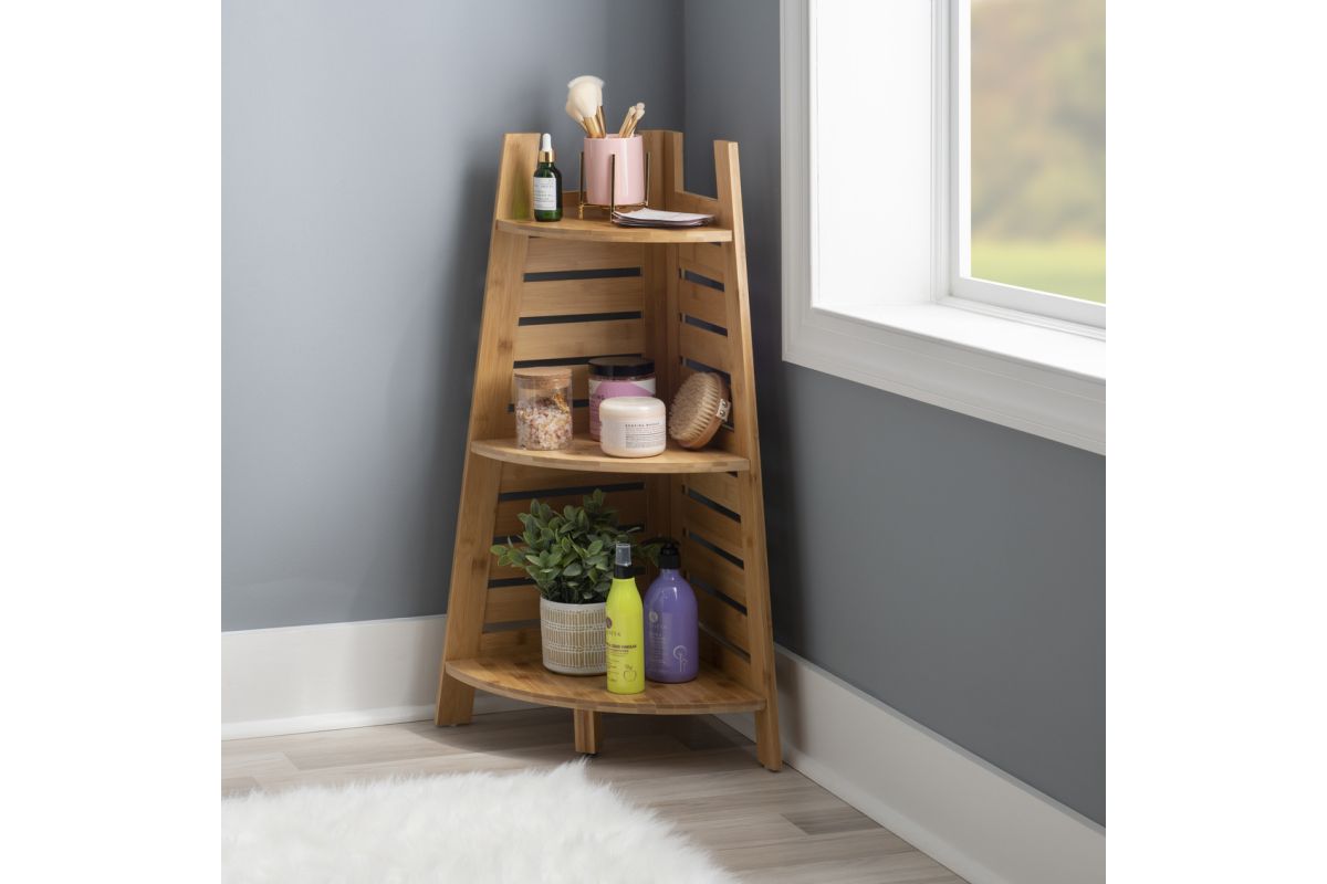This bamboo corner shelf is perfect for adding storage to small spaces without occupying floor space. Three shelves provide ample space to store and display essentials. Crafted from solid bamboo, the piece is both sturdy and durable.