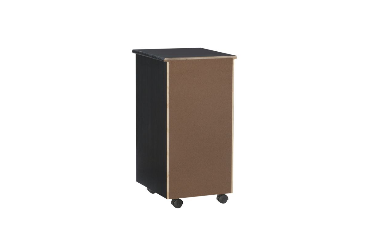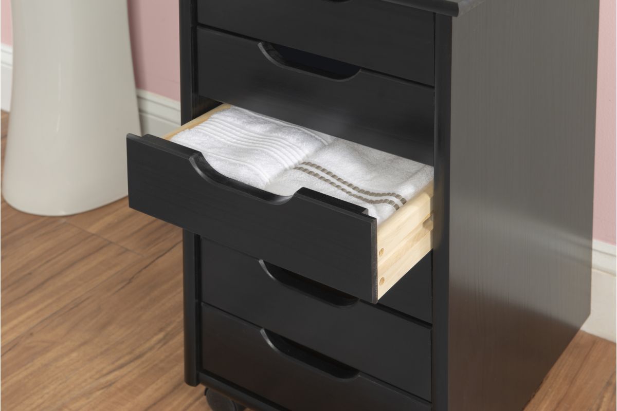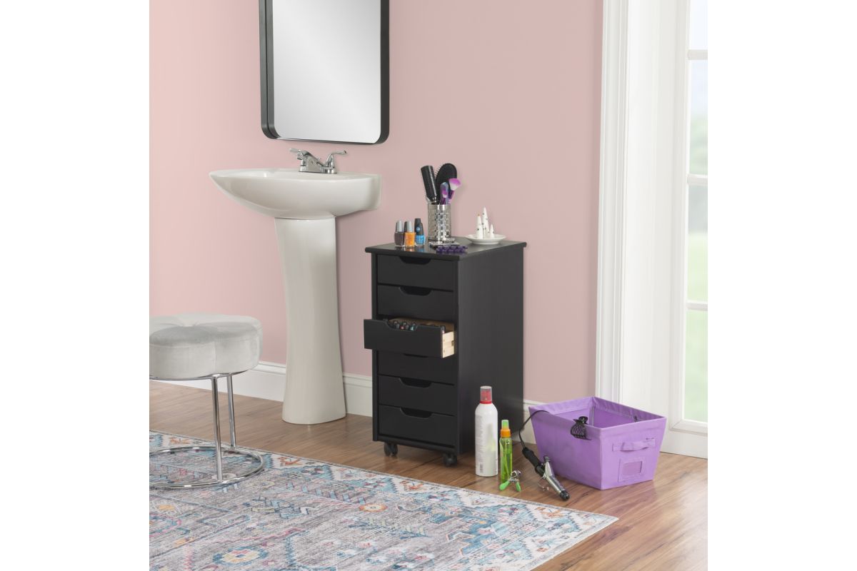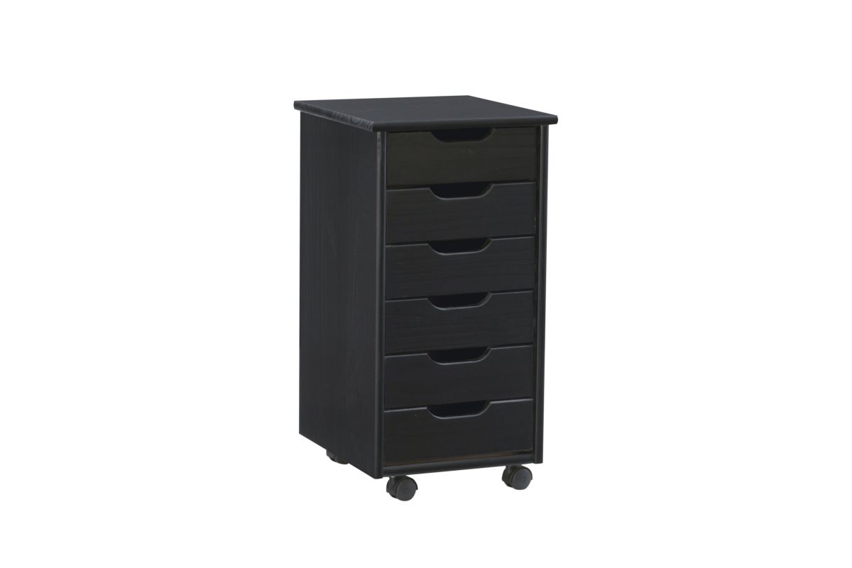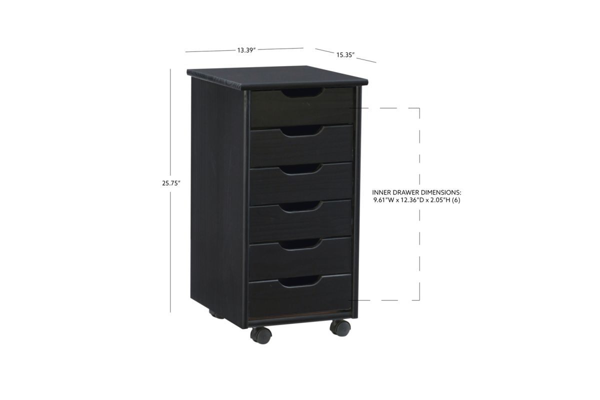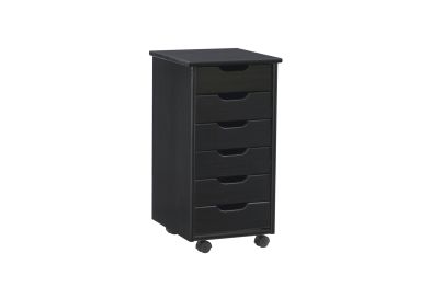 This six drawer rolling storage cart is a versatile storage solution for office, kitchen, bedroom or anywhere where organization is needed. In a rich black finish that will allow this mobile piece to blend into any decor. Six equal size drawers and an ample top can go next to a desk or craft table to put items within reach. Soft contoured handle cut out is easy on the touch and creates a clean, modern look. Drawers can be easily removed and used as a tray to transport your items to your workspace. Casters make this piece mobile to go into any room easily.