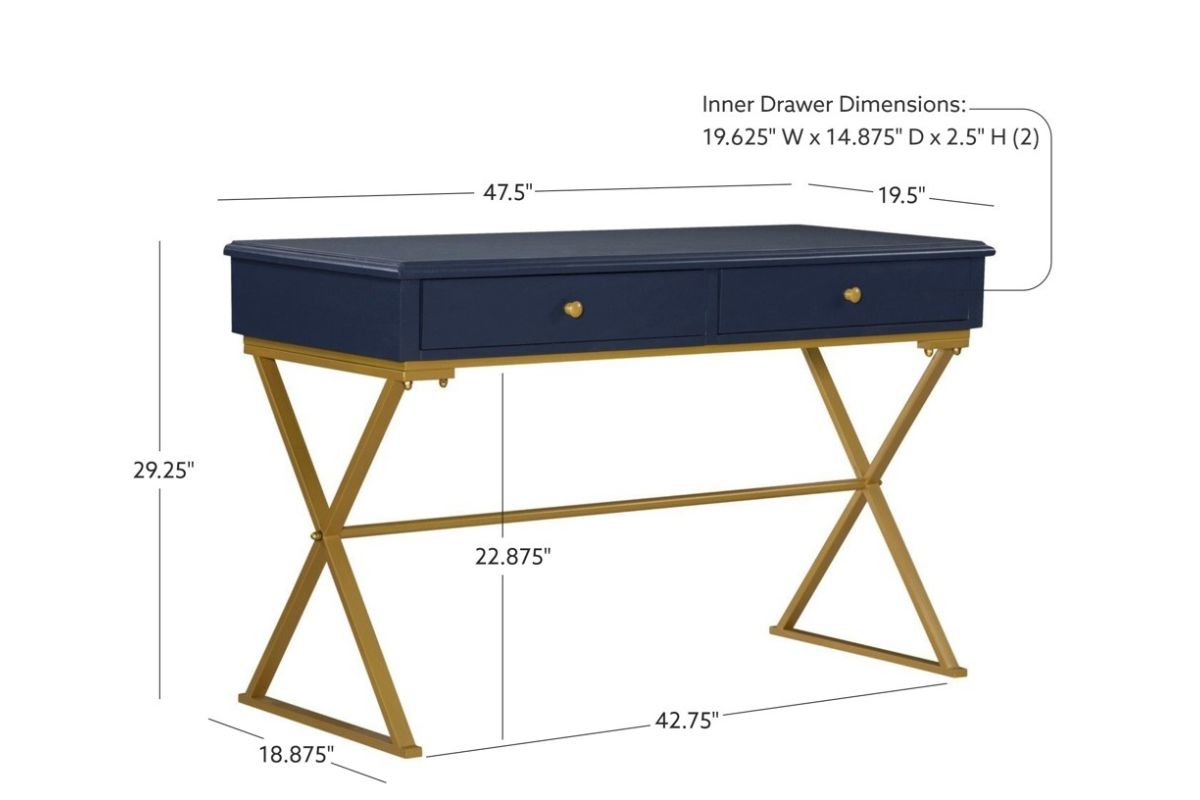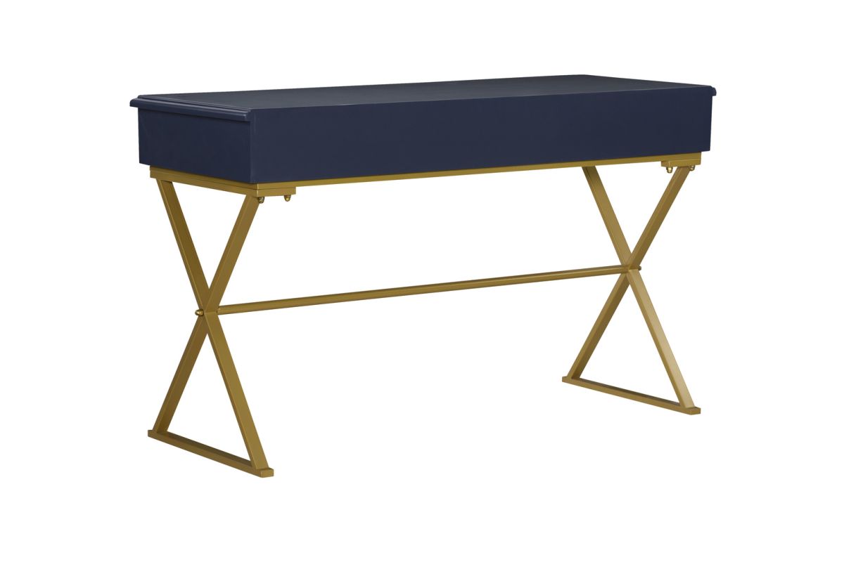 Work in style on the blue and gold campaign desk. The spacious top has a rich blue finish accented by the "x" styled matte gold legs. Small round gold knobs grace the front of the large storage drawer. Perfect for adding a pop of color and unique style to your office.