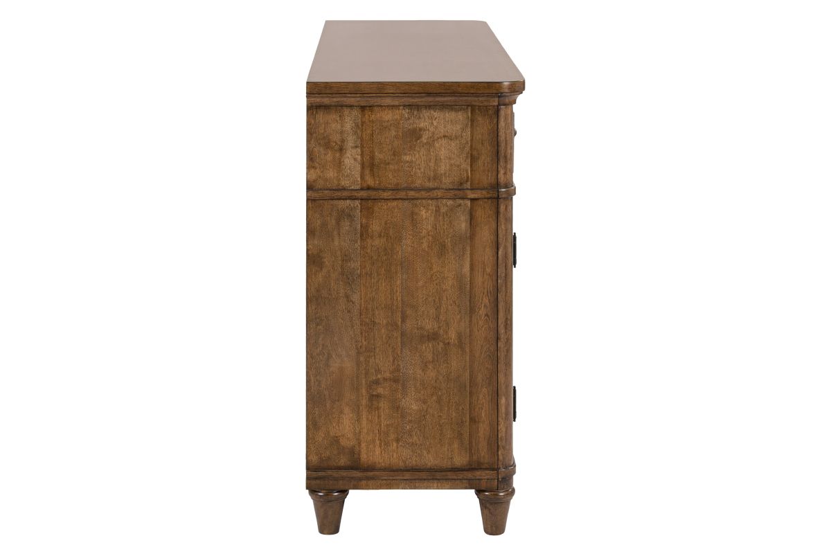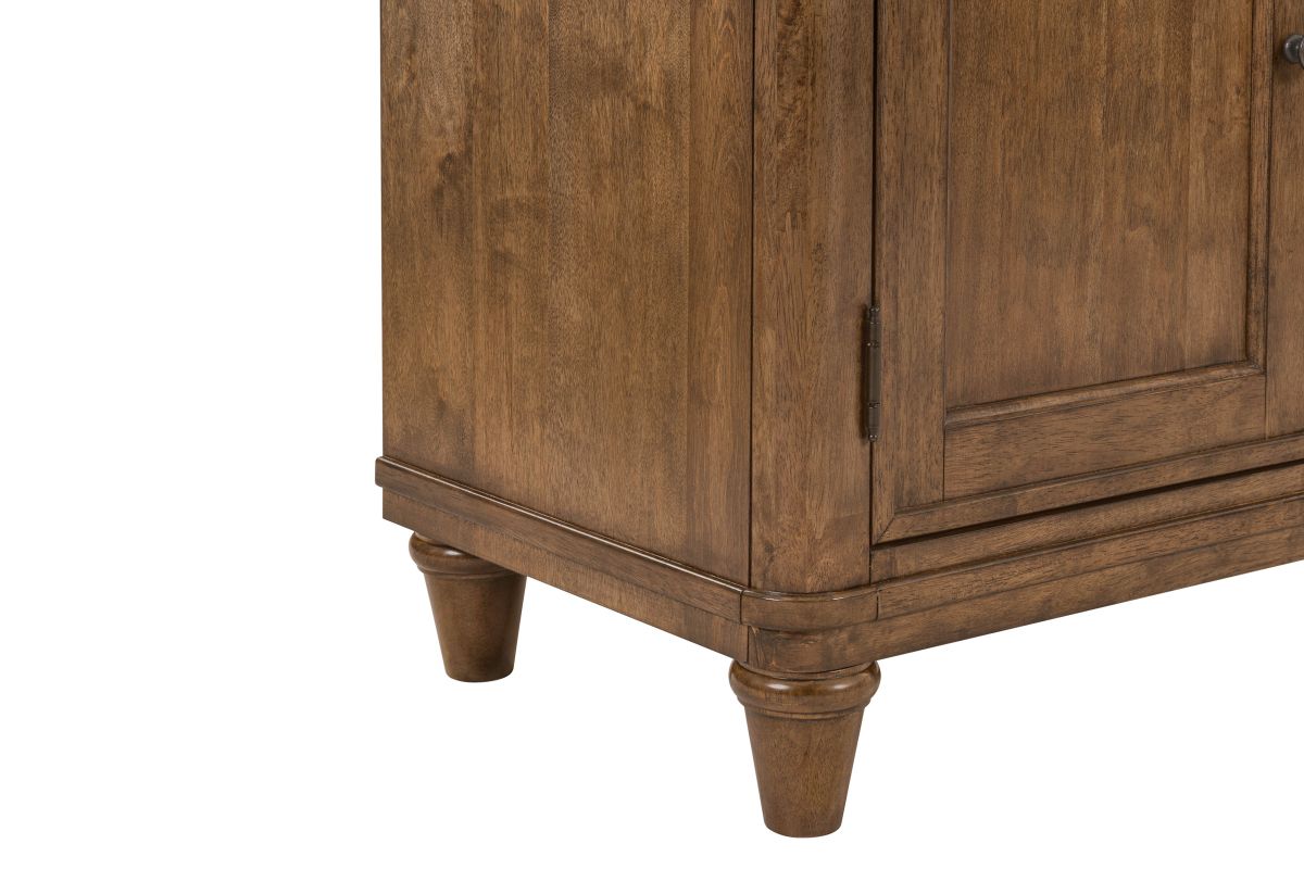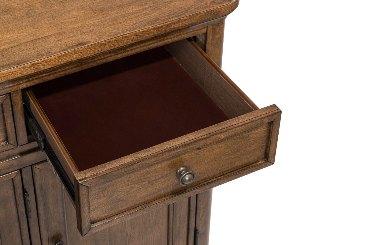 The Tuscany Collection brings timeless design and thoughtful craftsmanship to your dining space. Featuring softly rounded corners, saber chair legs, and subtle wood frame accents, each piece is rich in detail and comfort. Premium touches like antique brass knobs, felt-lined top drawers, and a removable silverware tray enhance function and elegance. A self-storing 18-inch leaf with an easy-glide track system and 4-way matched fancy face veneer add both beauty and versatility to every gathering.