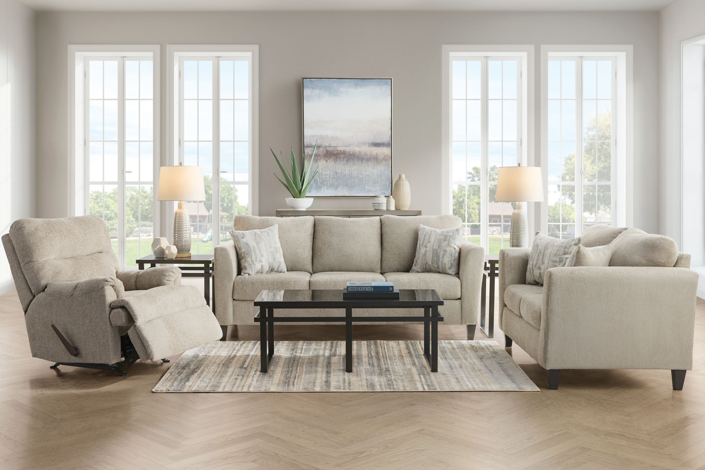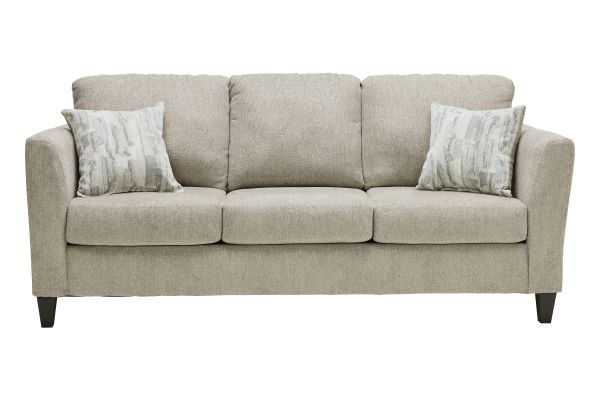 Create a space where comfort meets connection with the Benny. Draped in a soft, textured fabric in a soothing neutral tone, this collection exudes understated elegance while inviting you to unwind and stay a while. With gently flared track arms, plush back cushions, and generously padded seats, each piece offers the perfect balance of support and sink-in comfort. Decorative throw pillows in modern patterns add a touch of elegance and softness, making this set as stylish as it is welcoming. Whether you're entertaining loved ones or unwinding after a long day, the Benny Collection wraps you in comfort and sets the stage for life’s beautiful, everyday moments.
