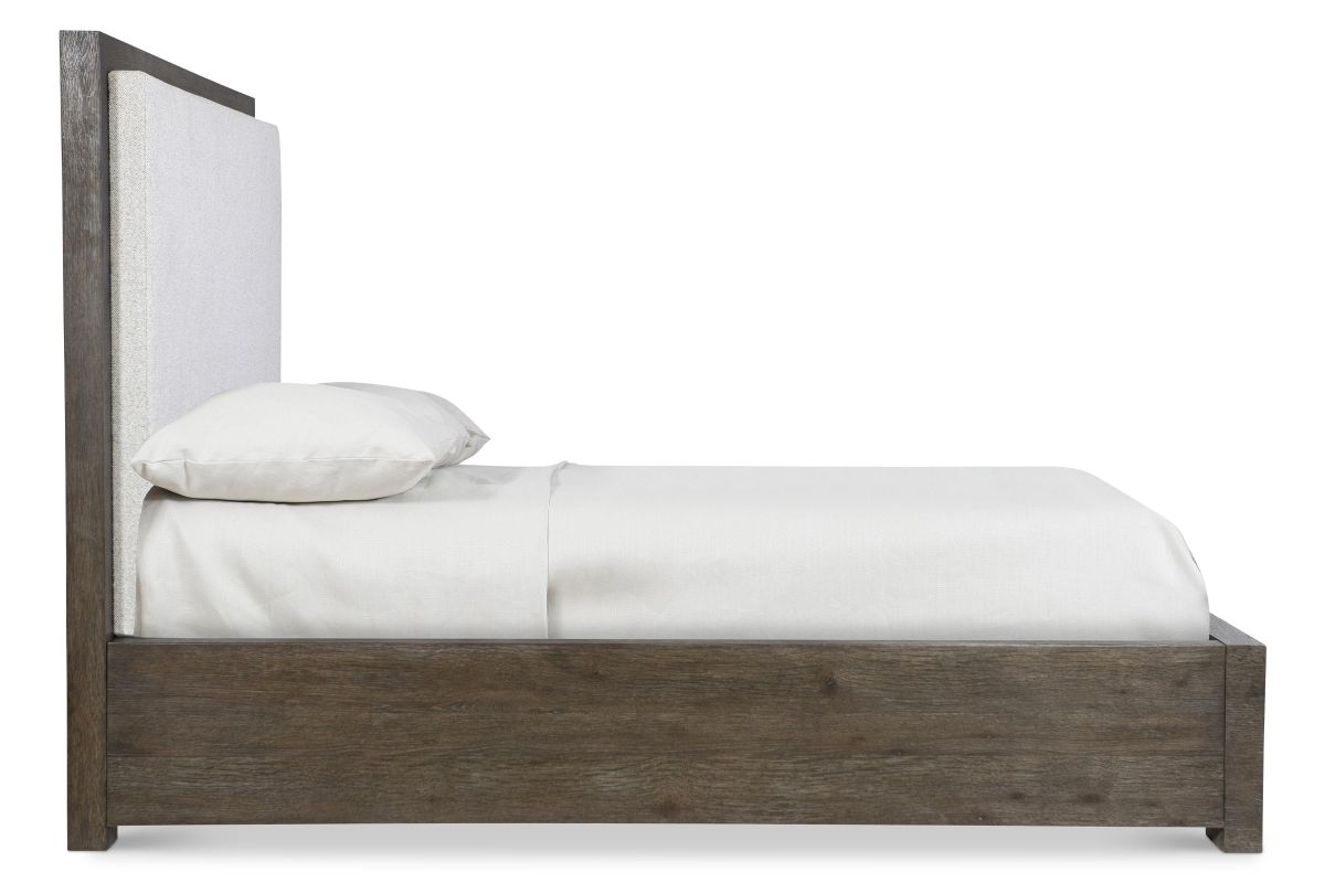 - Headboard has inset upholstered panel framed in wire-brushed oak in Cassel finish