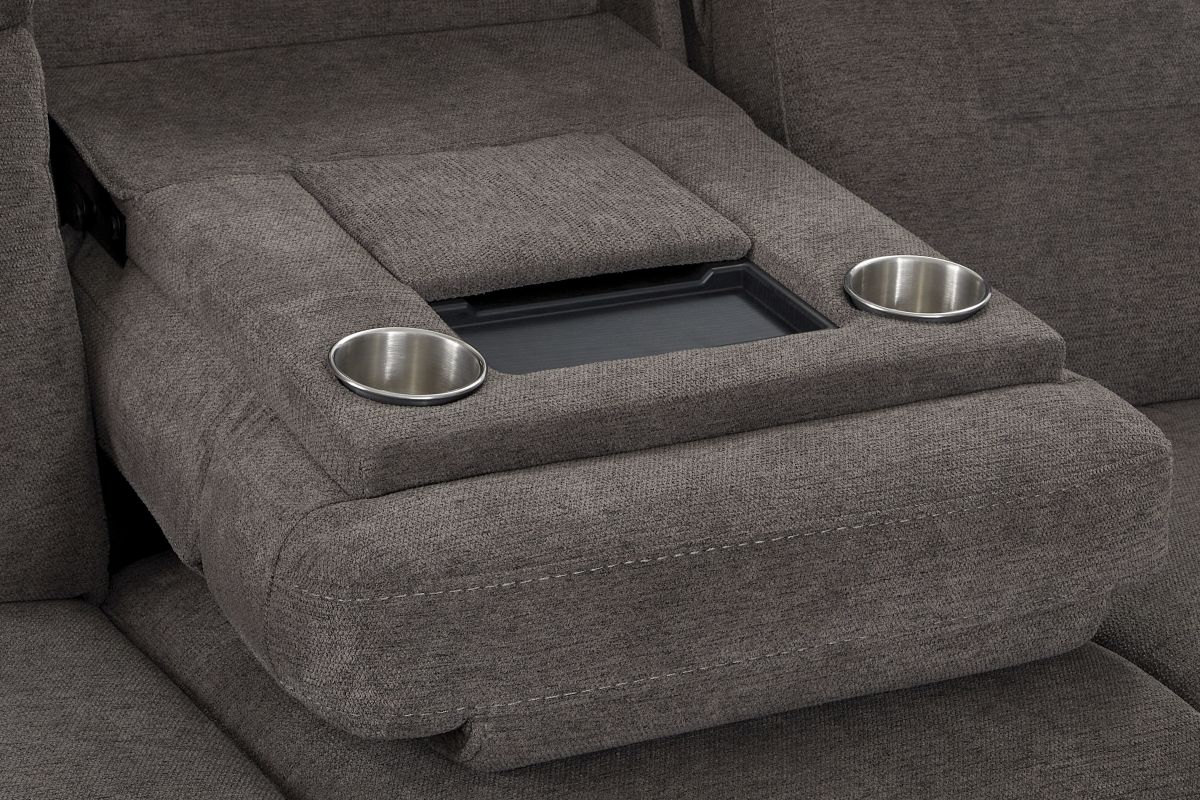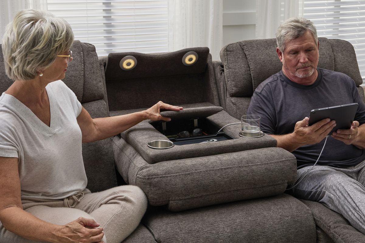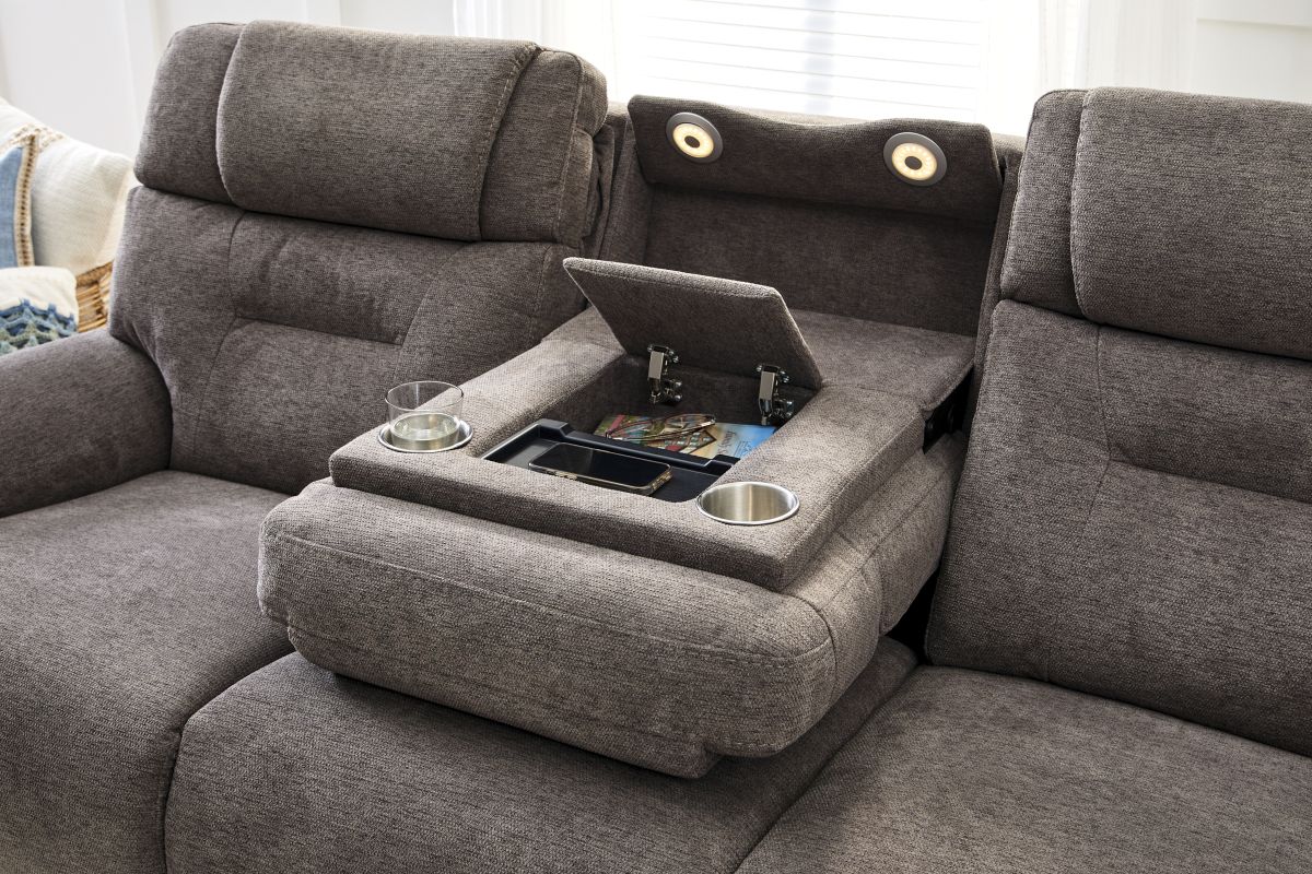 - Center, drop-down back cushion contains touch lighting, two cupholders, a wireless charging tray, and USB-A and USB-C ports