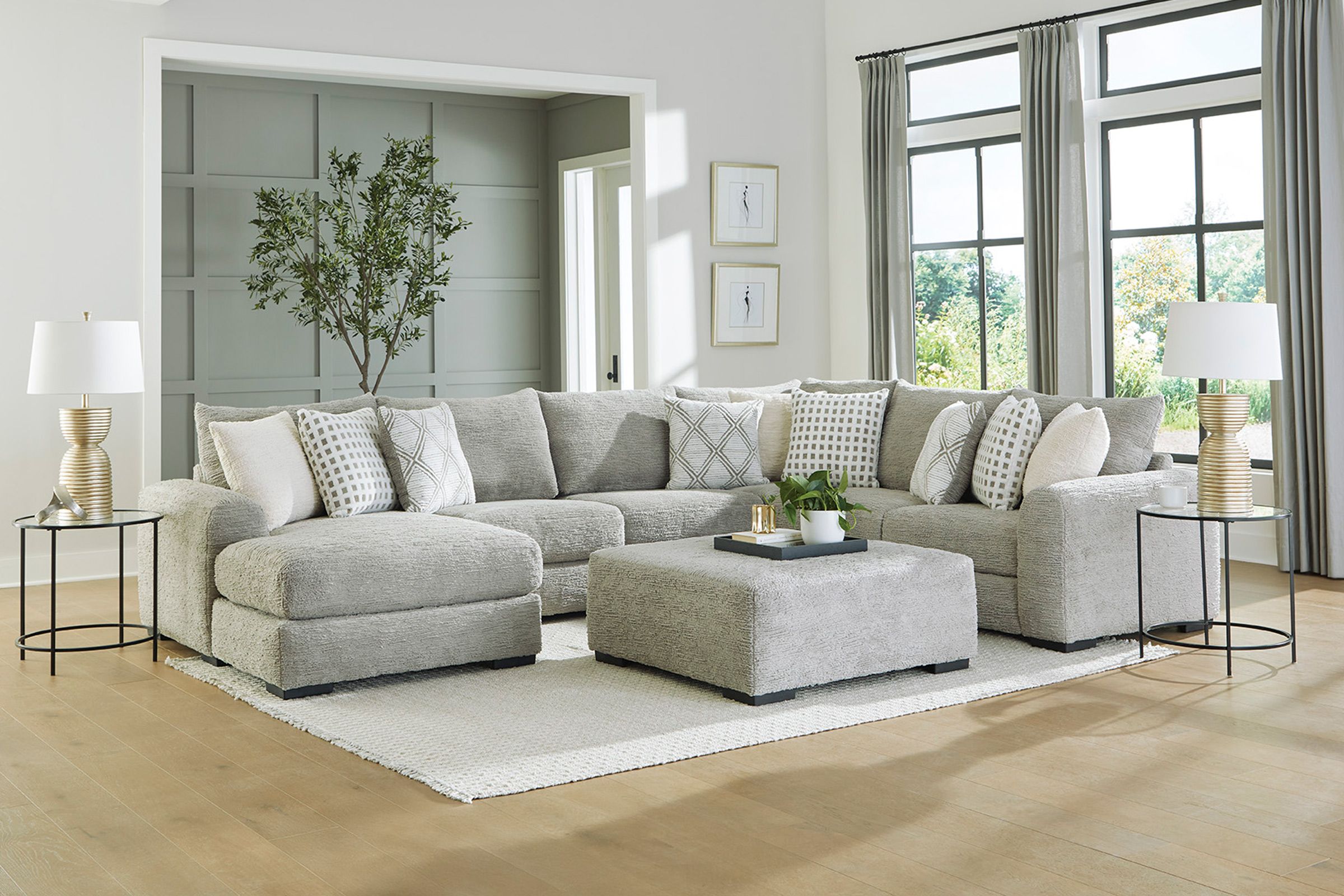 Transform your living room into a modern retreat with the Haven Dove 4-Piece Sectional with Right-Arm Facing Chaise. Wrapped in luxuriously soft chenille fabric, the fresh dove hue brightens your space while delivering an airy, inviting vibe.